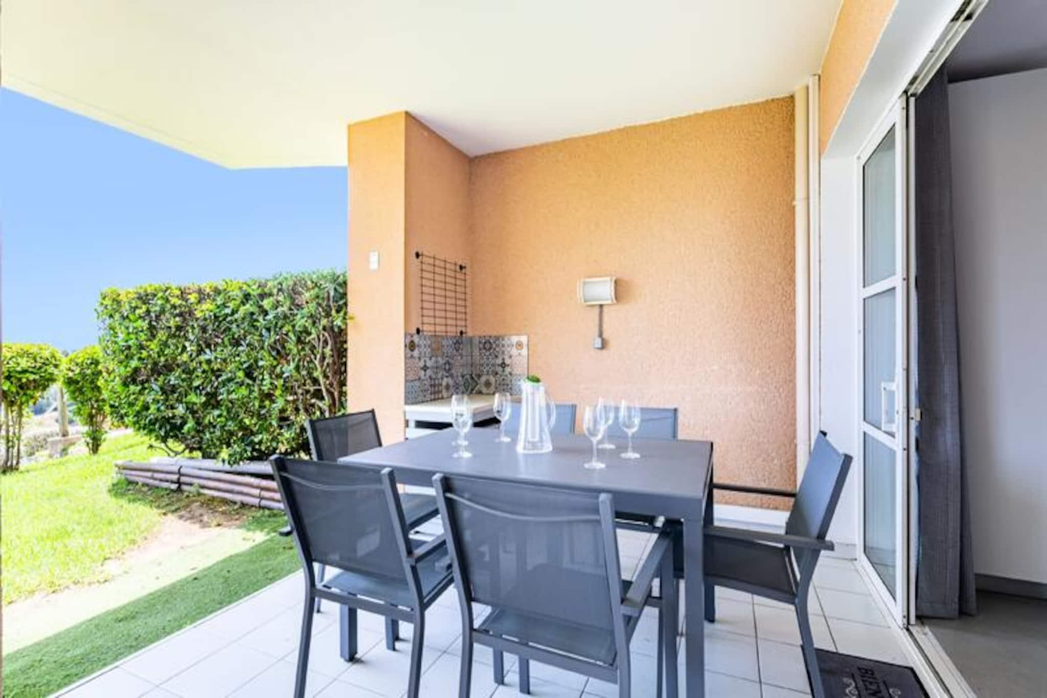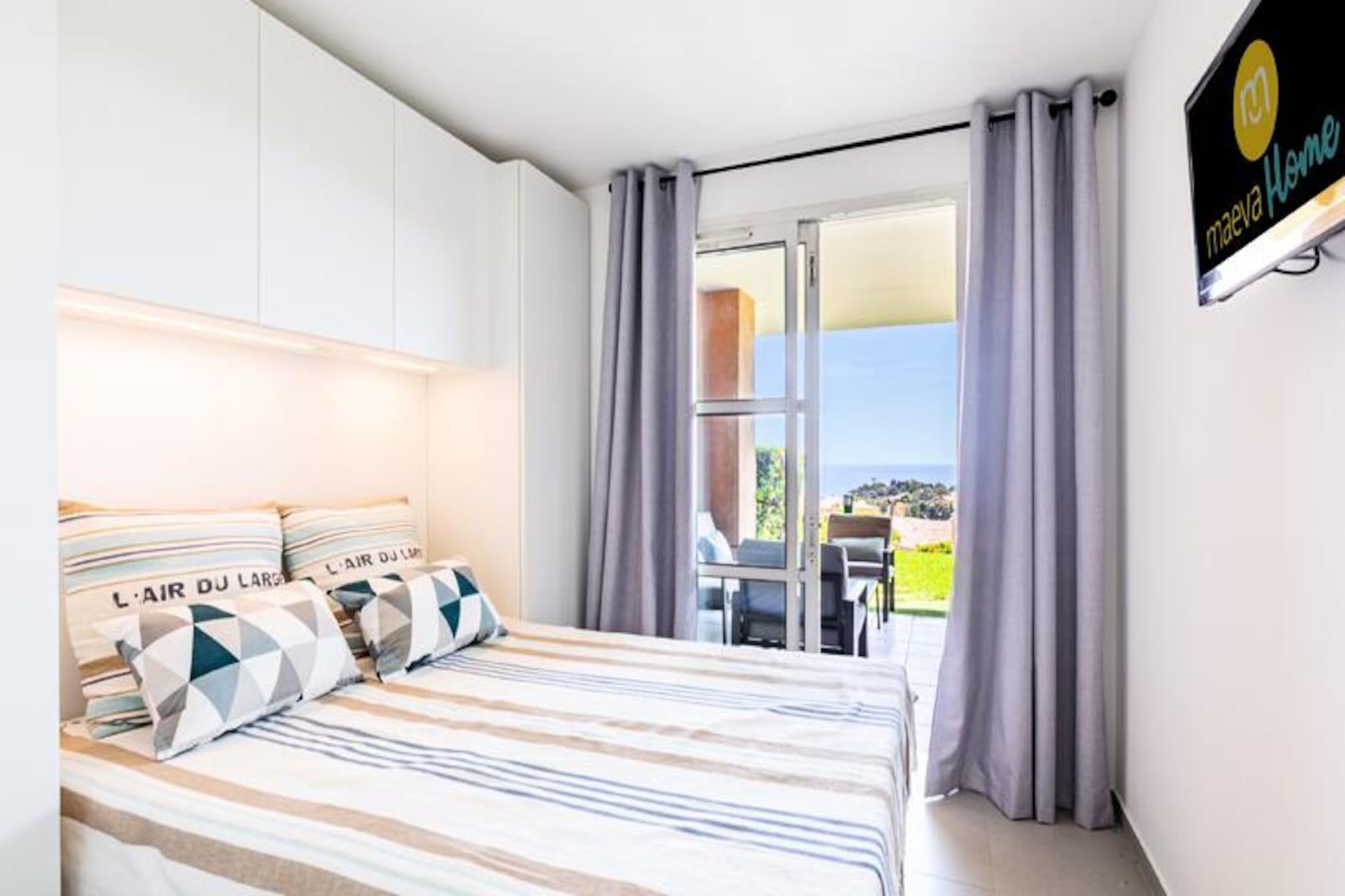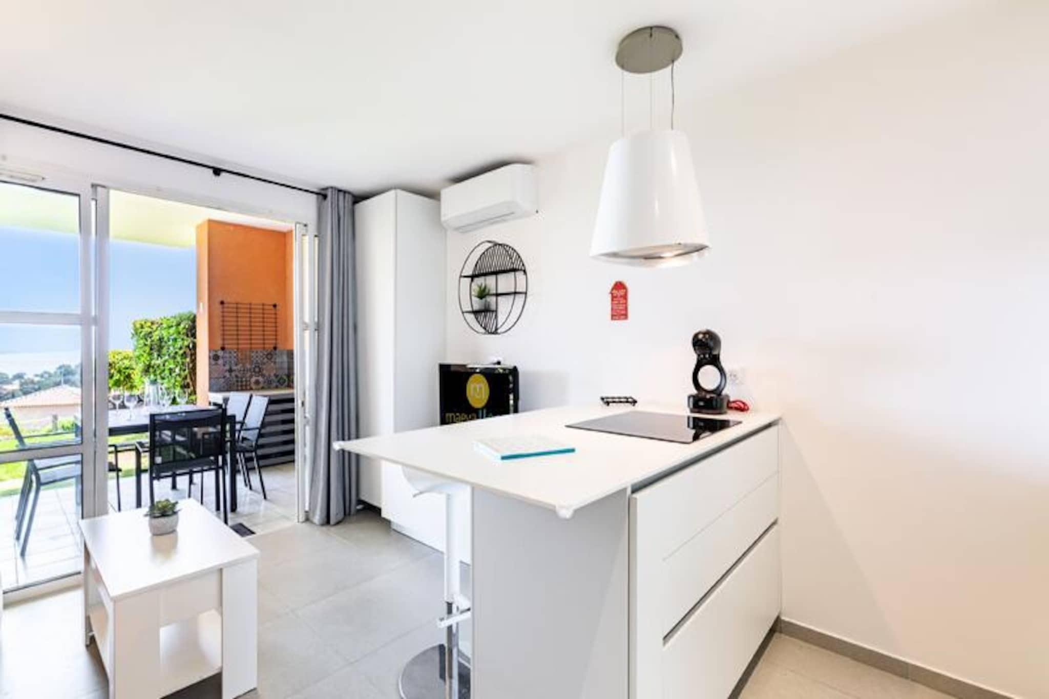 Denne lejlighed på 30 m² tilbyder et behageligt ophold for op til 4 gæster. Den har et soveværelse med en dobbeltseng og en stue med en sovesofa, der komfortabelt har plads til 4. Lejligheden har også en privat have, en overdækket terrasse med havudsigt mod øst og en parkeringsplads. Kæledyr er tilladt, og ejendommen tilbyder en overdækket parkeringsplads. Gæster kan nyde adgang til forskellige faciliteter på stedet, herunder swimmingpools, afhængigt af deres valg af indkvartering. Beliggende kun 500 meter fra det nærmeste forretningsområde og under 100 meter fra forskellige aktiviteter, er denne lejlighed ideelt placeret. Stranden er mere end 500 meter væk, men en lille tog-service er tilgængelig for nem adgang. Med caféer, butikker og markeder inden for en kort gåtur har gæsterne alt, hvad de har brug for i nærheden. Uanset om det er at nyde en gåtur rundt i landsbyen eller slappe af ved stranden, er der noget for enhver smag. Lejligheden har et køkken i amerikansk stil med et spisebord og fire stole. Badeværelset har bruser, elektrisk håndklædetørrer og opbevaringsplads for ekstra bekvemmelighed. Stuen er udstyret med et sofabord, og lejligheden giver også gratis strømudtag nær spejlet til dine enheder.