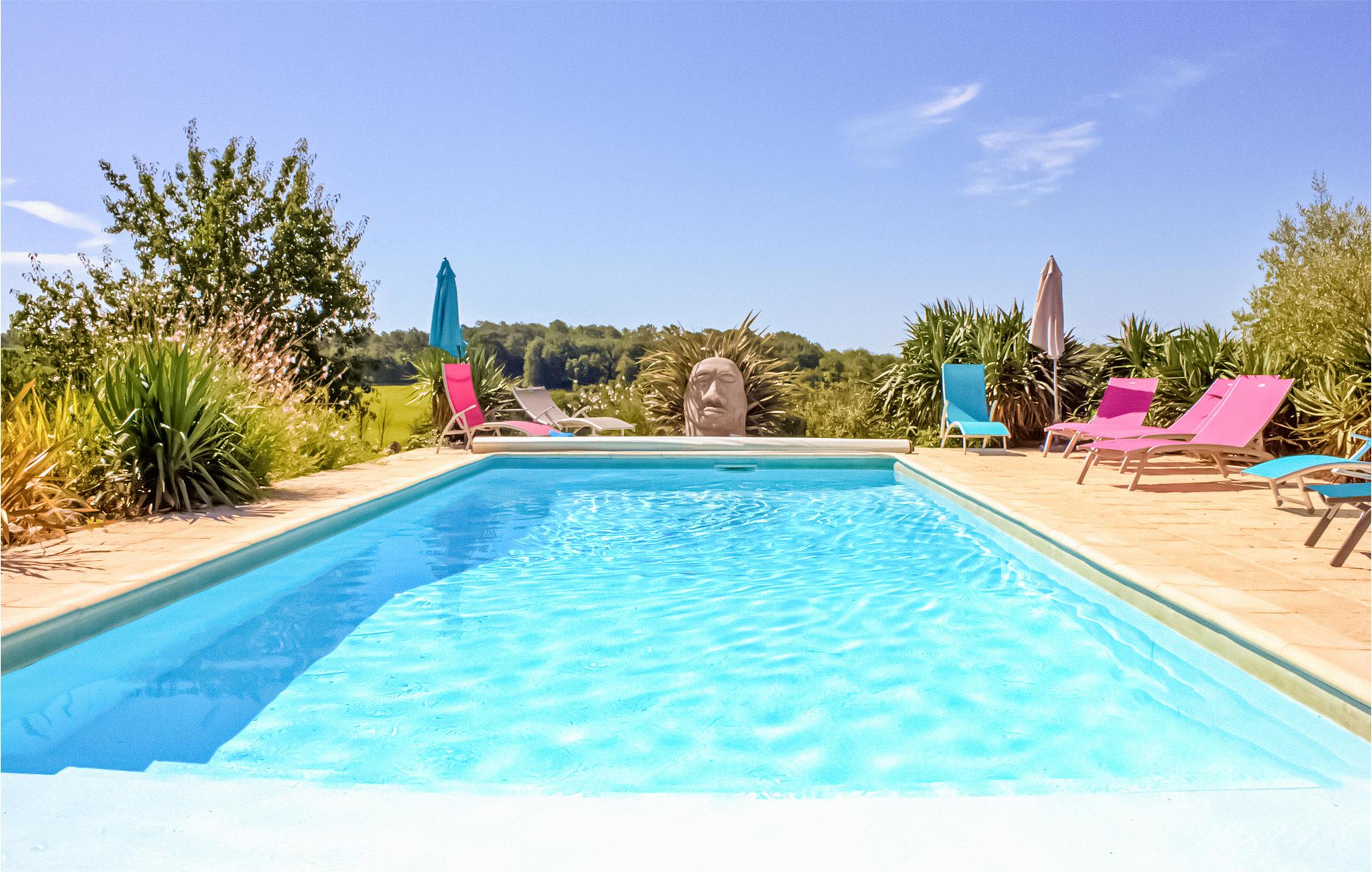 Charmerende stenhus med fælles udendørspool i landlige omgivelser.