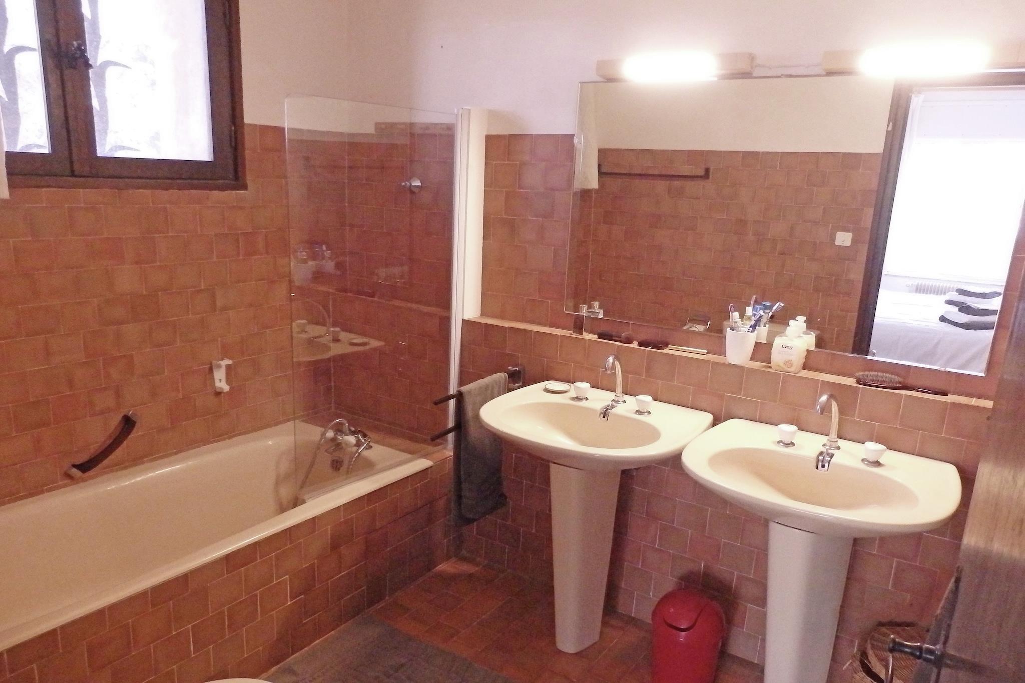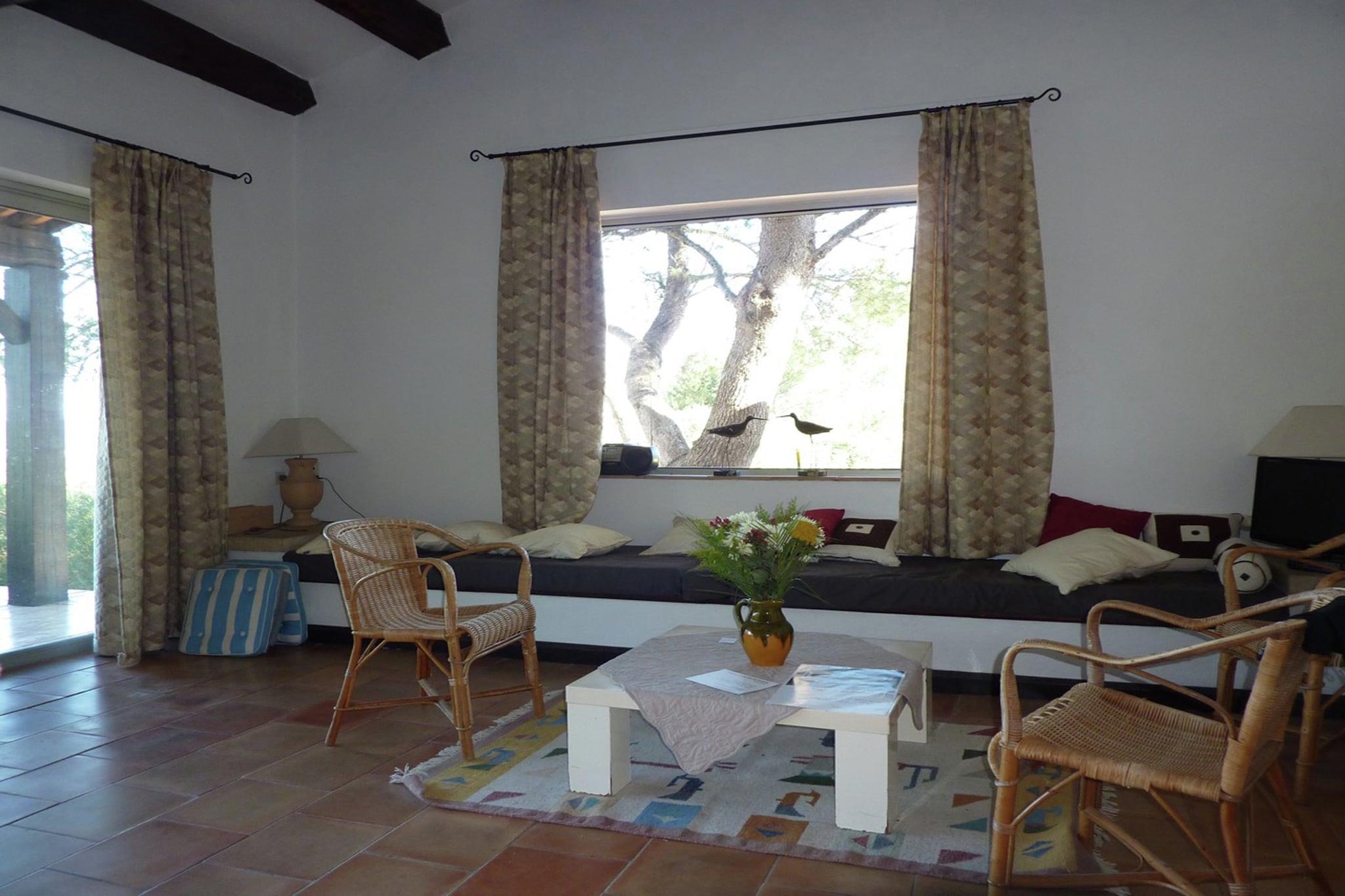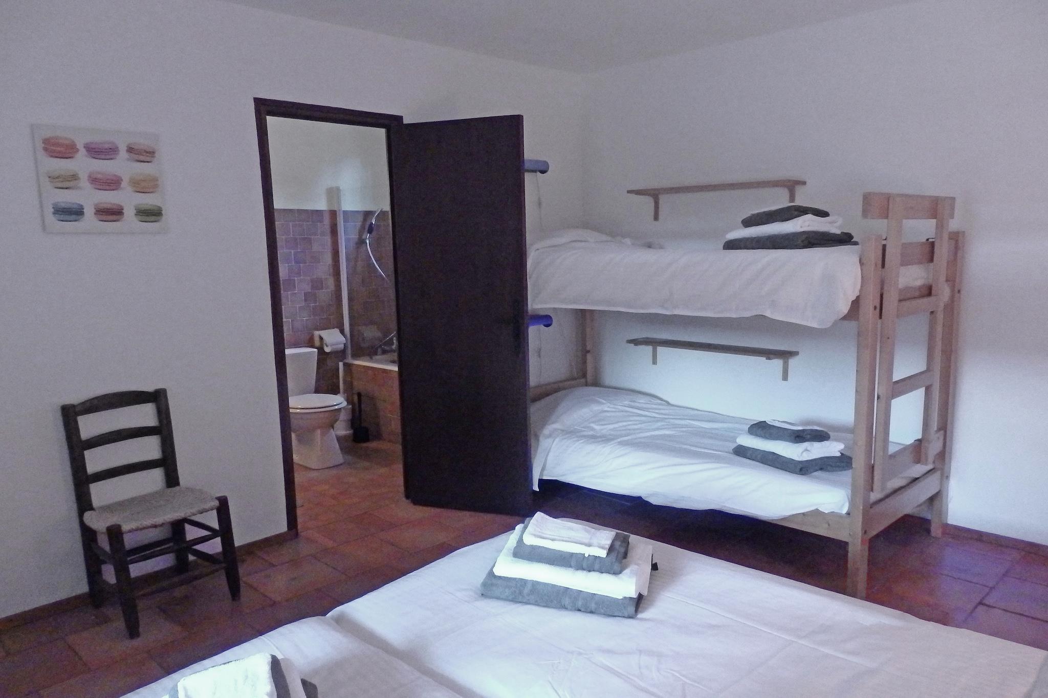 Stueetage: (Stue(Fjernsyn(fladskærm, parabol), sofahjørne), spisestue(pejs, grill), Køkken(elkedel, brødrister, komfur(gas), emhætte, kaffemaskine(kaffetragt, kaffepude), ovn, mikrobølgeovn, opvaskemaskine , køle-fryseskab), soveværelse(fælles indgang, adgang udefra)(2x enkeltseng(90 x 200 cm)), soveværelse(fælles indgang, adgang udefra)(dobbeltseng(160 x 200 cm)), Soveværelse med badeværelse(fælles indgang, adgang udefra)(dobbeltseng(160 x 200 cm), badekar med bruser, håndvask, toilet), Soveværelse med badeværelse(fælles indgang, adgang udefra)(dobbeltseng(160 x 200 cm), køjeseng(90 x 200 cm), badekar med bruser, håndvask, toilet), badeværelse(badekar med bruser, 2x håndvask, toilet), toilet, bryggers(køleskab, tørretumbler, vaskemaskine, strygebræt, strygejern), havedøre, varme) carport, terrasse(privat, overdækket, 50 m2), terrasse(privat, 64 m2), have(privat, delvist indhegnet, 10000 m2), havemøbler, solstole, parkering, liggestole, swimmingpool(privat, indhegnet, 20 x 6 m., opened from 1/2 May upto and including Sep), petanquebane, hyggespil, Pladegrill