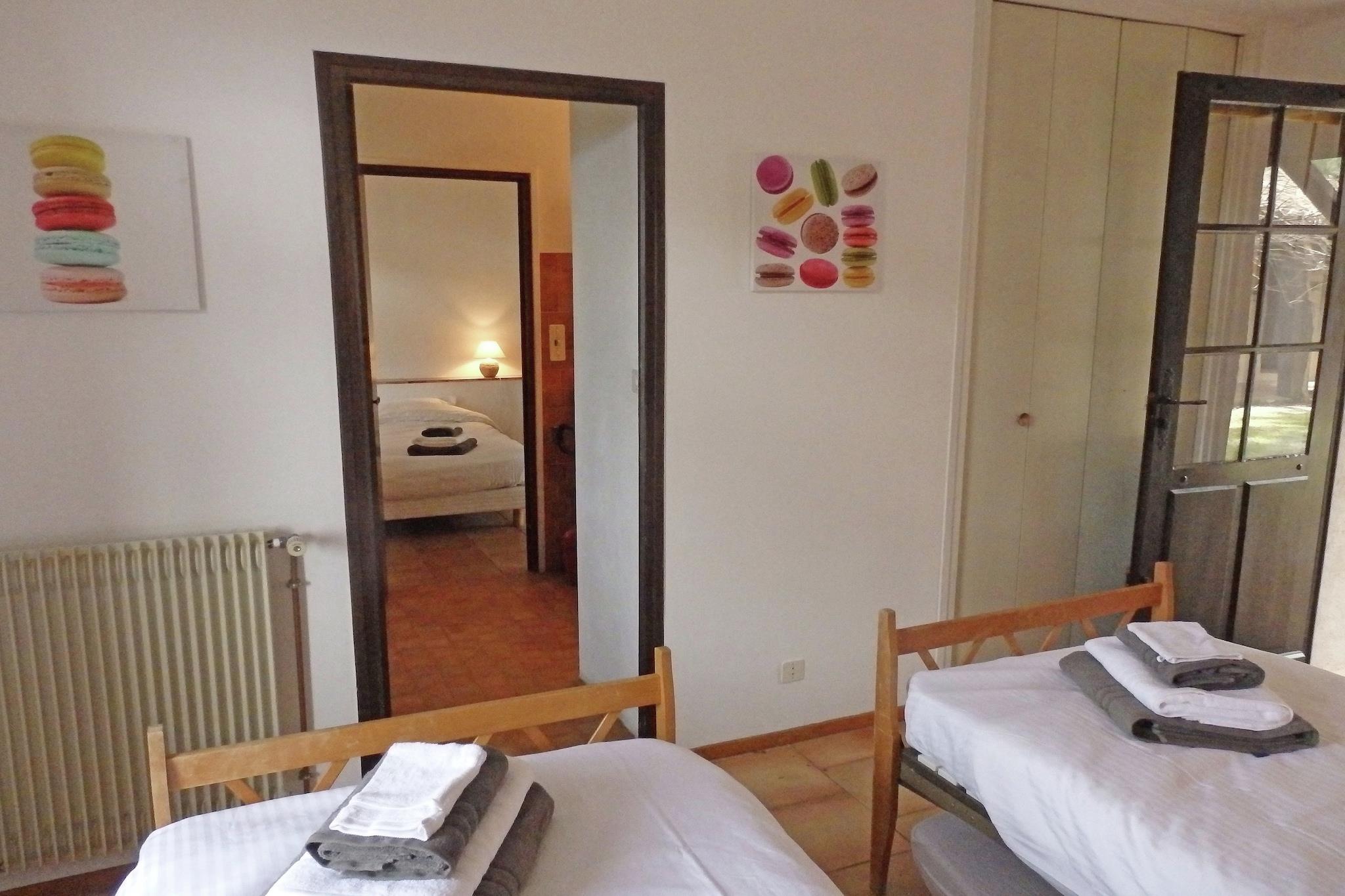 Gemt i en fredelig fyrreskov i udkanten af Saint-Siffret, tilbyder denne arkitekttegnede villa panoramaudsigt over dalen og en privat swimmingpool - perfekt til en afslappende flugt med familie eller venner. Det rummelige hjem har flere terrasser, en stor lukket have og direkte adgang til naturstier. Hvert soveværelse åbner til et overdækket udendørsområde og inkluderer et en-suite badeværelse, hvilket sikrer komfort og privatliv under hele dit ophold. Kun få minutter fra middelalderbyen Uzès er villaen ideelt beliggende nær topattraktioner som Pont du Gard, Lac de la Bouscarasse og Haribo Candy Museum. Udforsk den barske Camargue, cykel naturskønne stier, eller besøg Middelhavets strande kun 90 minutter væk. Det omkringliggende område byder også på mountainbiking, fiskeri og charmerende landsbyer som Nîmes og Arles inden for rækkevidde. Indvendigt byder villaen på en lys stue, et fuldt udstyret køkken og køjesenge til børn. WiFi er tilgængeligt, og ejendommen inkluderer parkering til to biler. Uanset om du slapper af ved poolen eller opdager Gard-regionens skatte, lover dette rolige tilflugtssted en uforglemmelig ferie.