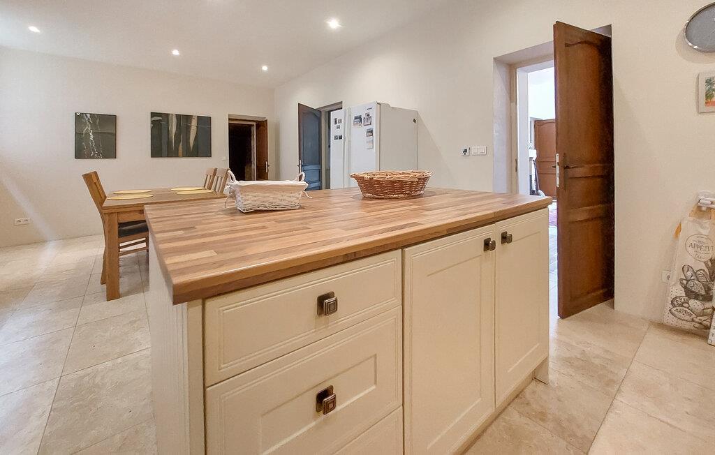 Træd ind i det store interiør og slap af i den elegante stue med pejs, komfortable sofaer og stemningsfuld belysning. Højt til loftet og dekorative elementer understreger husets særlige karakter. Brug bogkrogen eller tilbring aftenerne sammen med at se tv. Lav mad i det store køkken med køkkenø og rigelig bordplads. Den tilstødende spiseplads tilbyder rigelig plads til fælles måltider.