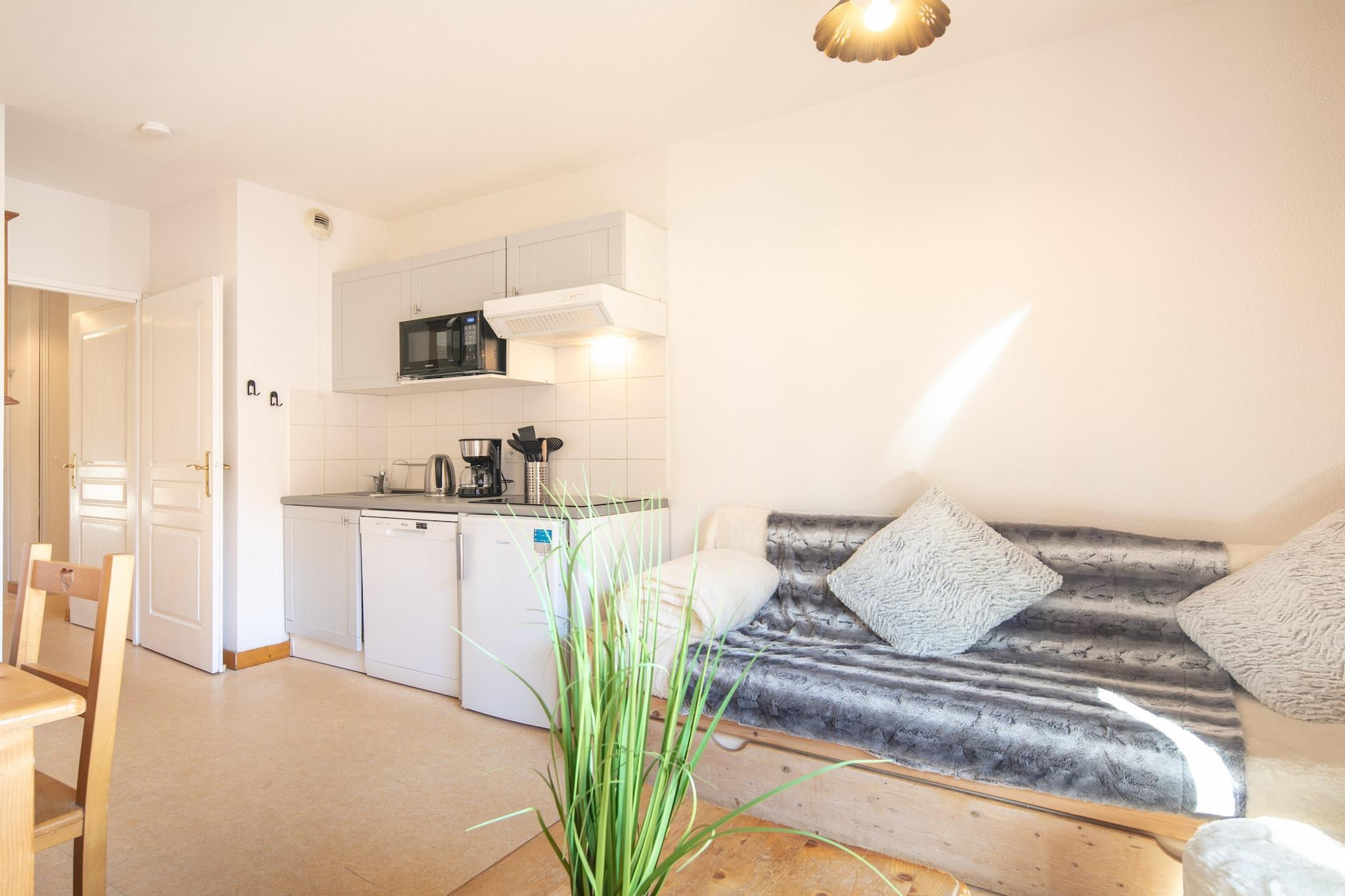 Denne hyggelige 40 m² store lejlighed i Saint-Sorlin-d'Arves tilbyder et lyst og indbydende tilflugtssted for op til 6 gæster, ideel til familier eller små grupper. Med 2 komfortable soveværelser, fantastisk udsigt over bjergene og fredelige omgivelser i en familievenlig zone, er det den perfekte base for alpine eventyr. Beliggende kun 200 meter fra skisportsstedet og byens centrum giver lejligheden nem adgang til butikker, caféer, restauranter og et supermarked, hvilket gør det bekvemt for både vintersport og hverdagsting. Efter en dag med skiløb eller vandreture kan gæsterne slappe af i den opvarmede fælles swimmingpool eller slappe af på den private balkon. Lejligheden har elvarme, udendørs parkering i samme bygning og et veludstyret åbent køkken med glaskeramisk kogeplade, mikroovn, ovn, køleskab, fryser, opvaskemaskine og alle nødvendige redskaber og apparater, herunder en kaffemaskine, brødrister og elkedel. Kæledyr er ikke tilladt, hvilket sikrer et rent og allergifrit miljø for alle. Uanset om du er her for eventyr eller afslapning, tilbyder denne lejlighed en behagelig og velforbundet alpine flugt.