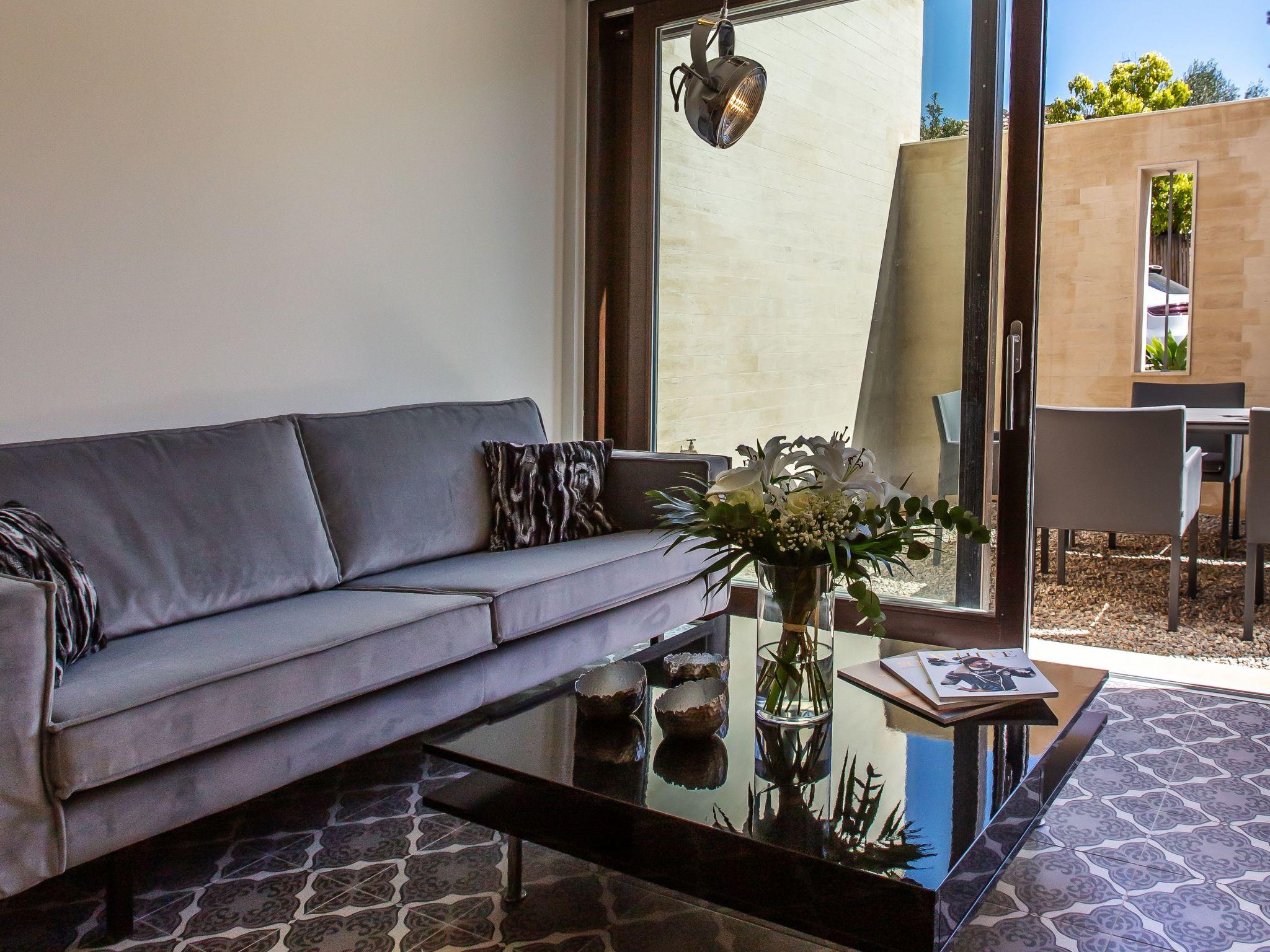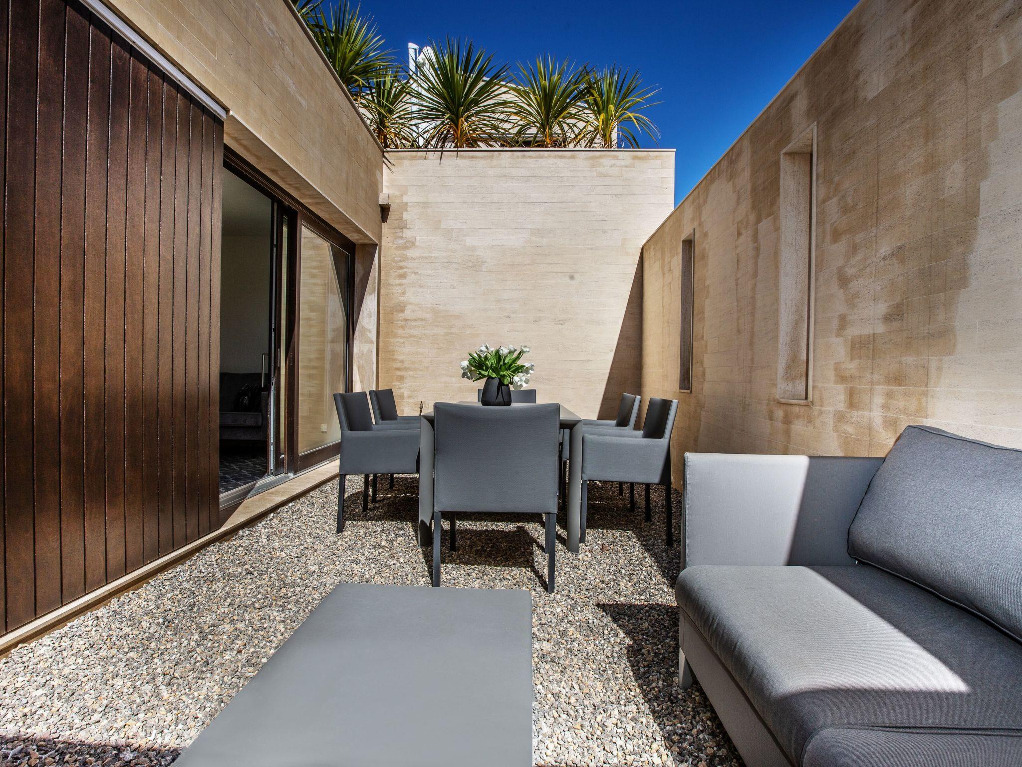 The flat is on the ground floor and sleeps 2 people. The living area includes the lounge, dining area and fully-equipped open-plan kitchen, and opens onto an outdoor terrace with dining table for 6. The flat also has a bedroom with a queen-size bed and a bathroom with a walk-in shower, washbasin, WC and washing machine/dryer.