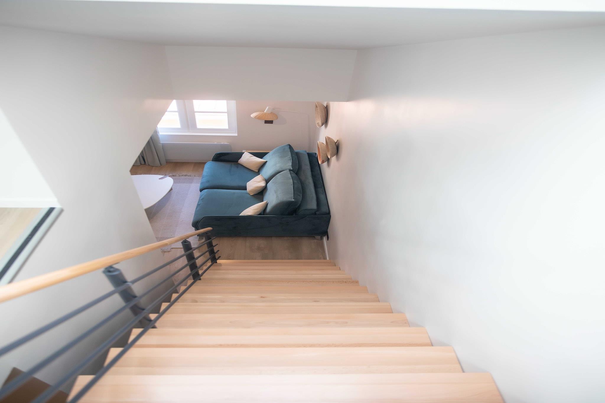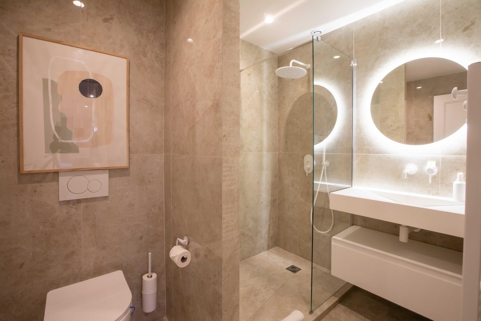 On the 2nd floor: (Kitchen(stove, electric kettle, toaster, coffee machine, microwave, fridge, washing machine, dishes and cutlery), Living/bed room(Internet Access DSL, double sofa bed, TV, air conditioning), bedroom(Bed Linen, Wardrobe, double bed), bedroom(double bed), bathroom(shower, washbasin, toilet, Towels/Sheets (Incl.), shampoo), bathroom(shower, washbasin, toilet, Towels/Sheets (Incl.), shampoo)) Hot Water, First Aid, cot, heating, iron, hairdryer, Essentials