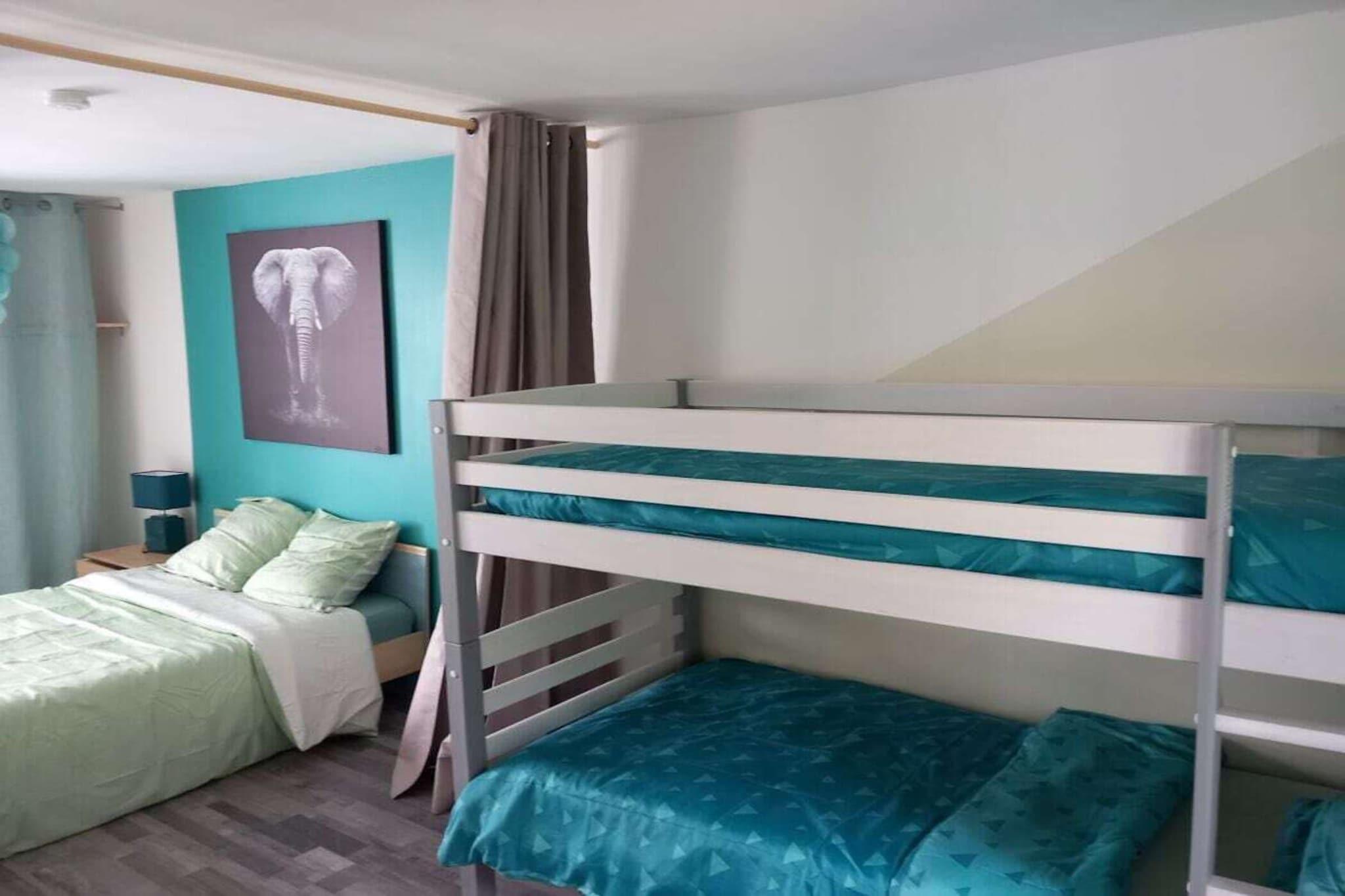 Nous kan akkumulere nous disposons de 3 kamre. 6 og 7 voksne plus 3 børn for børnenes liv. Der er plads til et fuldt udstyret køkken med vaskemaskine. Værelserne har separate toiletter og tv-udstyr. Og Wi-Fi. Linge de maison et linge de lit fournis .