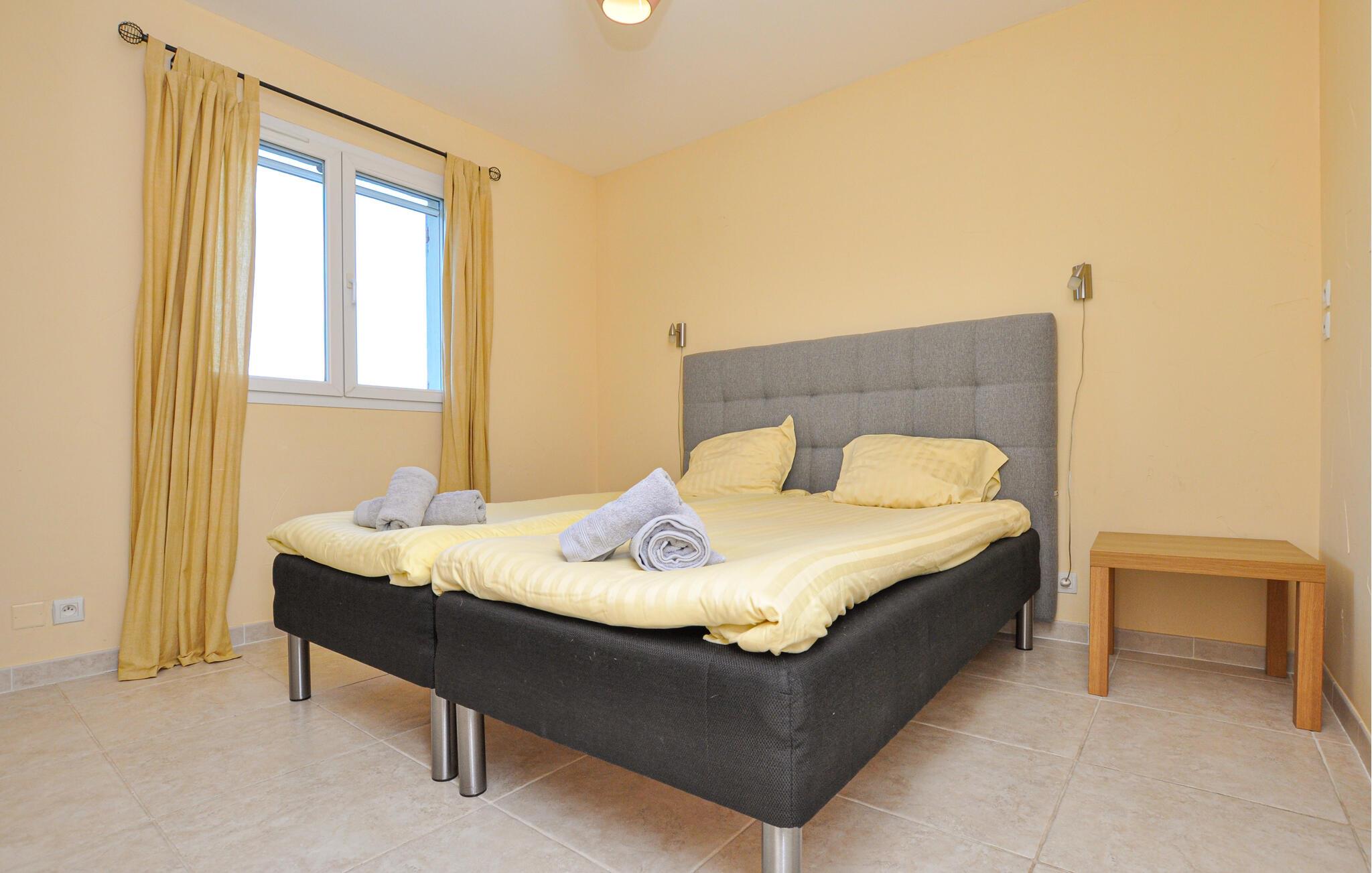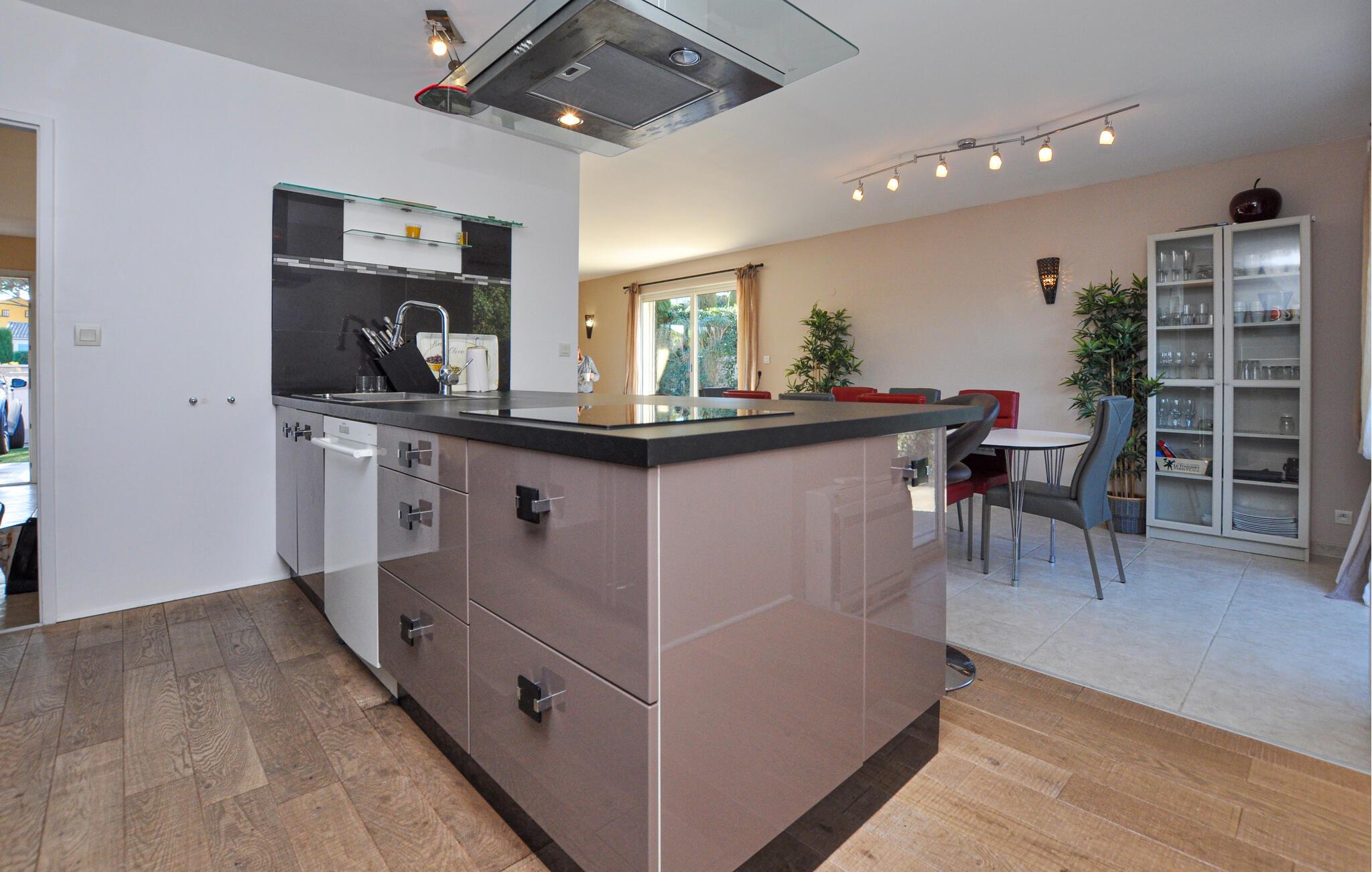 Kom ind og føl jer hjemme i den elegante, åbne atmosfære i dette feriehus. Lav mad sammen i det moderne, fuldt udstyrede køkken og samles til omgængelige måltider i den indbydende spiseplads. Nyd afslappende aftener med et glas vin eller en god bog i den stilfulde stue