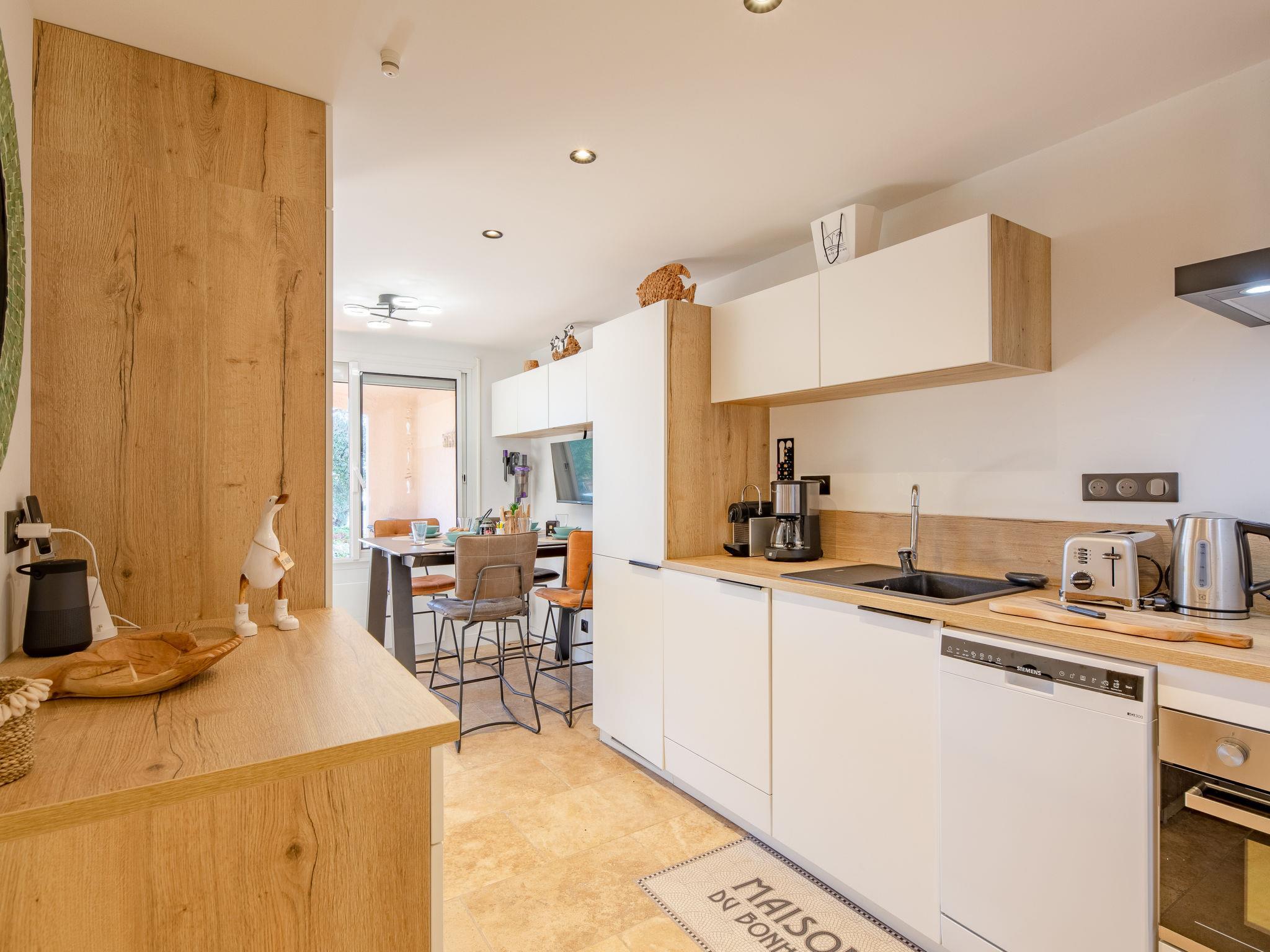 3-room apartment 33 m2, on the ground floor. Beautiful and modern furnishings: living/dining room with TV (flat screen), air conditioning. Exit to the terrace. 1 room with 1 french bed (140 cm, length 190 cm). Small sleeping alcove with 1 x 2 bunk beds (80 cm, length 190 cm). Kitchenette (2 hot plates, oven, dishwasher, toaster, kettle, microwave, electric coffee machine). Shower, sep. WC. Electric heating. Terrace 20 m2, east facing position. Terrace furniture. Beautiful view of the sea. Facilities: washing machine. Internet (WiFi, free). Parking. Please note: suitable for families. Non-smokers only. Smoke alarm. Offer by a private individual according to Art. 155, IV of CGI. 83115005081WF