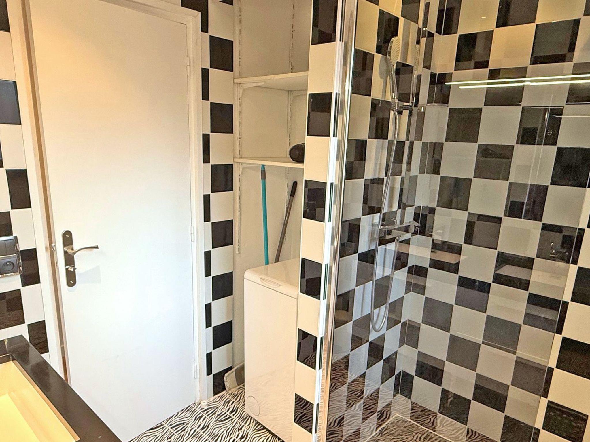- Bathroom with walk-in shower, vanity unit, washing machine and hairdryer