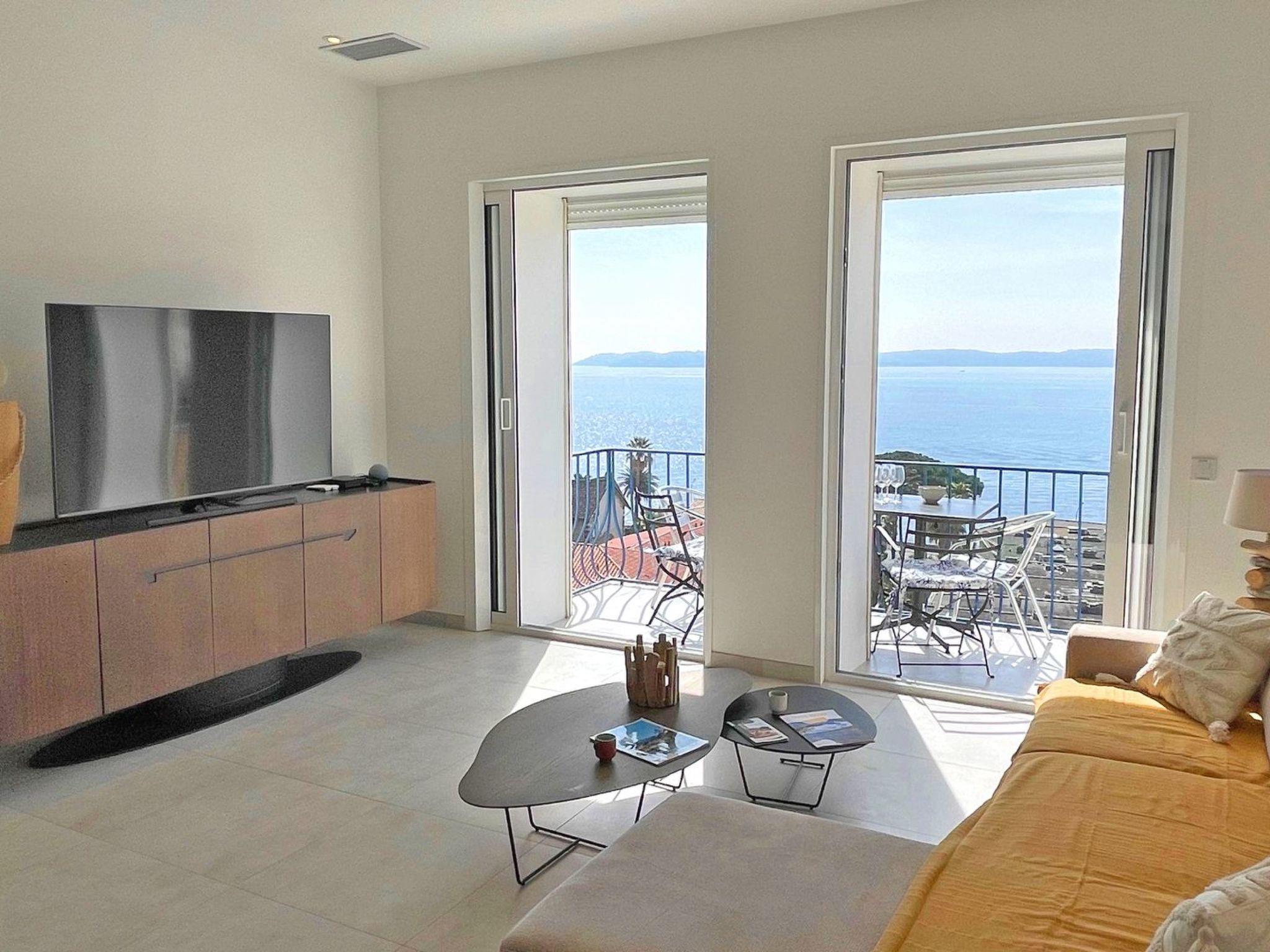 - Air-conditioned living room with sitting area: sofa bed (1 person), television, access to terrace and open-plan kitchen: fridge, freezer, oven, microwave, Nespresso coffee machine, dishwasher, kettle, toaster, crockery and cutlery, table and chairs for 5 guests.