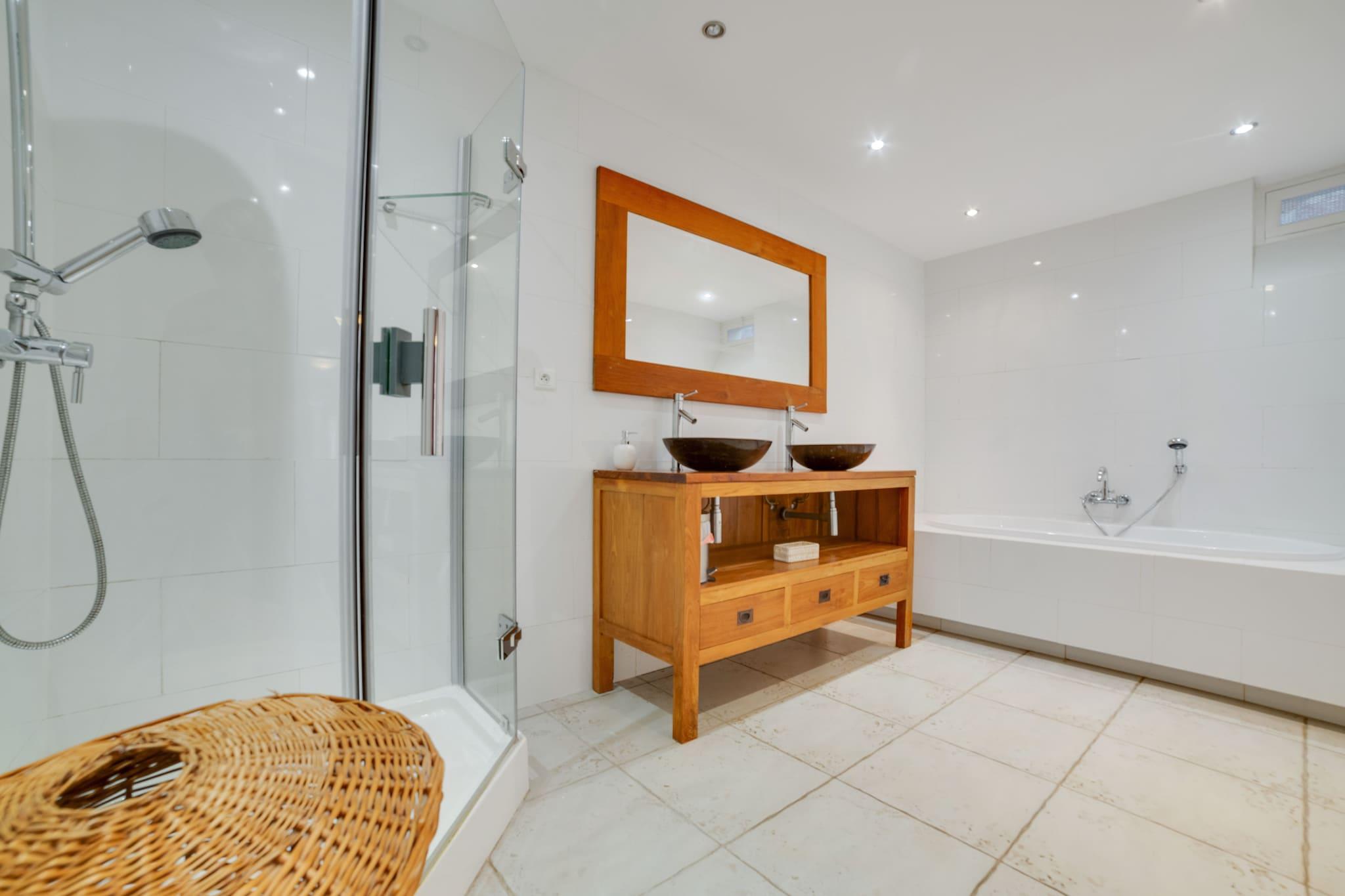 Stueetage: (Stue(Fjernsyn(Hollandske TV-kanaler, Internationale TV-kanaler), spisebord, sofahjørne), åbent køkken(komfur(induktion), emhætte, ovn, mikrobølgeovn, opvaskemaskine , køleskab(+ ismaskine, amerikansk), fryser, vaskemaskine), Soveværelse med badeværelse(dobbeltseng, pejs, bruser, 2x håndvask, klimaanlæg), toilet) Kælderetage: (soveværelse(køjeseng, klimaanlæg), soveværelse(dobbeltseng), soveværelse(2x enkeltseng), badeværelse(bruser, 2x håndvask, toilet), badeværelse(badekar, bruser, 2x håndvask), toilet) udekøkken, bruser, terrasse(150 m2), terrasse(overdækket), have(> 1000 m2), havemøbler, grill, parkering, liggestole, swimmingpool(privat, 10 x 4 m.), barneseng, barnestol, barnestol