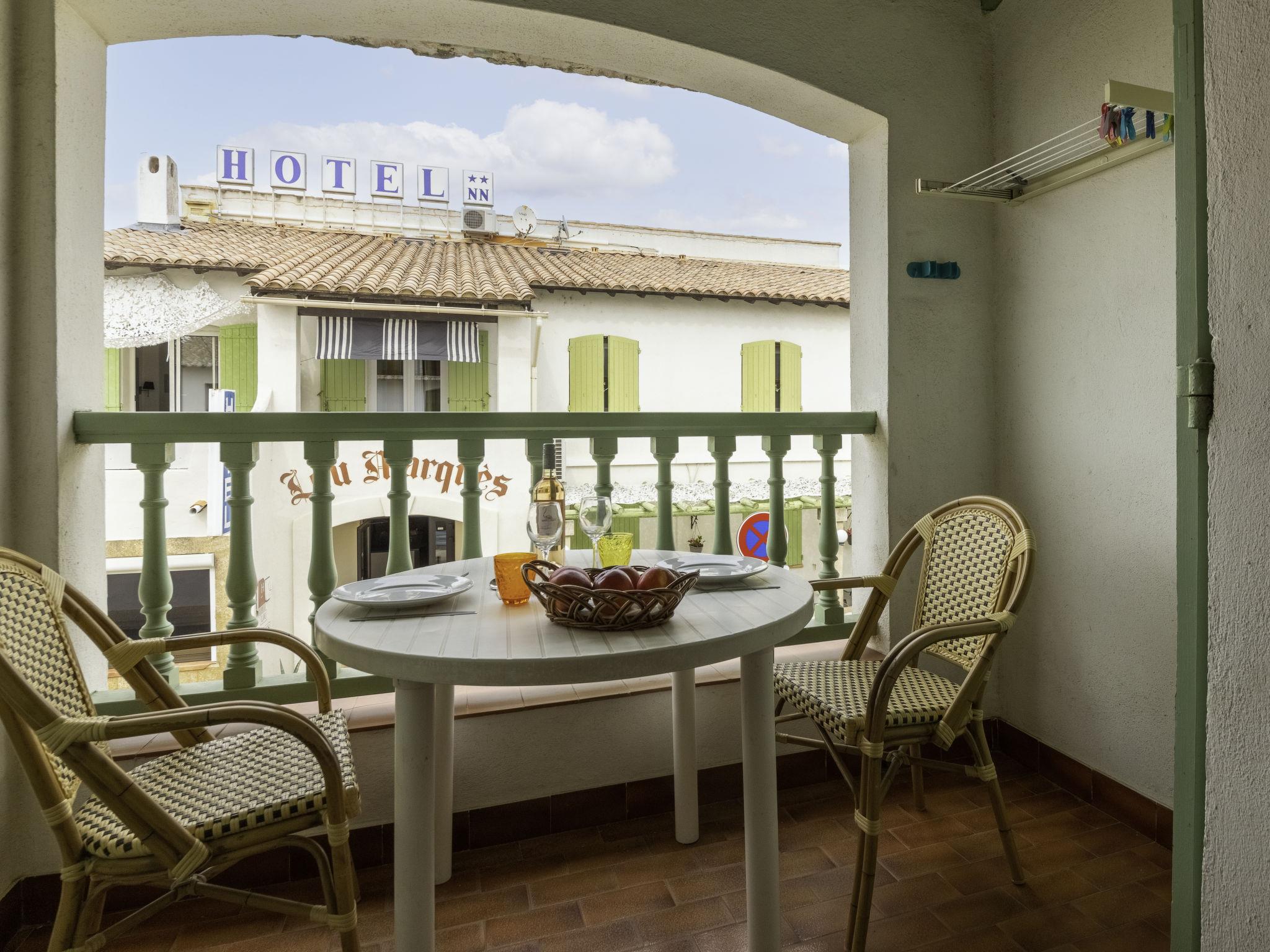 "Le Soleil Camarguais", 1-room apartment 30 m2 on 1st floor. Simple and practical furnishings: living/sleeping room with 1 french bed (140 cm, length 190 cm), dining table and TV. Exit to the balcony. Small kitchen (mini-oven, 2 ceramic glass hob hotplates, toaster, kettle, microwave, electric coffee machine). Shower/WC. Electric heating. Balcony. Balcony furniture. Facilities: iron. Internet (WiFi, free). Garage (extra). 13096000010HT