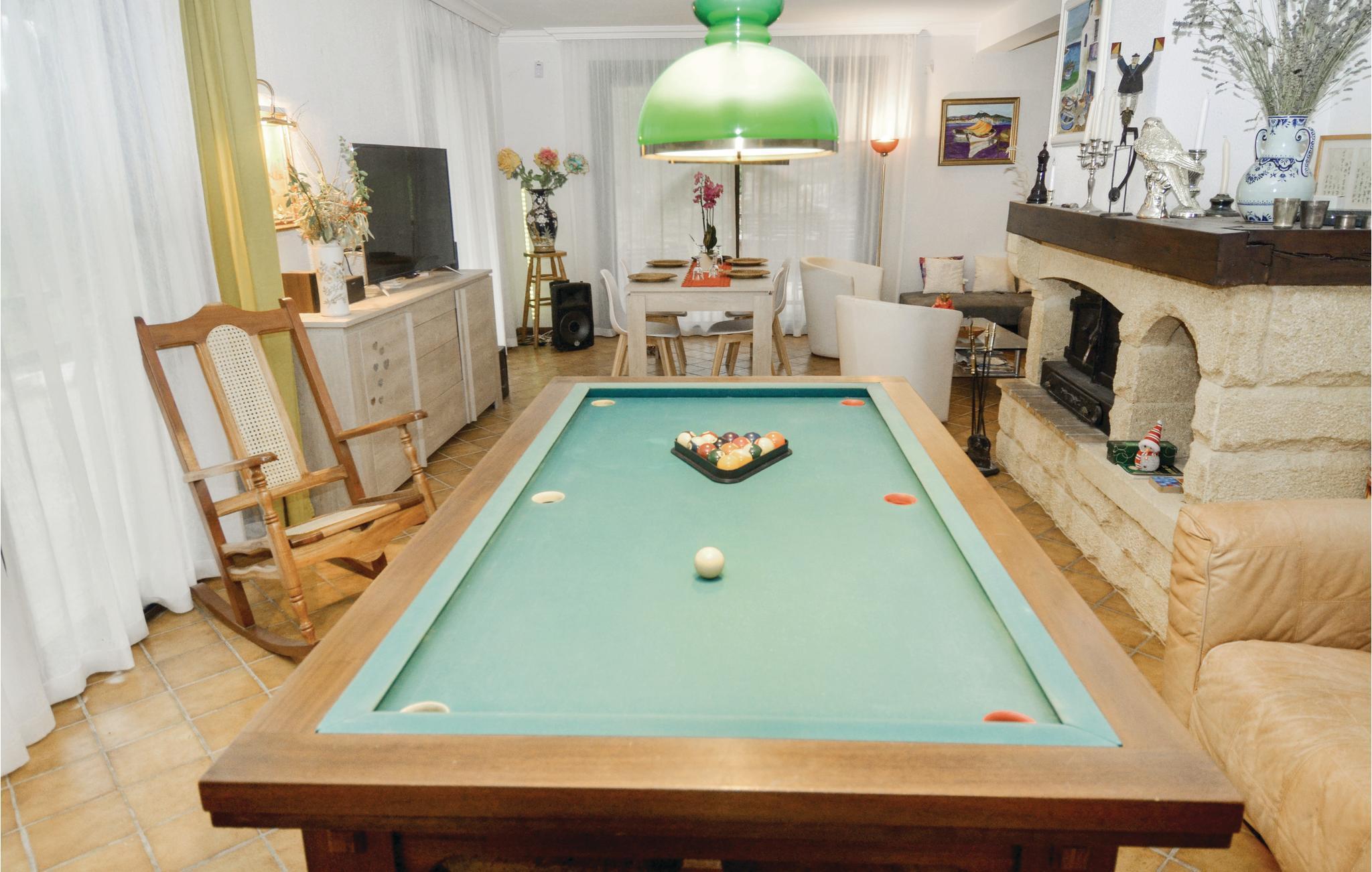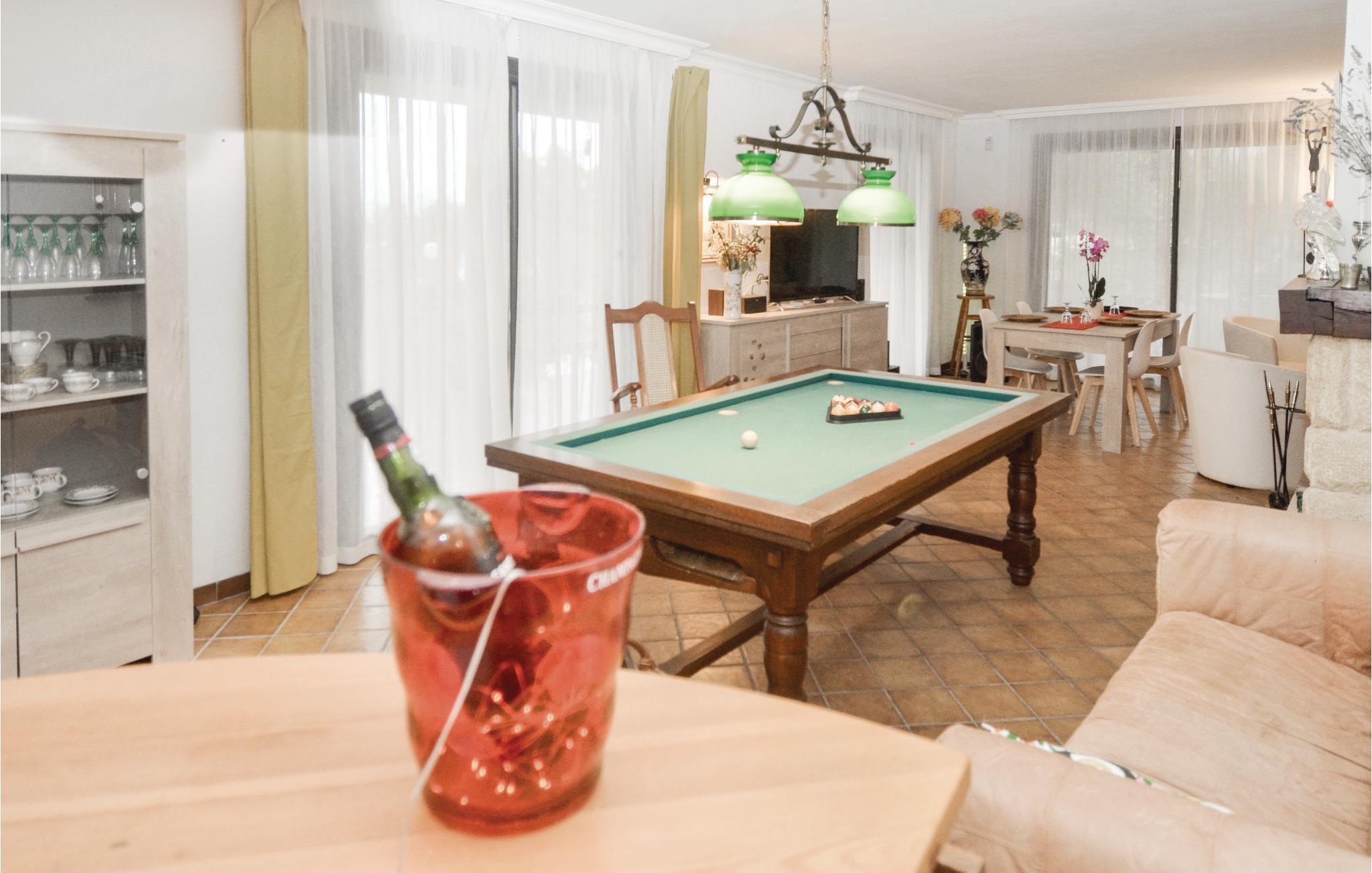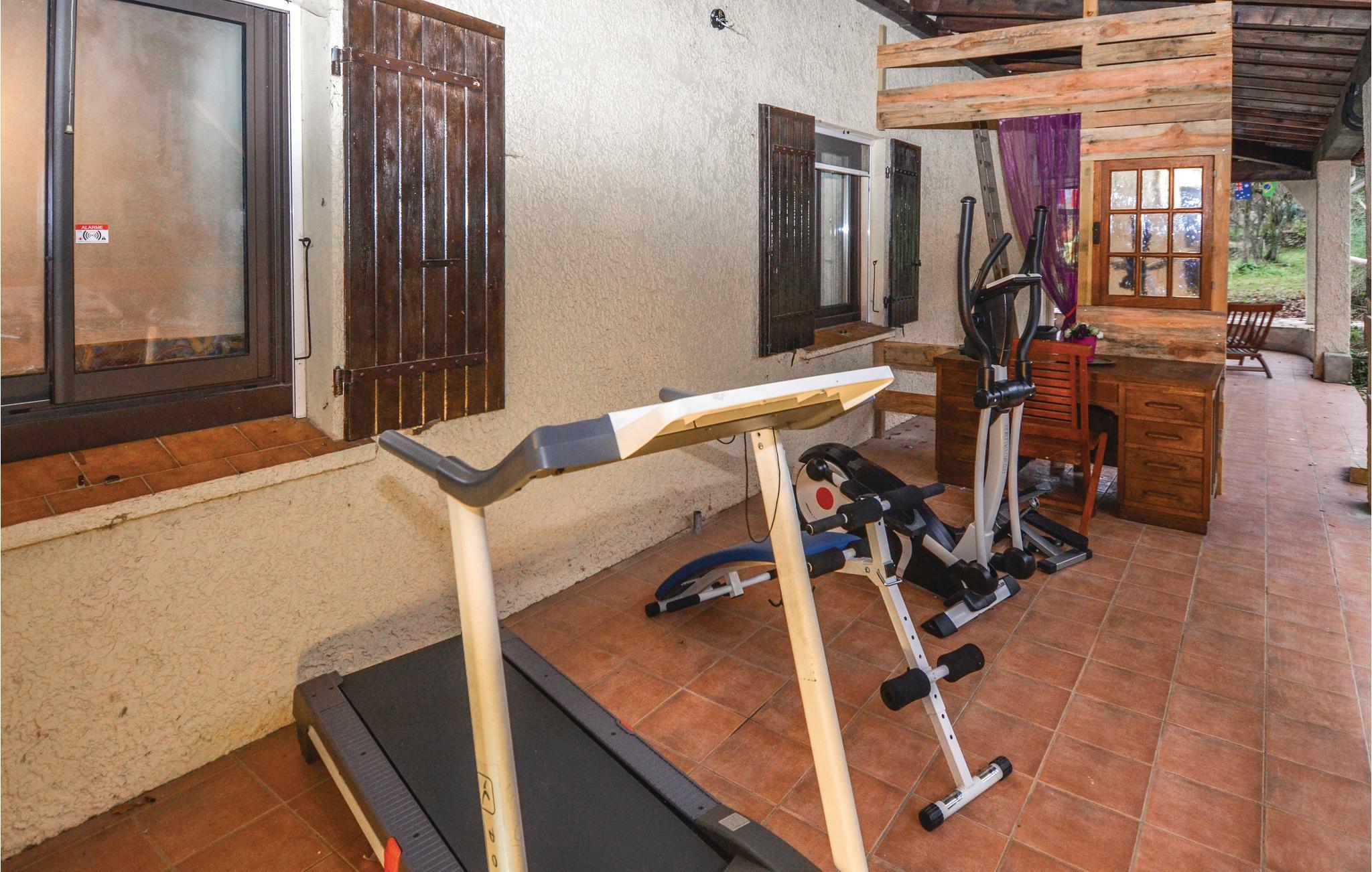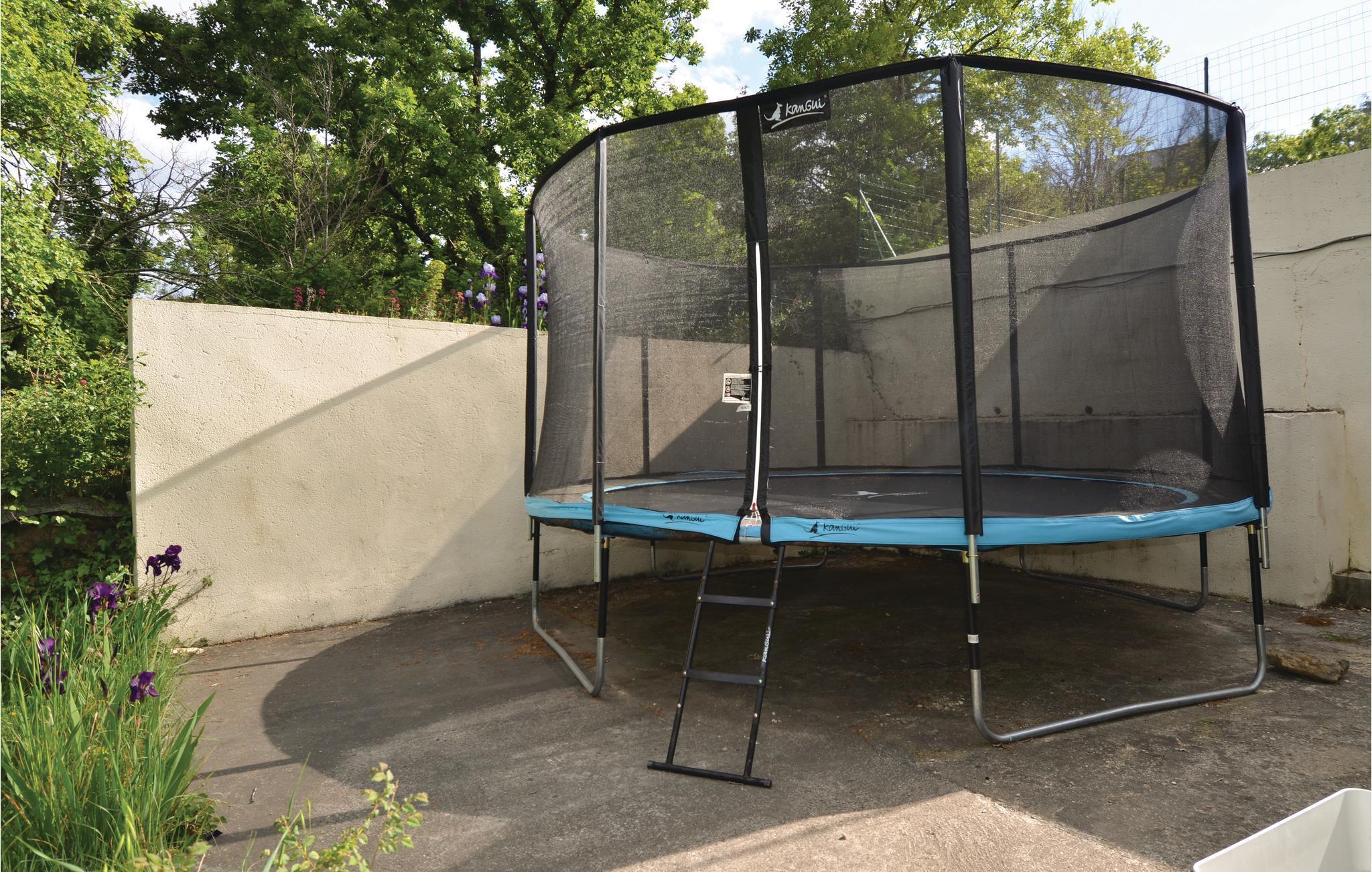 Feriehuset indeholder alt, hvad I har brug for til en skøn ferie: fitnessraum, hammam, udendørs spabad med kig til poolen, sauna til seks personer, et poolhus med grillsted samt en stor trampolin med sikkerhedsnet i haven. I overetagen findes et stort værelse (26 m²) der er udstyret med en dobbeltseng, tekøkken og badeværelse. Fra bl.a. fitnessrummet har I kig til poolen og haven. Nyd jeres feriemåltider på den store terrasse, der omkranser huset.