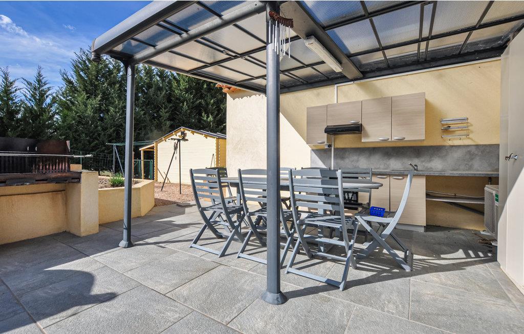 Ud over ??den flotte pool består haven af et udekøkken og en kulgrill, hvor I kan tilberede lækre grillretter. Læn jer tilbage i terrassens havemøbler og sæt hverdagen helt på pause.