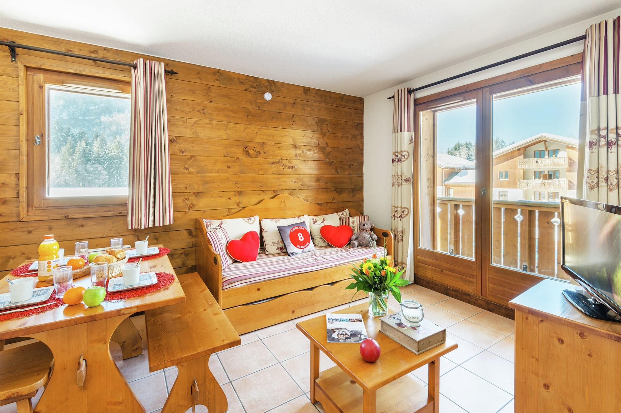Résidence Les Fermes de Samoëns ligger i de fredelige fyrreskove i Samoëns og tilbyder en fredelig ferie omgivet af imponerende klippevægge og naturlig skønhed. Denne rummelige duplex-chalet til 4-6 personer kombinerer traditionel savoyardisk arkitektur med moderne komfort og har varme detaljer i træ og sten, der fremkalder alpin charme. Den er fordelt på to etager og har en hyggelig stue med dobbelt sovesofa og tv, et veludstyret køkken med miniovn og opvaskemaskine samt tre indbydende soveværelser – perfekt til familier eller grupper. Træd ud på din private altan for at indånde den friske bjergluft og nyde den betagende udsigt. Kun 0,8 km fra hjertet af landsbyen Samoëns er du tæt nok på til at udforske charmerende butikker og lokale markeder, men alligevel gemt væk i fredelige omgivelser. Kæledyr er hjerteligt velkomne her, og det omkringliggende område byder på vidunderlige udendørsaktiviteter, I kan nyde sammen. Efter en eventyrlig dag kan I vende tilbage og slappe af i boligkompleksets fælles opvarmede swimmingpools – både overdækkede og udendørs muligheder venter på jer. Samoëns er kendt for sin lækre savoyardiske køkken, og flere restauranter i nærheden serverer traditionelle retter med et moderne twist. Smag på en solid tartiflette eller raclette på hyggelige bjergbistroer kun få minutter væk, eller nyd friske lokale råvarer på indbydende caféer. Ved sen ankomst skal gæsterne kontakte boligen på forhånd i receptionens åbningstid for at aftale nøgleudlevering. Online check-in og et depositum er påkrævet. Uden forudgående varsel kan adgang til boligen ikke garanteres.