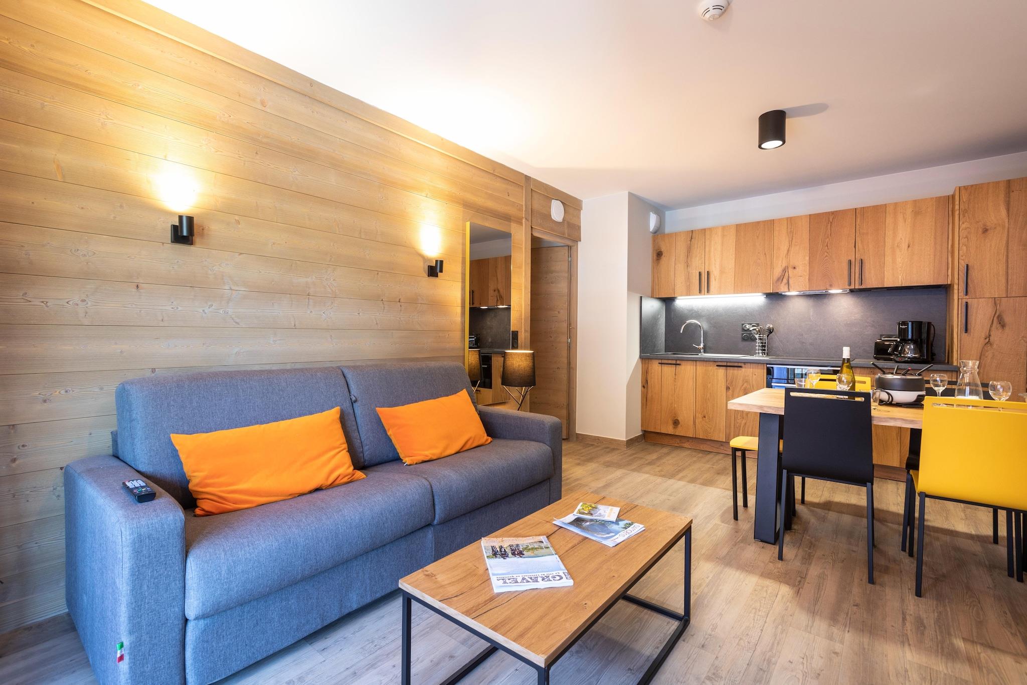 Résidence Samoëns Village er en stilfuld og komfortabel bolig med moderne og varmt indrettede lejligheder. En række større sammenhængende hytter rummer indbydende lejligheder i forskellige størrelser. Den ligger 600 m. fra Samoëns' attraktive centrum og 500 m. fra Télécabine du Grand Massif. Denne lejlighed i stueetagen er pænt og fuldt møbleret. Stuen har en 2-pers. sovesofa, TV og el-pejs. Køkkenet er fuldt udstyret med opvaskemaskine og kombineret mikroovn. Lejligheden har desuden et soveværelse med dobbeltseng. seng eller to 1-pers. senge og et lille soveværelse med en køjeseng, et badeværelse med bruser (i badekar) og separat toilet. For ekstra komfort er dine senge allerede rede ved ankomsten. Udenfor byder lejligheden på en balkon eller terrasse med udsigt over skiområdet. Der er både indendørs og udendørs parkering (afhængig af tilgængelighed) I Résidence Samoëns Village kan du booke forskellige komfortable lejligheder til fire til ti personer.