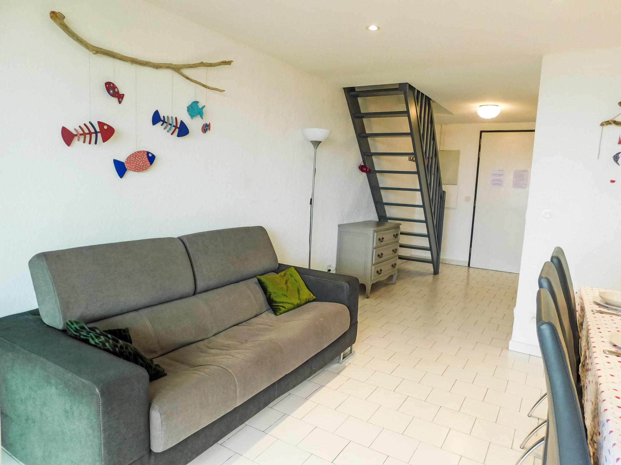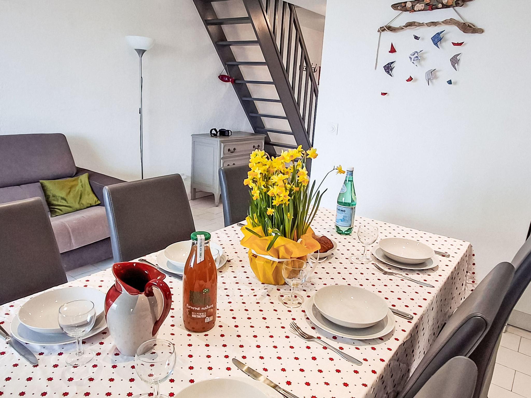 4-room maisonette 70 m2 on 1st floor, south-west facing position. Beautiful furnishings: living/dining room with TV (flat screen), air conditioning. Exit to the veranda. 1 room with 1 french bed (1 x 160 cm, length 200 cm). Kitchenette (oven, dishwasher, 4 ceramic glass hob hotplates, toaster, kettle, microwave, freezer, electric coffee machine). Bathroom, sep. WC. Electric heating. Upper floor: 1 room with sloping ceilings with rooflight with 1 french bed (160 cm, length 200 cm). 1 room with sloping ceilings with rooflight with 1 pull-out bed (2 pers. 2 x 90 cm, length 190 cm). Shower, sep. WC. Beautiful view of the sea. Facilities: washing machine, dryer, iron, children's high chair, baby cot for up to 2 year olds. Internet (WiFi, free). Parking space n 15. Please note: maximum 1 pet/ dog allowed. TV only FR. Smoke alarm, no lift. Offer by a commercial proprietor according to Art. 155, IV, CGI 8312300164467