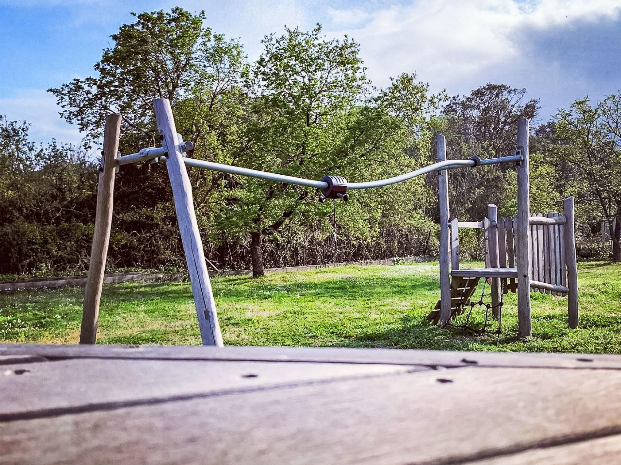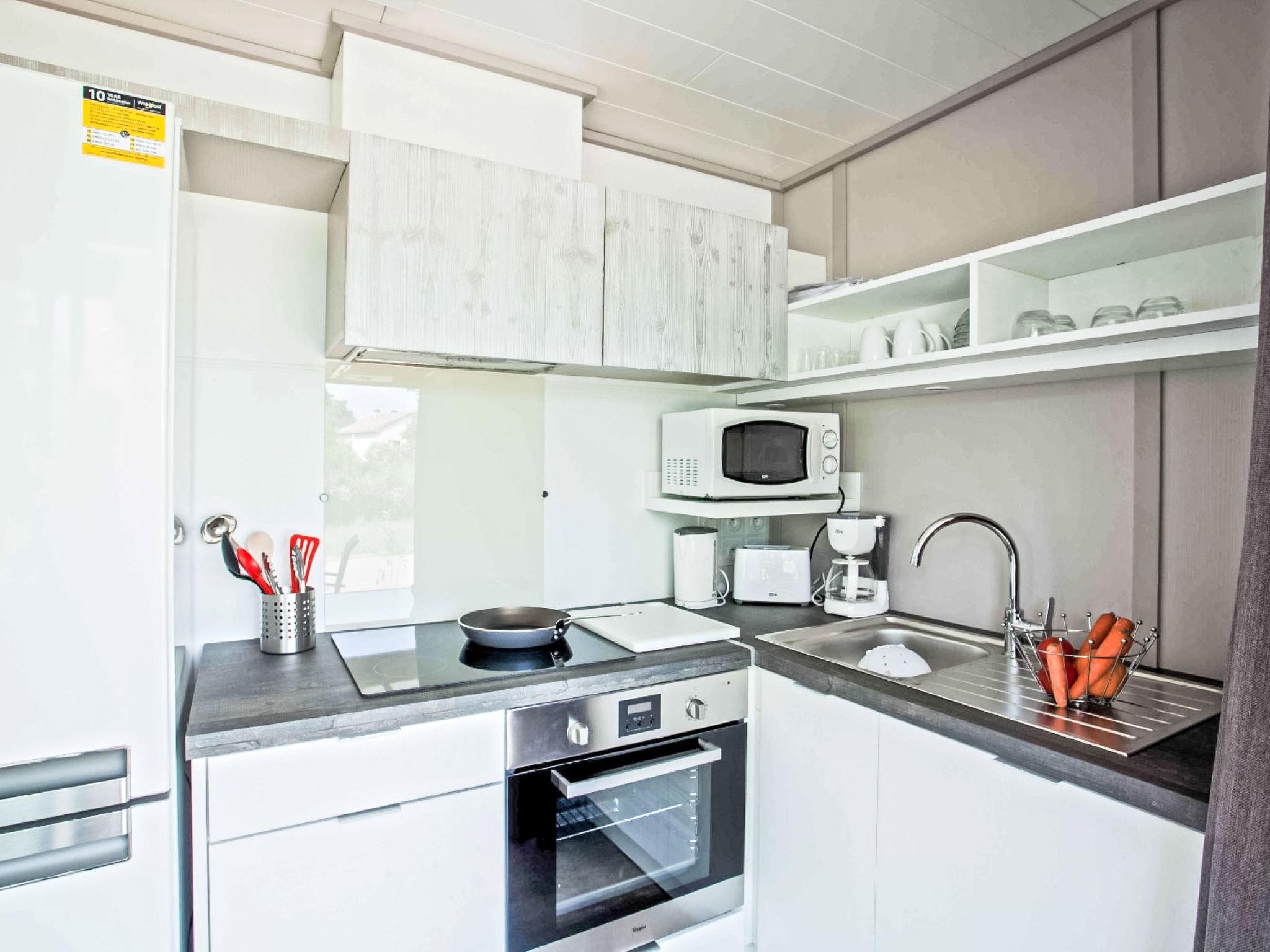 "Lodge Natura 4p", 3-room chalet 37 m2. Comfortable furnishings: living/dining room with dining table and TV (flat screen), air conditioning. Exit to the terrace. 1 room with 1 french bed (160 cm, length 200 cm). 1 room with 2 beds (90 cm, length 190 cm). Kitchenette (oven, dishwasher, 3 induction hot plates, toaster, kettle, microwave, electric coffee machine). Shower, sep. WC. Electric heating. Terrace partly roofed, small garden. Terrace furniture, barbecue (portable). Facilities: children's high chair, baby cot (extra), hair dryer. Internet (WiFi, free). Parking (fenced). Please note: non-smokers only. Smoke alarm. Offer by a commercial proprietor according to Art. 155, IV, CGI