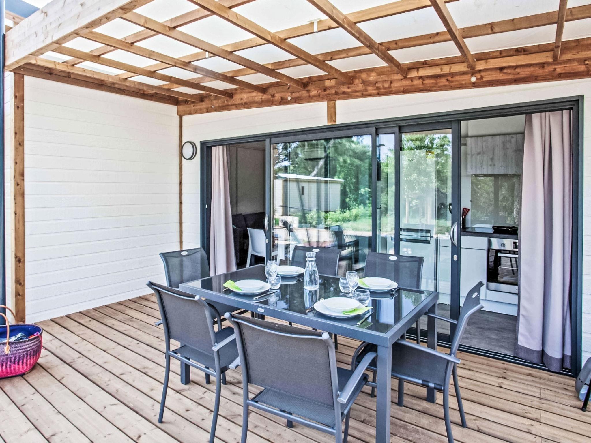 "Lodge Natura 5p", 3-room chalet 40 m2. Comfortable furnishings: living/dining room with dining table and TV (flat screen), air conditioning. Exit to the terrace. 1 room with 1 french bed (160 cm, length 200 cm). 1 room with 1 bed (90 cm, length 190 cm), 1 x 2 bunk beds (90 cm, length 190 cm). Kitchenette (oven, dishwasher, 3 induction hot plates, toaster, kettle, microwave, electric coffee machine). Shower, sep. WC. Electric heating. Terrace partly roofed, small garden. Terrace furniture, barbecue (portable). Facilities: hair dryer. Parking (fenced). Please note: non-smokers only. Smoke alarm. Offer by a commercial proprietor according to Art. 155, IV, CGI