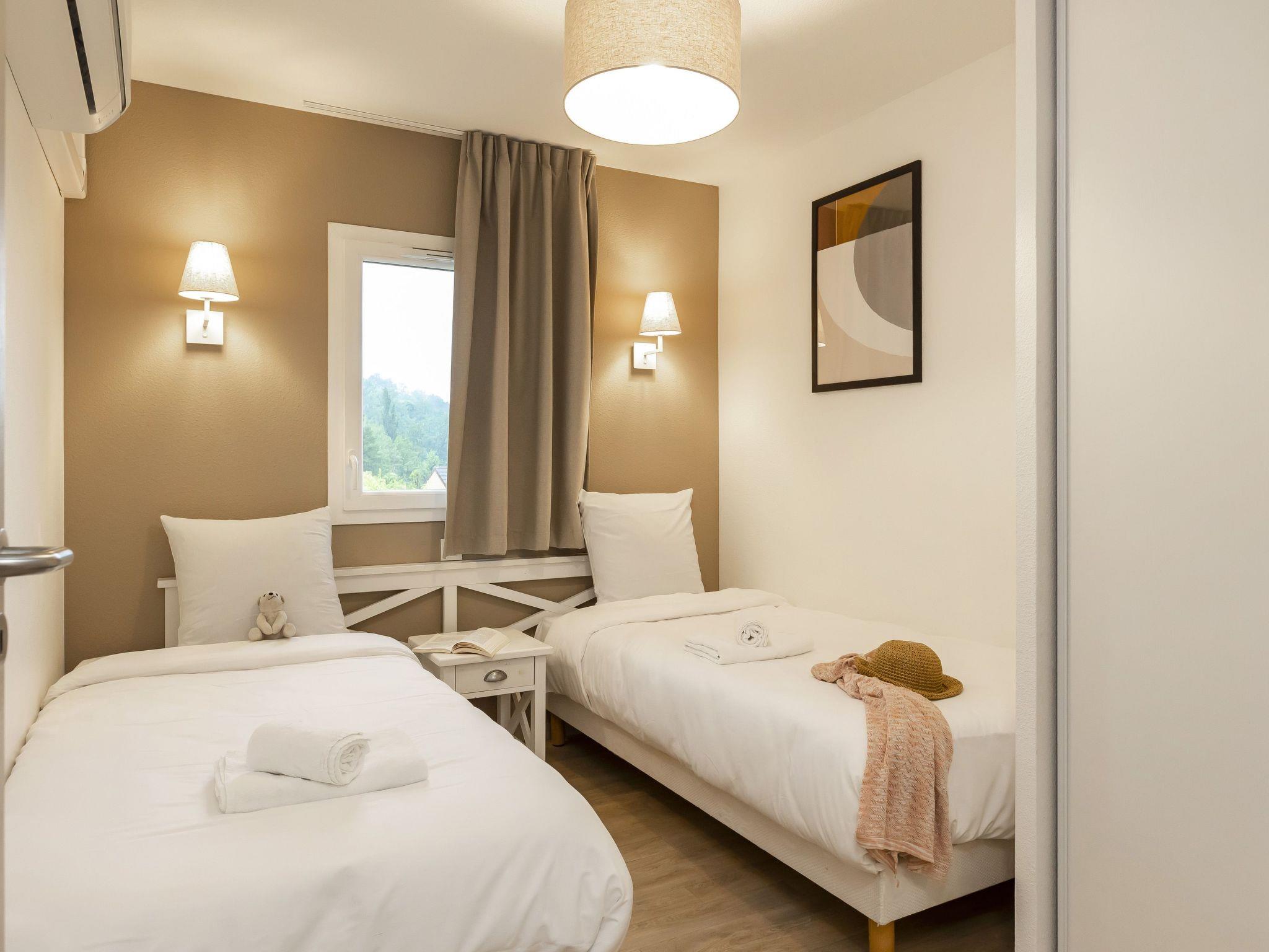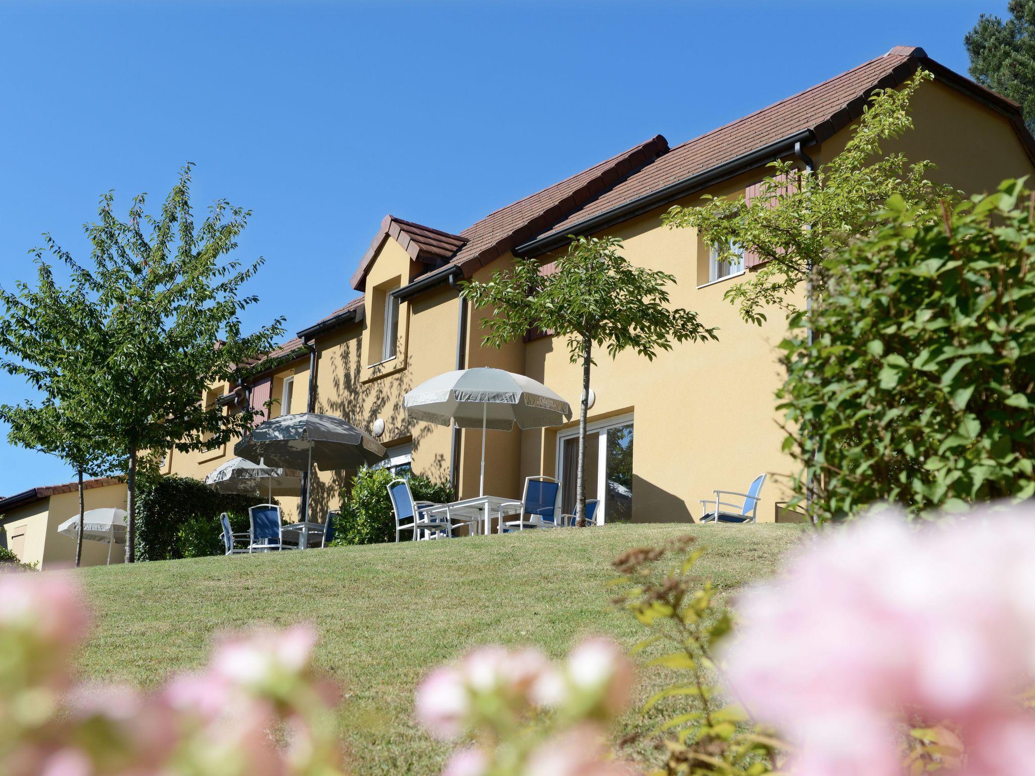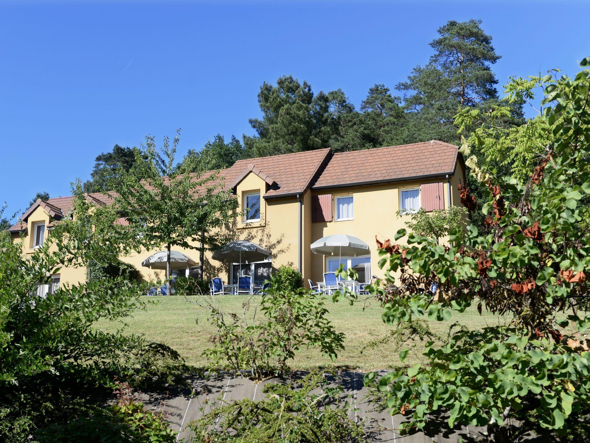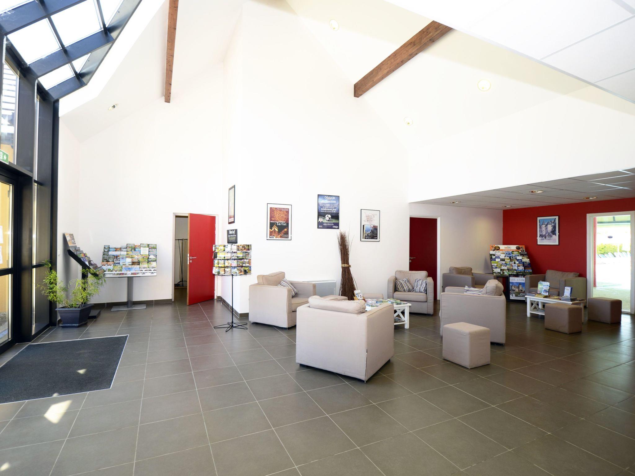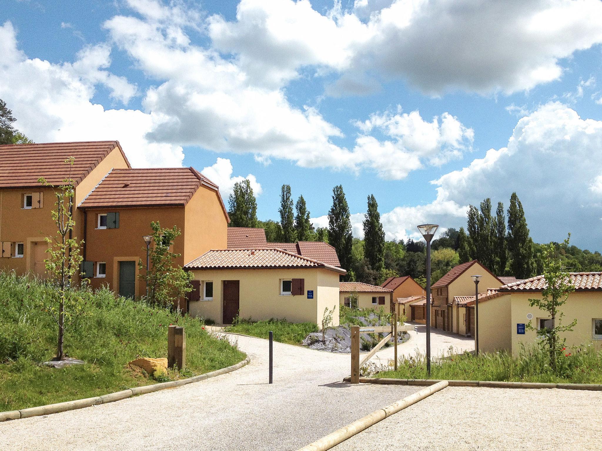 "Odalys Référence Les Côteaux de Sarlat", 4-room terraced house 59 m2 on 2 levels. Bright, cosy furnishings: living/sleeping room with 1 sofabed, 1 pull-out bed, dining table and satellite TV. Exit to the terrace. 1 room with 1 french bed and shower. Kitchenette (dishwasher, 4 ceramic glass hob hotplates, kettle, microwave, freezer, electric coffee machine). Sep. WC. Upper floor: 1 room with 1 french bed. 1 room with 2 beds. Bathroom, sep. WC. Electric heating. Parquet floors. Terrace. Terrace furniture. Facilities: children's high chair, baby cot. Internet (WiFi, free). Please note: non-smoking house. Maximum 1 pet/ dog allowed. Smoke alarm.