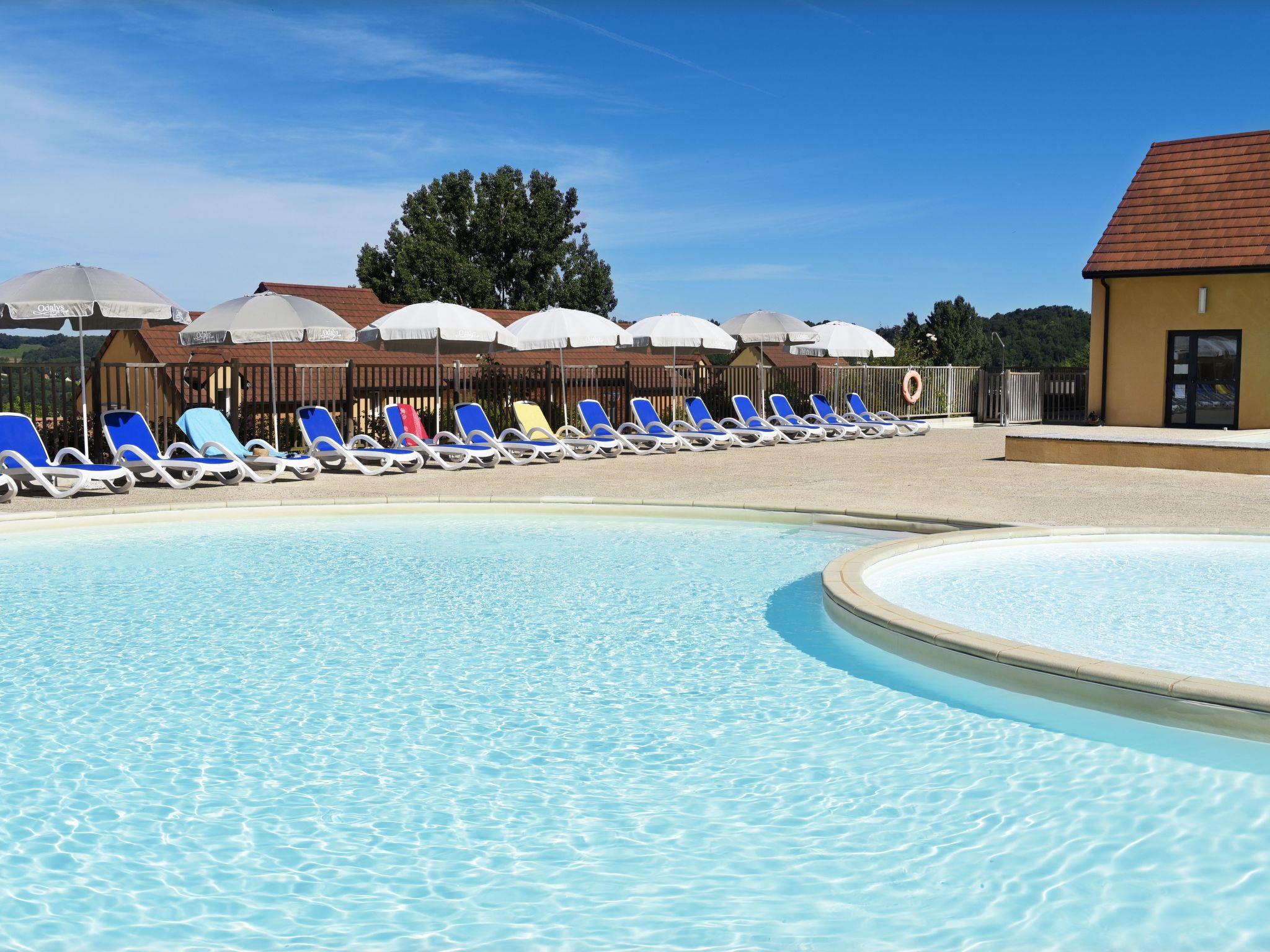 Child friendly resort "Les Coteaux de Sarlat". 100 houses in the residence. 2.5 km from the centre of Sarlat-la-Caneda, on the outskirts, 50 km from the centre of Brive, on a slope. For shared use: property 30'000 m2 (fenced) with lawn and trees, swimming pool heated (17 x 7 m, depth 100 - 140 cm, seasonal availability: 01.May. - 30.Sep.). Children's pool, table tennis, basketball, boccia, children's playground. In the complex: reception, sauna (extra). Fitness room, steam room (extra). Washing machine, tumble dryer (for shared use, extra). Bread roll service. Parking on the premises. Shop 1.7 km. Minigolf 100 m. Please note: Loading and unloading of baggage is possible at the holiday house. The photograph shows a typical example. The holiday properties may differ in living space, floorplan, equipment and furnishing.