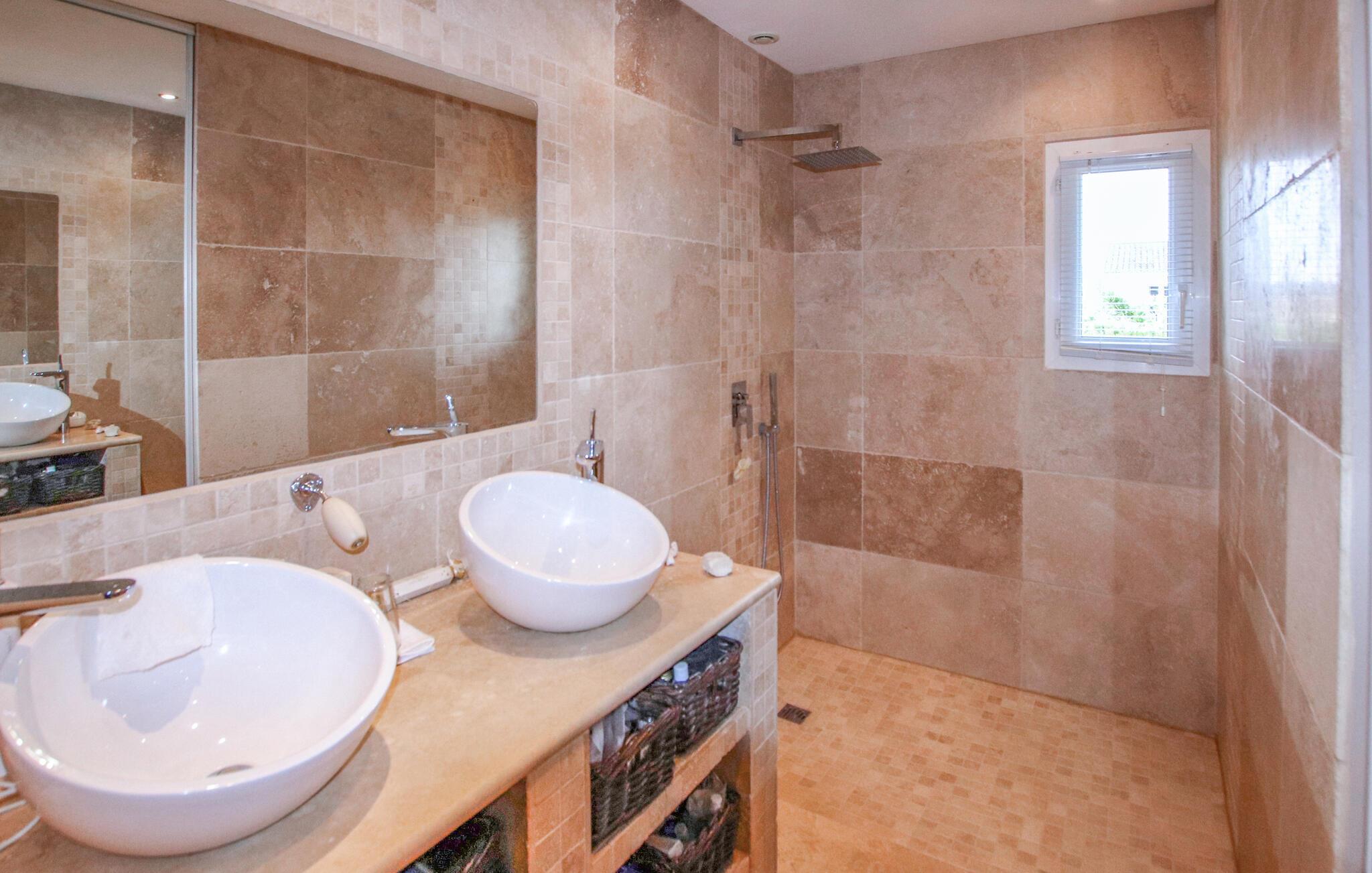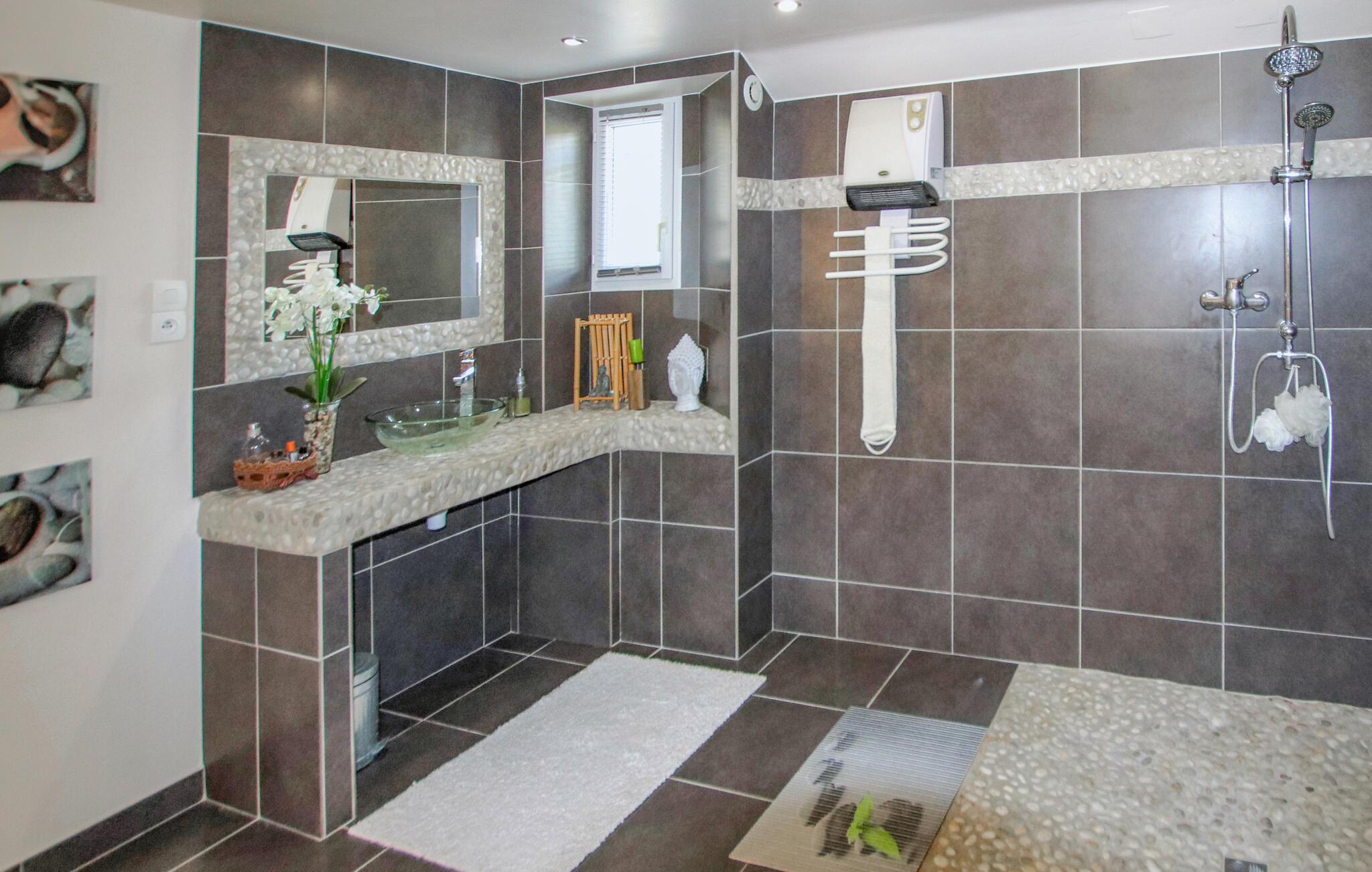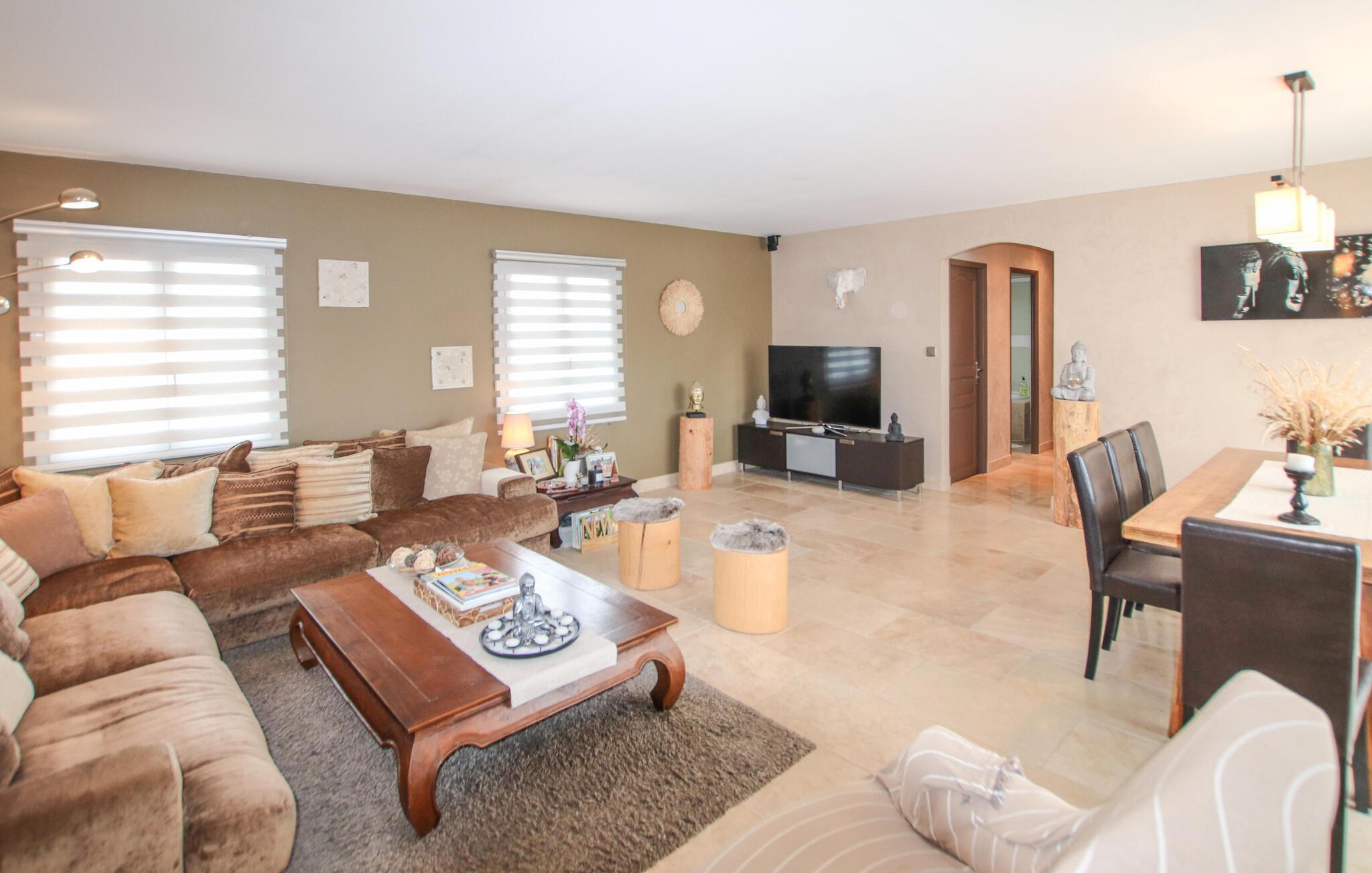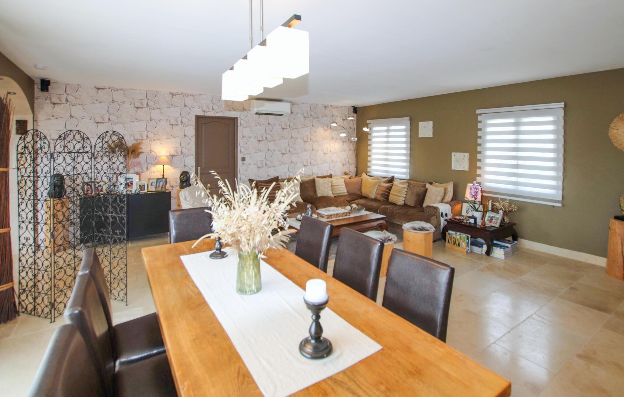 Velkommen til dette rummelige, stilfuldt indrettede feriehus, hvor I kan koble af fra hverdagen. Eksperimenter med urter fra Provence i det moderne køkken og tag plads ved det indbydende spisebord. Spil et spil billard eller bordfodbold, og put jer i det hyggelige sofaområde til en god film eller en hyggelig spilleaften.