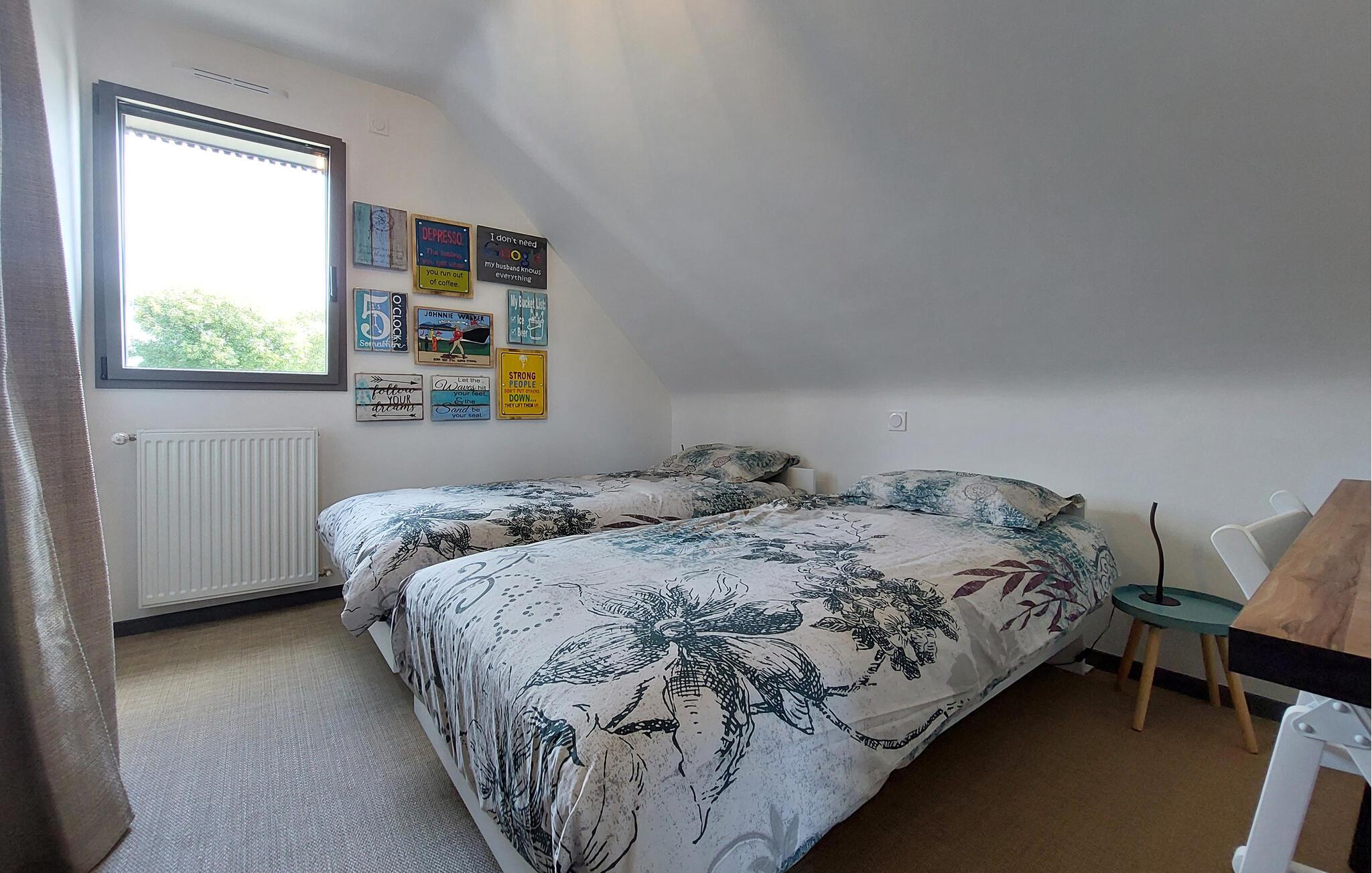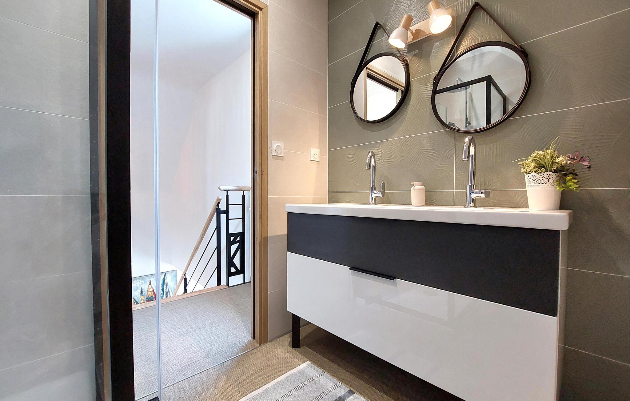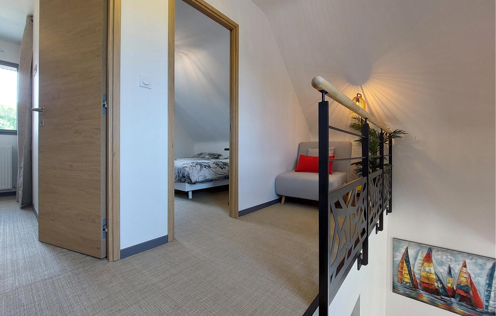 Dette moderne, fuldt udstyrede feriehus i Sarzeau tilbyder jer en uforlignelig atmosfære af afslapning. Allerede ved indgangen mærker I den højkvalitets indretning – stilfuld arkitektur, udsøgt design og elegante møbler skaber et eksklusivt miljø for jer. Et særligt højdepunkt er den åbne balkon, som giver rummet et luftigt og rummeligt præg. Store vinduer fylder rummene med lys og åbner op til udsigten over den blomstrende, smukt anlagte have. Her kan I nyde absolut ro og afslapning – et perfekt tilflugtssted, kun få minutters gang fra stranden og havnen. Saml jer på terrassen og nyd solen samt fælles måltider fra grillen.
