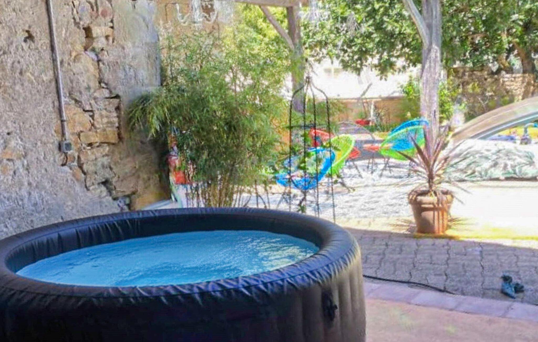 Svøm i den private pool, omgivet af en terrasse og komfortable siddepladser. Bagefter kan I slappe af i spabadet og sætte hverdagen på pause. Sid under skyggefulde træer ved det lange havebord, tilbring rolige timer i de farverige havestole ved poolen eller slap af i det hyggelige, rustikke loungeområde.