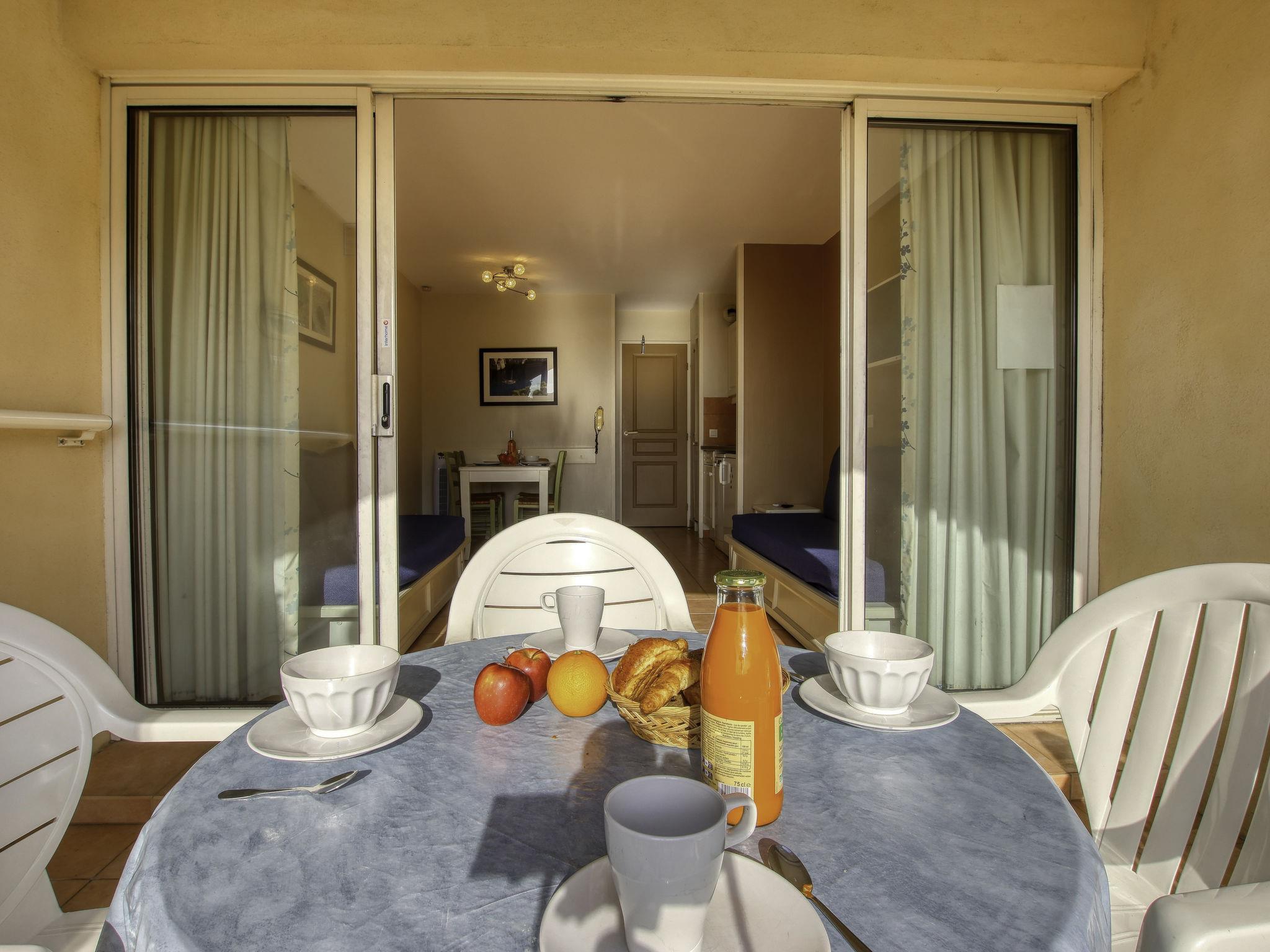 2-room apartment 32 m2, on the ground floor. Practical and beautiful furnishings: living/dining room with 2 beds (80 cm, length 190 cm), TV (flat screen). Exit to the terrace. 1 room with 1 french bed (1 x 140 cm, length 190 cm). Kitchenette (dishwasher, 4 ceramic glass hob hotplates, toaster, kettle, microwave, electric coffee machine). Bathroom, sep. WC. Electric heating. Terrace 8 m2, roofed, south-west facing position, small patio 4 m2. Terrace furniture. View of the sea and the swimming pool. Facilities: washing machine. Internet (WiFi, extra). Parking space n 428 (Niveau P1) (roofed), height 190 cm, width 240 cm. Please note: maximum 1 pet/ dog allowed. TV only FR. Smoke alarm. Note: the garden is not fenced.