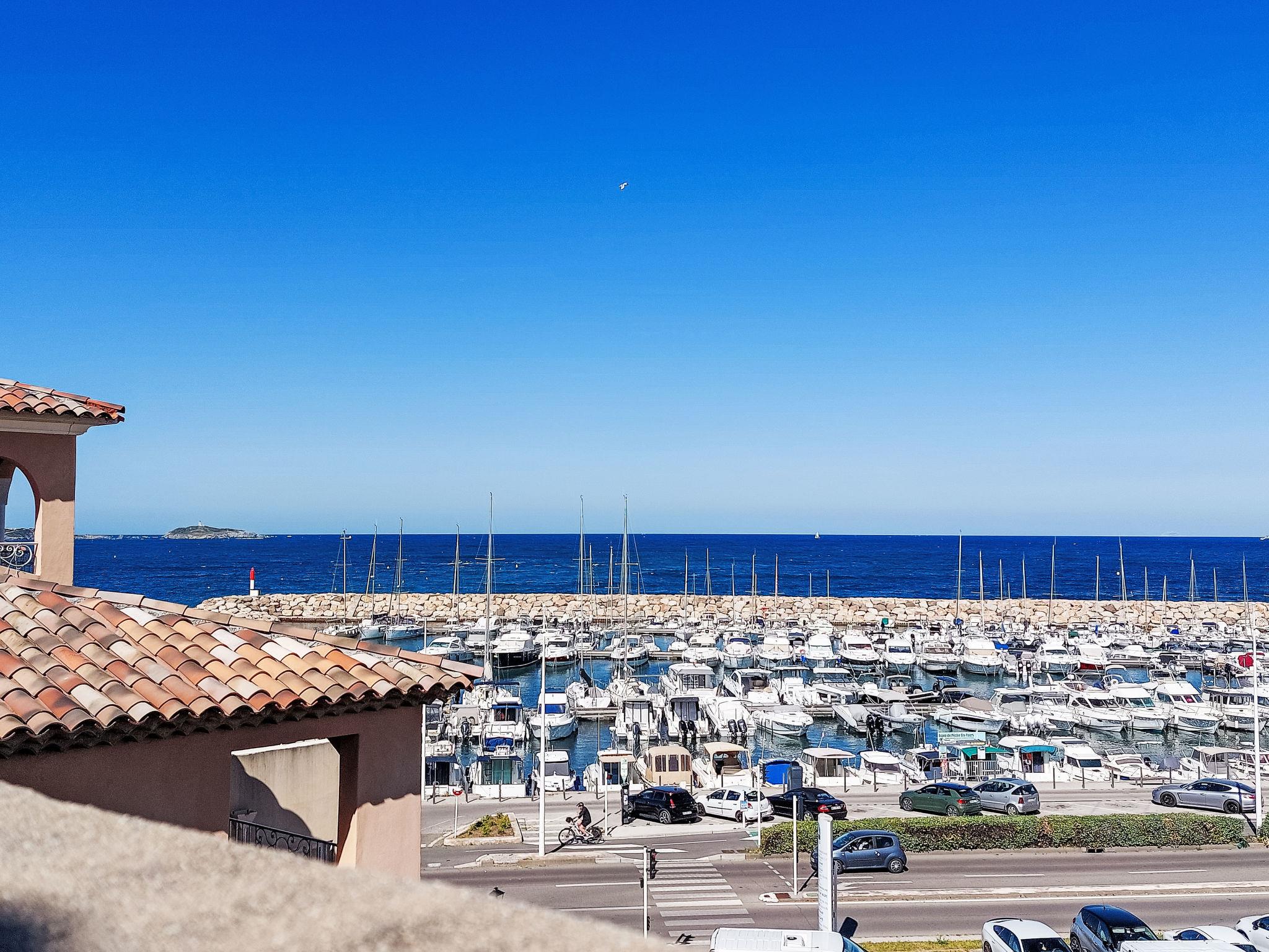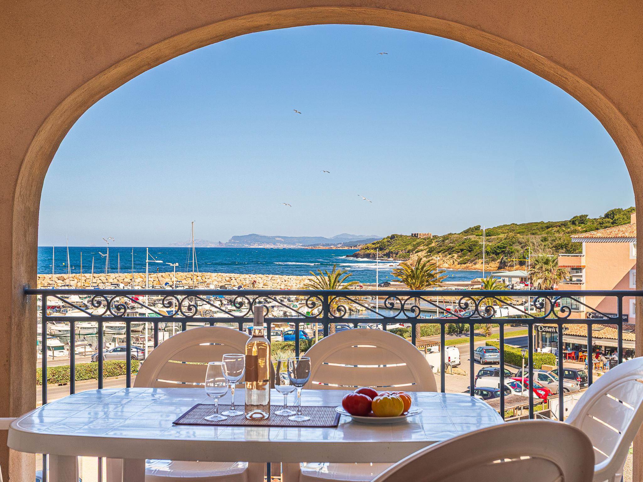 3-room apartment 45 m2 on 2 levels on 2nd floor. Practical and beautiful furnishings: living/dining room with 2 beds (80 cm, length 190 cm), TV (flat screen). Exit to the terrace. Sleeping alcove with 1 x 2 bunk beds (80 cm, length 190 cm). Kitchenette (dishwasher, 4 ceramic glass hob hotplates, toaster, kettle, freezer, electric coffee machine, combination microwave). Shower/WC. Upper floor: 1 room with 1 french bed (140 cm, length 190 cm). Exit to the balcony. Bath/WC. Electric heating. Balcony 12 m2, west facing position, terrace 7 m2, roofed, west facing position. Terrace furniture. Beautiful view of the sea. Facilities: washing machine. Internet (WiFi, extra). Parking space n 549 (niveau 2) (roofed), height 190 cm, width 249 cm. Please note: non-smokers only. Maximum 1 pet/ dog allowed. TV only FR. Smoke alarm, no lift. Instead of an enclosed bedroom, some sleeping areas are located in an open-plan area (gallery, alcove, etc.).