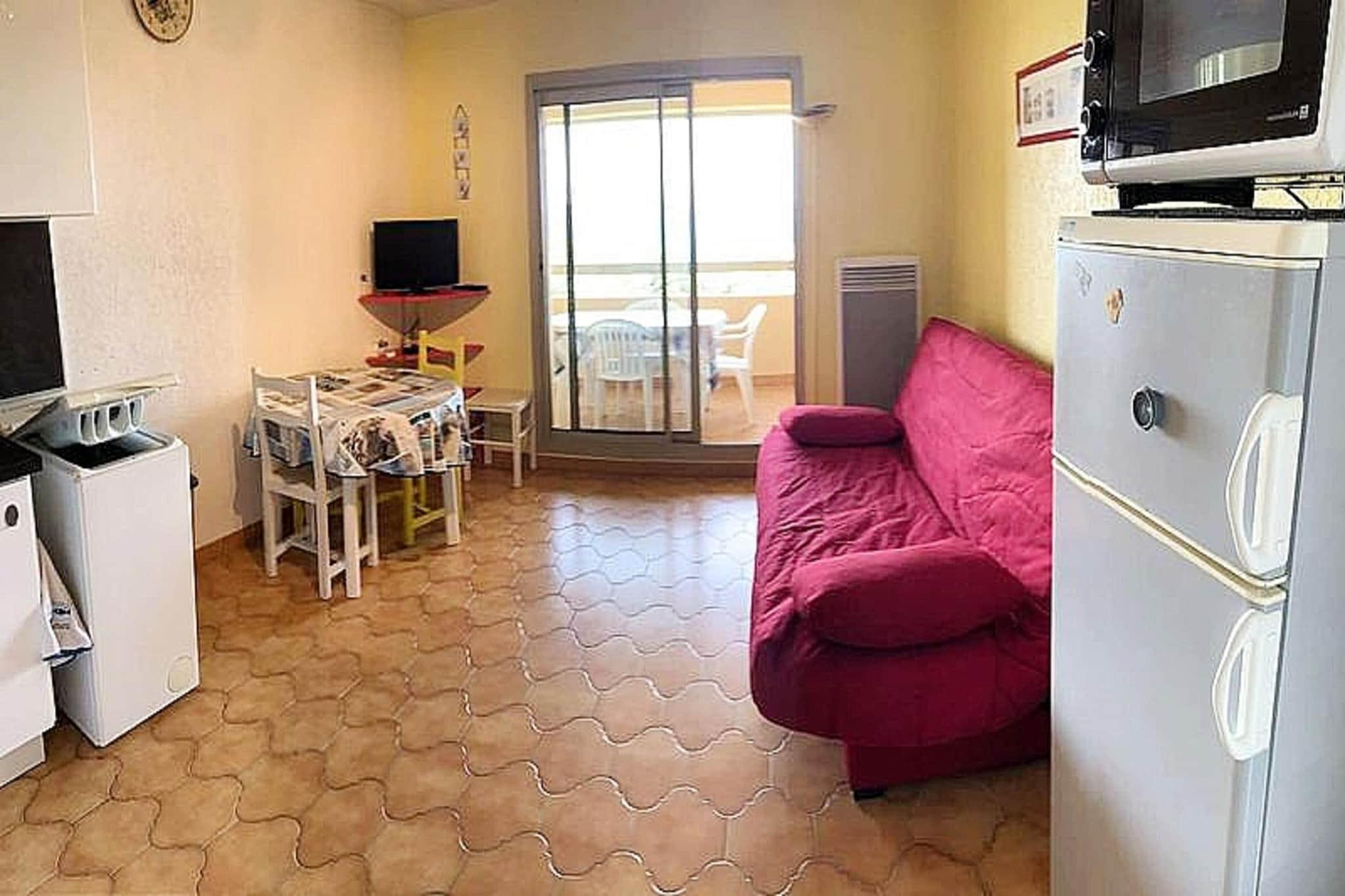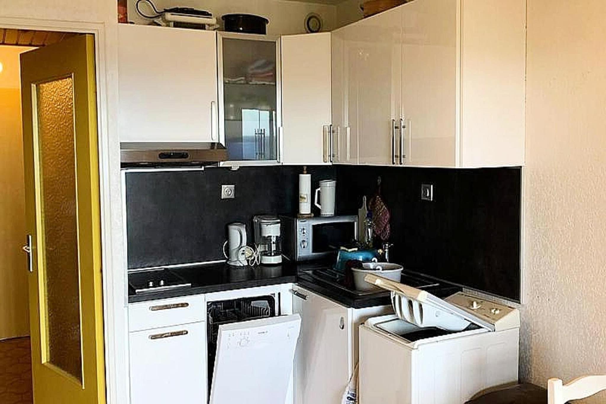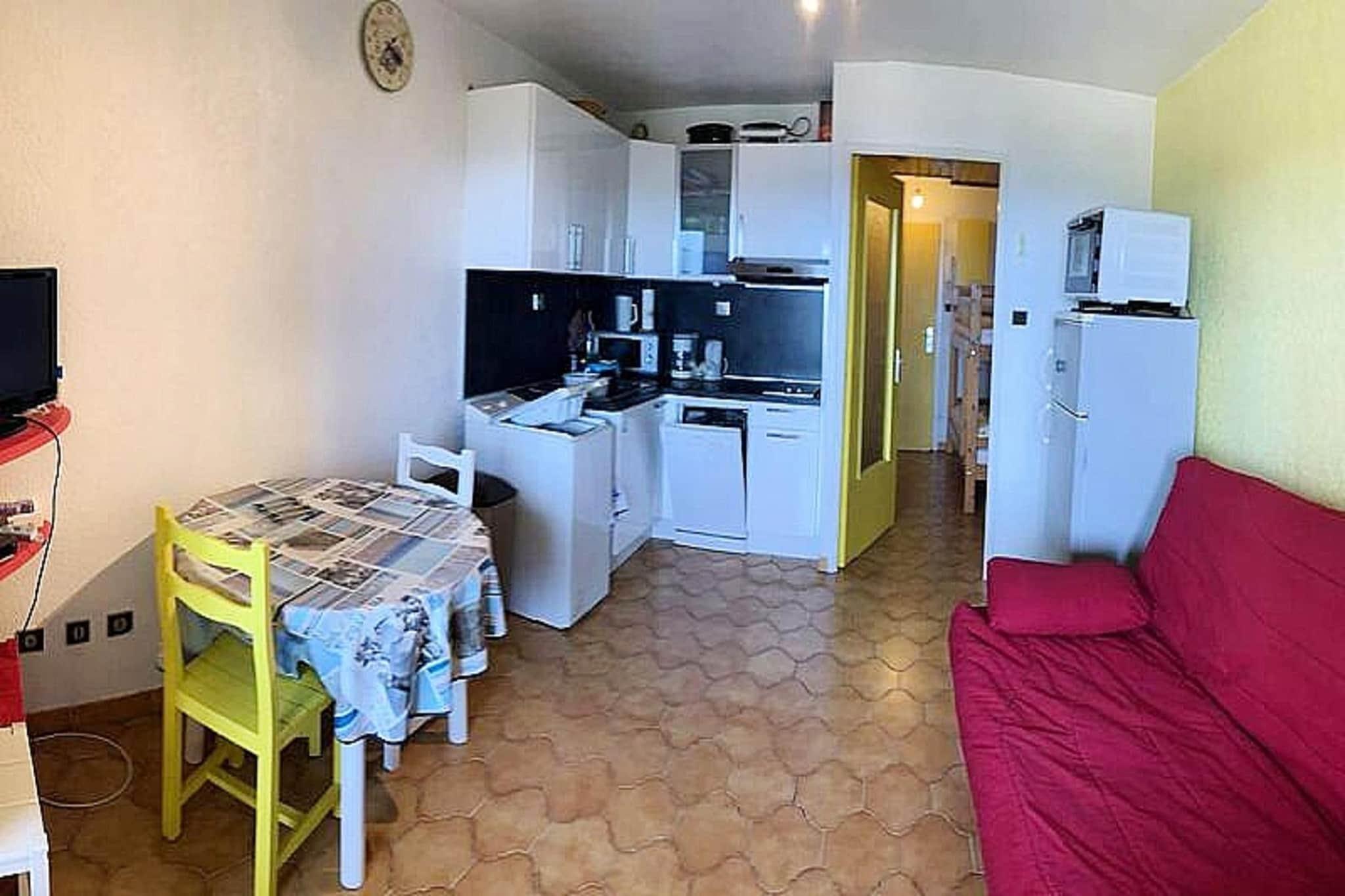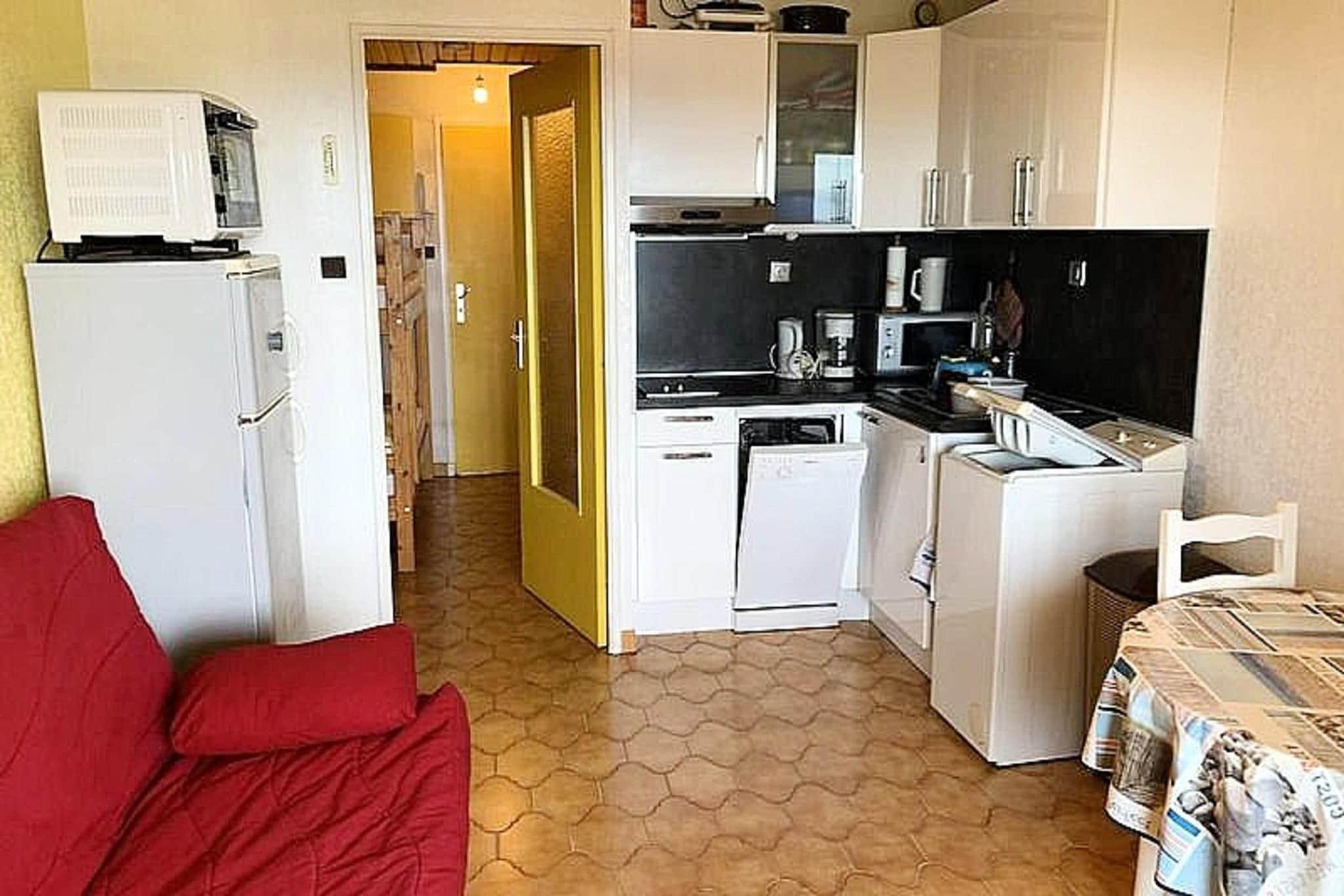 This charming apartment offers a comfortable stay for up to 4 guests, featuring a cabin with a bunk bed, a living room with a sofa bed, and a sea-view loggia for a relaxing atmosphere. The residence includes access to a swimming pool and tennis court (at an additional cost). Bed linens and towels are not provided, but they can be arranged for an additional charge. The apartment is not pet-friendly, and a tourist tax and a credit card deposit will be collected on-site upon arrival. The apartment is ideally located just 200 meters from the beach, offering easy access to the sea and stunning views. Enjoy the peaceful surroundings of a wooded residence while being close to the vibrant areas of Six Fours les Plages. The local attractions include the beautiful beaches, a variety of cafes, and markets, making it a perfect location for those who enjoy outdoor activities and local culture. The apartment features a fully equipped kitchen, ideal for preparing meals during your stay. The living space opens to the kitchen, creating a welcoming atmosphere for guests. The bathroom and separate toilet provide necessary amenities for your comfort, and the heating ensures a cozy environment during cooler months.