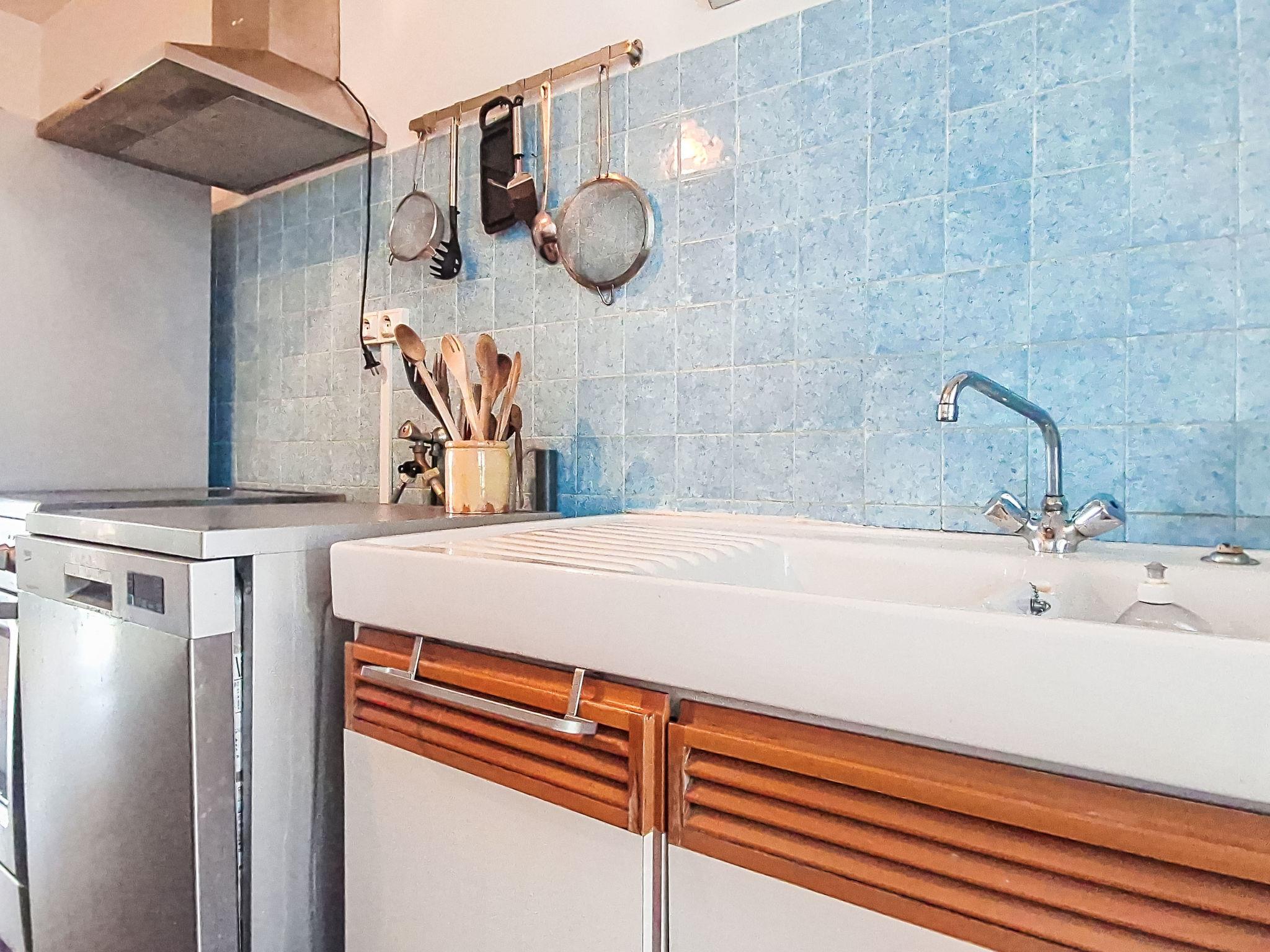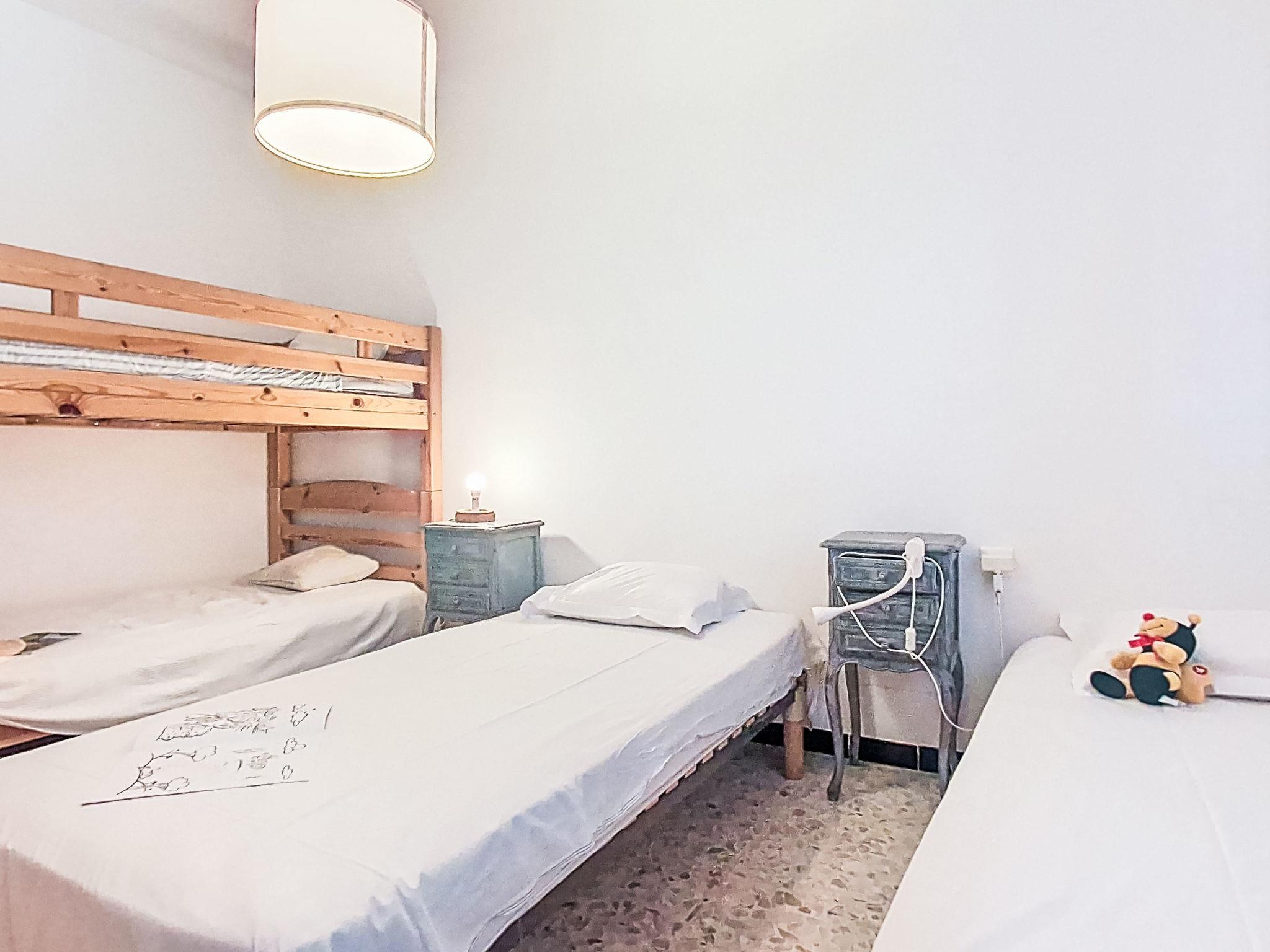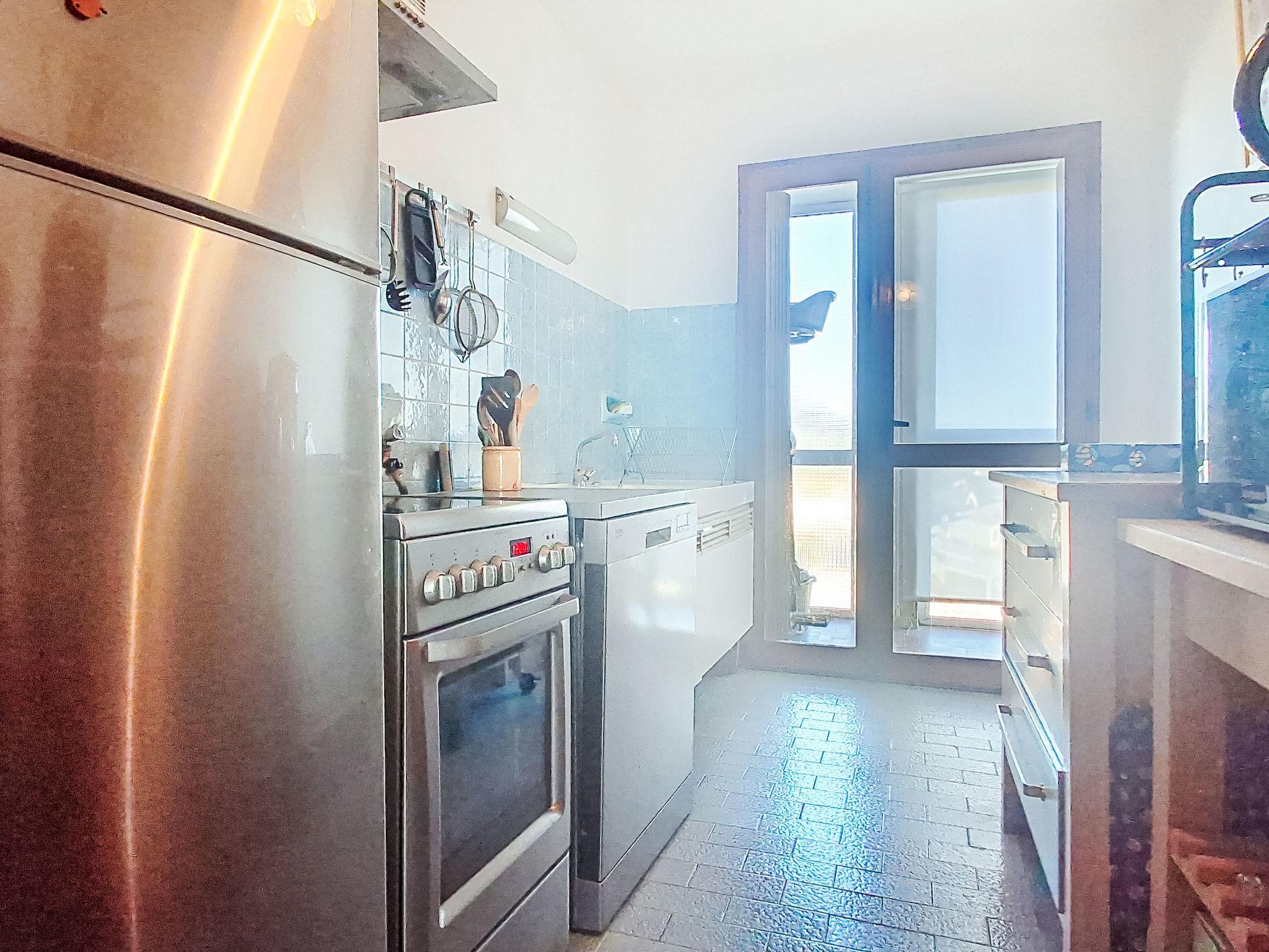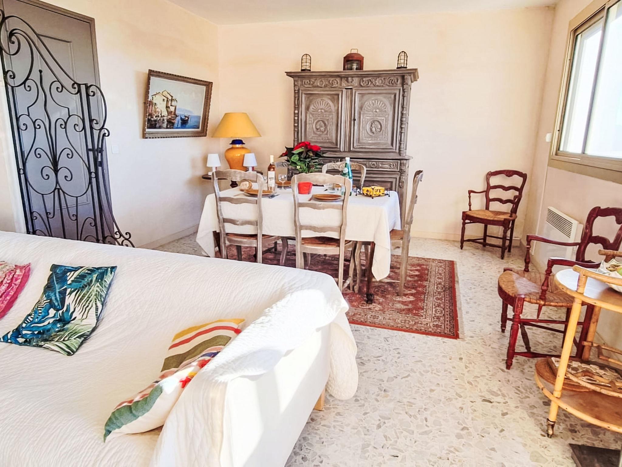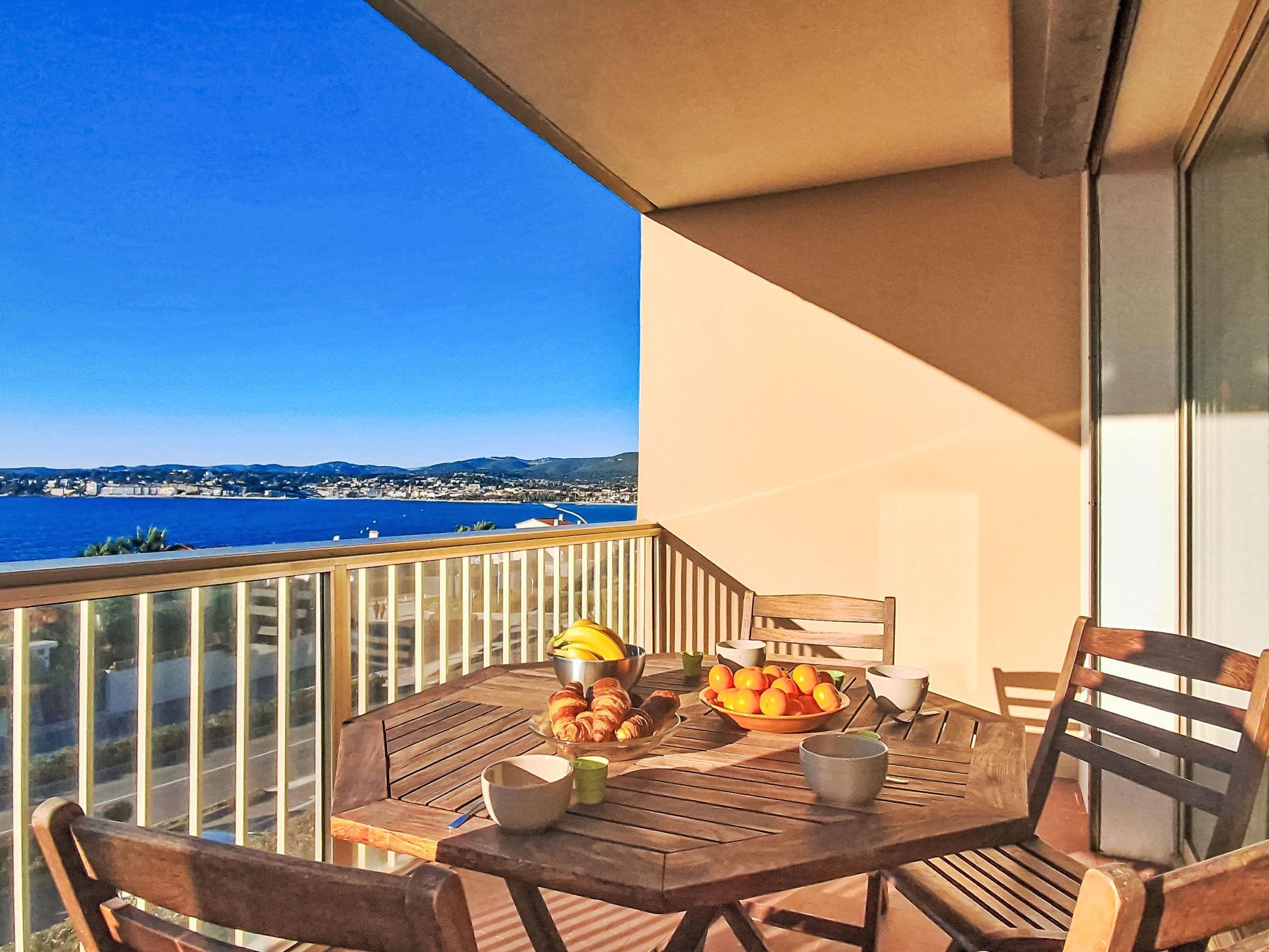 3-room apartment 80 m2 on 3rd floor. Bright, comfortable furnishings: living/dining room with dining table and TV (flat screen). Exit to the terrace. 1 room with 2 beds (80 cm, length 190 cm), fan. 1 room with 1 french bed (160 cm, length 200 cm), fan. Kitchen (oven, dishwasher, 1 ceramic glass hob hotplate, 4 gas rings, toaster, kettle, microwave, electric coffee machine). Shower, sep. WC. Electric heating. Terrace 10 m2, roofed and west facing position. Terrace furniture. Very beautiful view of the sea. Facilities: Internet (WiFi, extra). Please note: non-smokers only. TV only FR. Smoke alarm, no lift. Offer by a private individual according to Art. 155, IV of CGI.