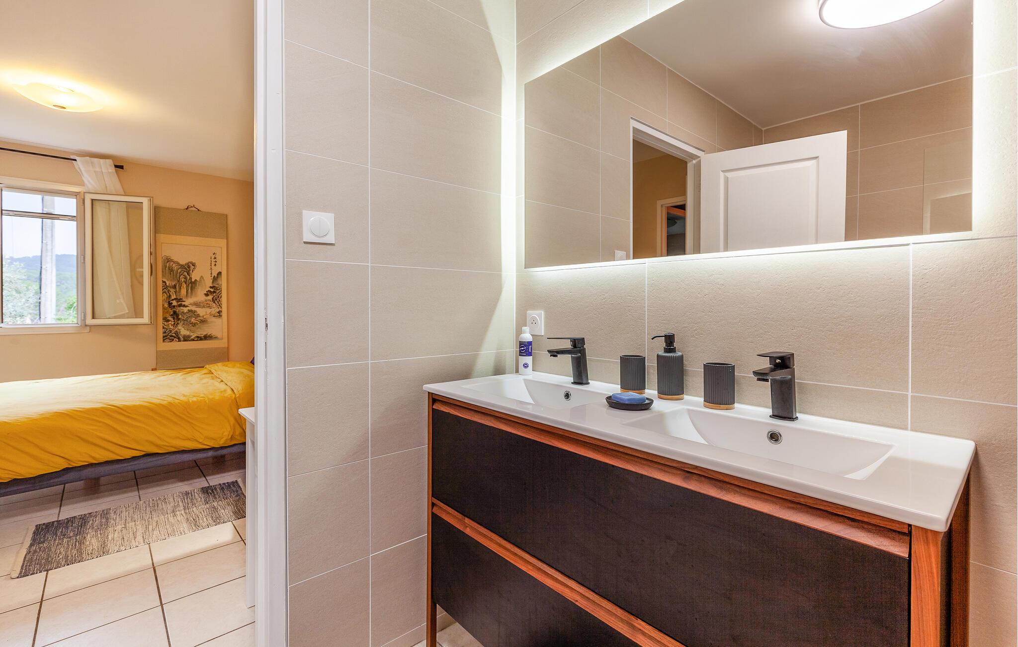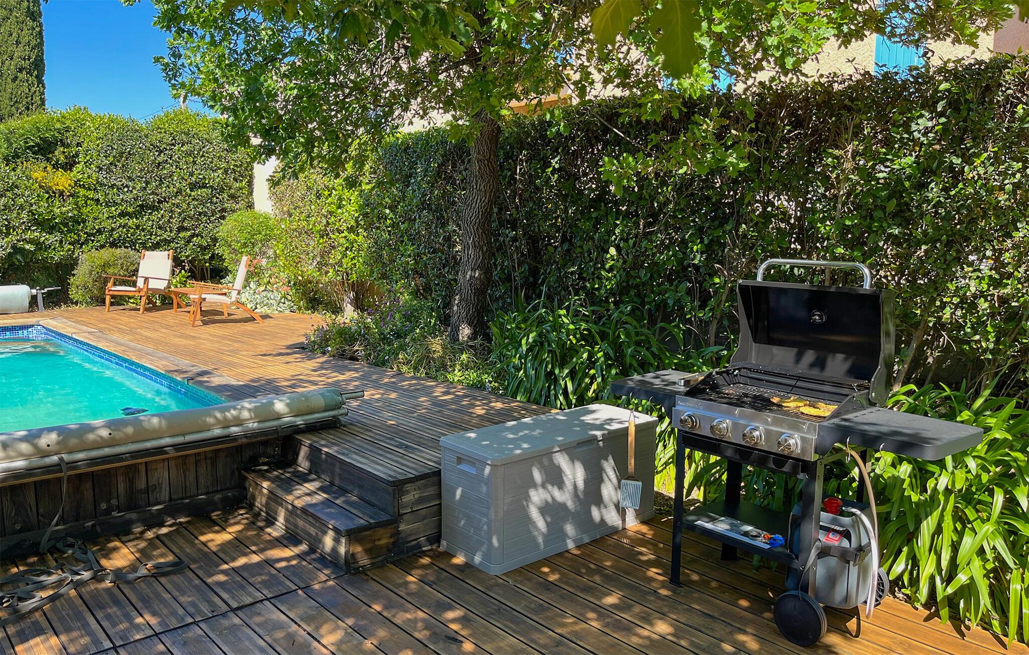 Fra Lez Embiez får I en dejlig udsigt til havet og havnen i Sanary, og I kan også glæde jer til at opleve sommerens fyrværkeriopvisninger i Bandol fra huset. I horisonten kan I beskue Fort de Six Fours og spiret af Notre Dame du Mai. Der er lagt op til mange dejlige timer i solen på den store træterrasse, og poolen indbyder til nogle friske dyp, når solen bliver lige det varmeste.