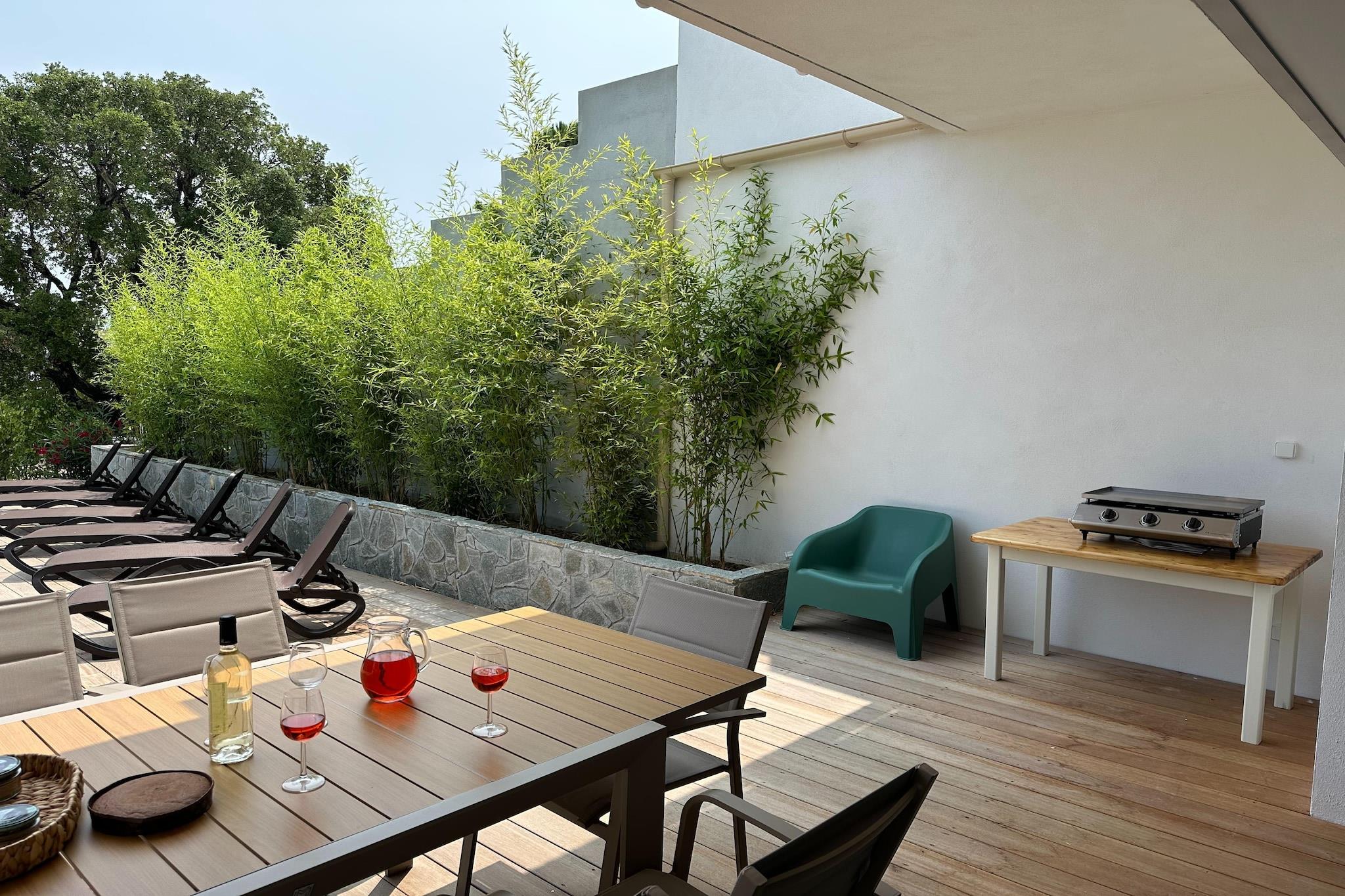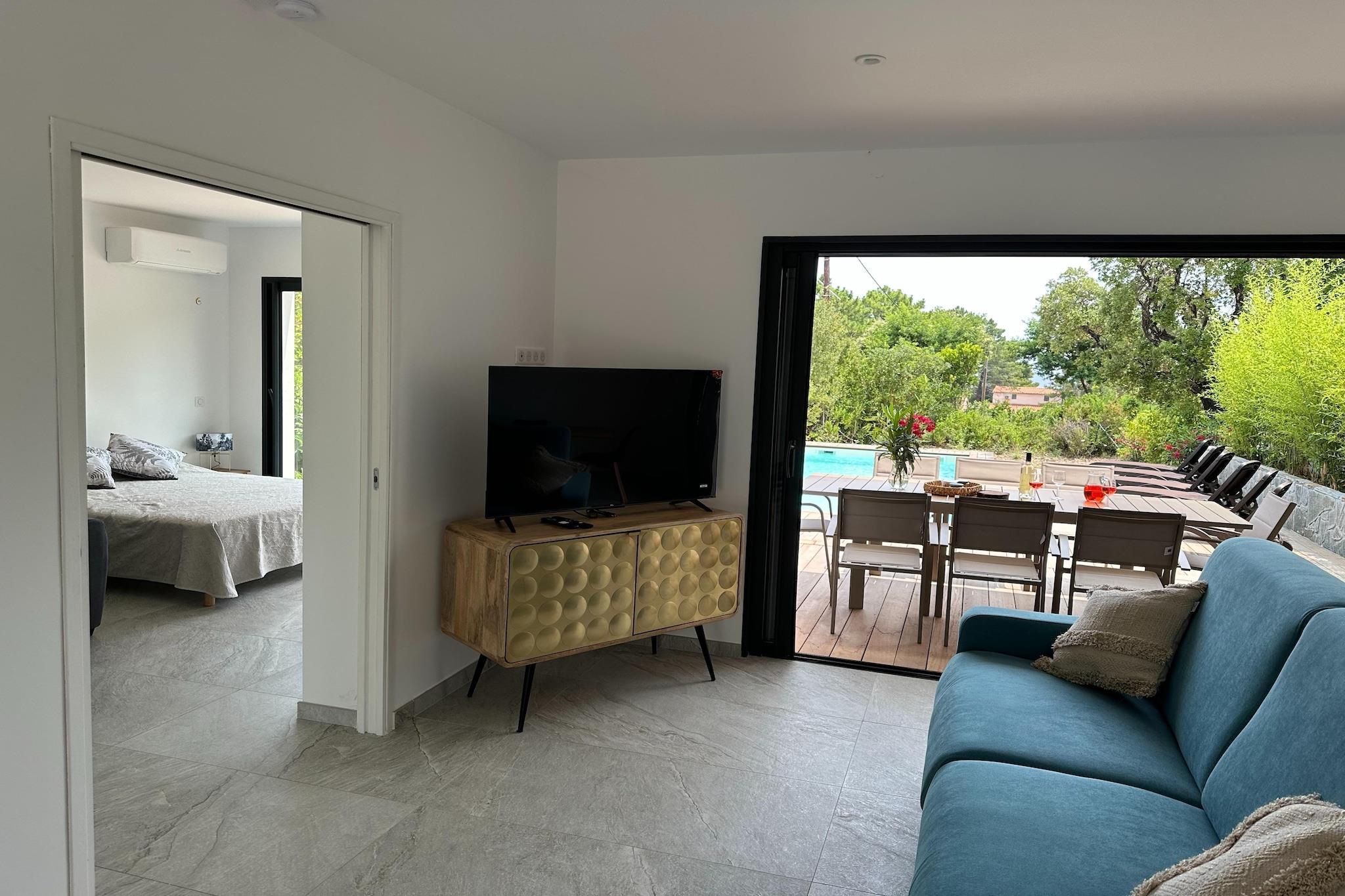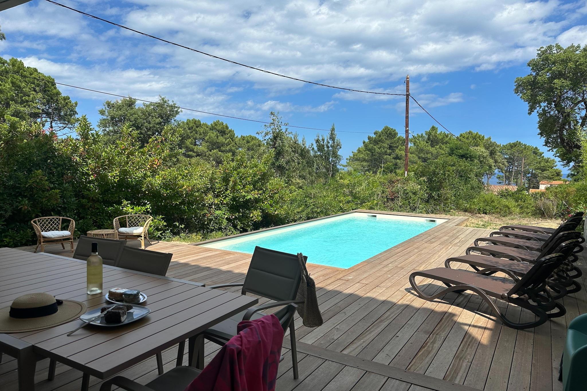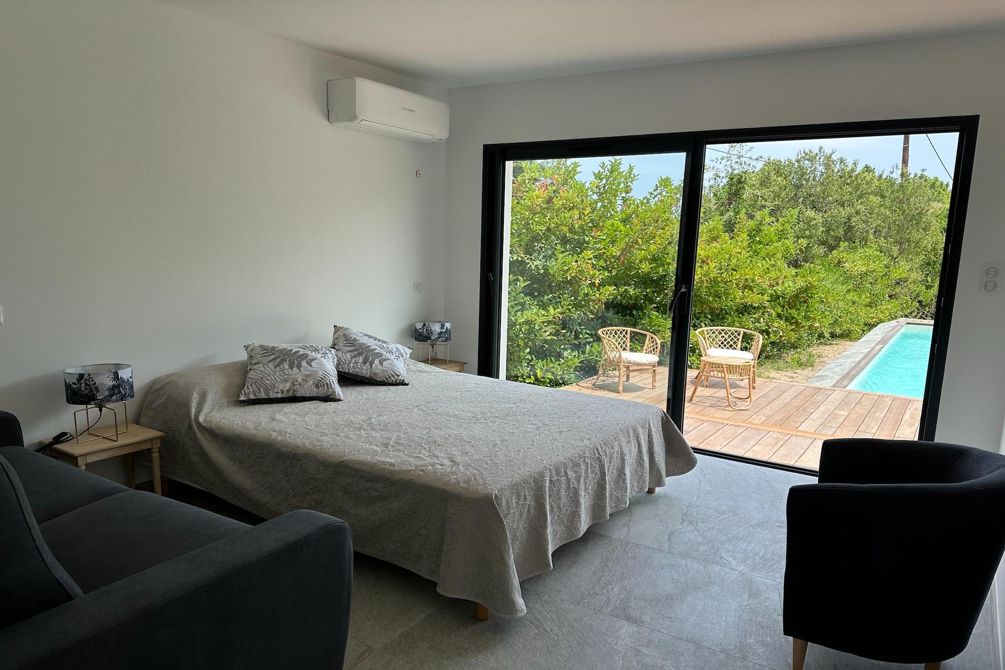 Beliggende i en fredelig beliggenhed tæt på kysten i Solenzara på Korsika, tilbyder dette attraktive dobbelthus generøs plads, moderne komfort og fremragende udendørsliv for familier eller grupper. Med en privat pool og flere afslapningsområder er ejendommen designet til gæster, der ønsker at nyde solskin, privatliv og den afslappede middelhavslivsstil. I stueetagen har huset en lys stue og spisestue med rummelige siddepladser, et tv og en spiseplads til fælles måltider. Det fuldt udstyrede åbne køkken gør det nemt og bekvemt at lave mad selv. Denne etage inkluderer også et komfortabelt soveværelse med dobbeltseng og et komplet badeværelse, ideelt for gæster, der foretrækker indkvartering i stueetagen. Ovenpå på første sal er der tre yderligere soveværelser: et med to enkeltsenge, et med en dobbeltseng og et andet med to enkeltsenge, der tilbyder fleksible sovemuligheder. Denne etage betjenes af tre komplette moderne badeværelser med toiletter, hvilket sikrer fremragende komfort og privatliv for større grupper. Træd ud på den private terrasse, der er møbleret med komfortable havemøbler og liggestole, perfekt til at slappe af med en bog eller nyde måltider i det fri. Den private swimmingpool indbyder til forfriskende dukkerter hele dagen, mens grillområdet gør det nemt at tilberede afslappede grillmiddage under den korsikanske himmel. Yderligere faciliteter inkluderer Wi-Fi, aircondition samt vaskemaskine og tørretumbler, hvilket gør hjemmet praktisk til både korte og længere ophold. Tæt på strande, restauranter og bjerglandskaber tilbyder denne villa i Solenzara den perfekte blanding af komfort, privatliv og udendørs nydelse for en mindeværdig korsikansk ferie.