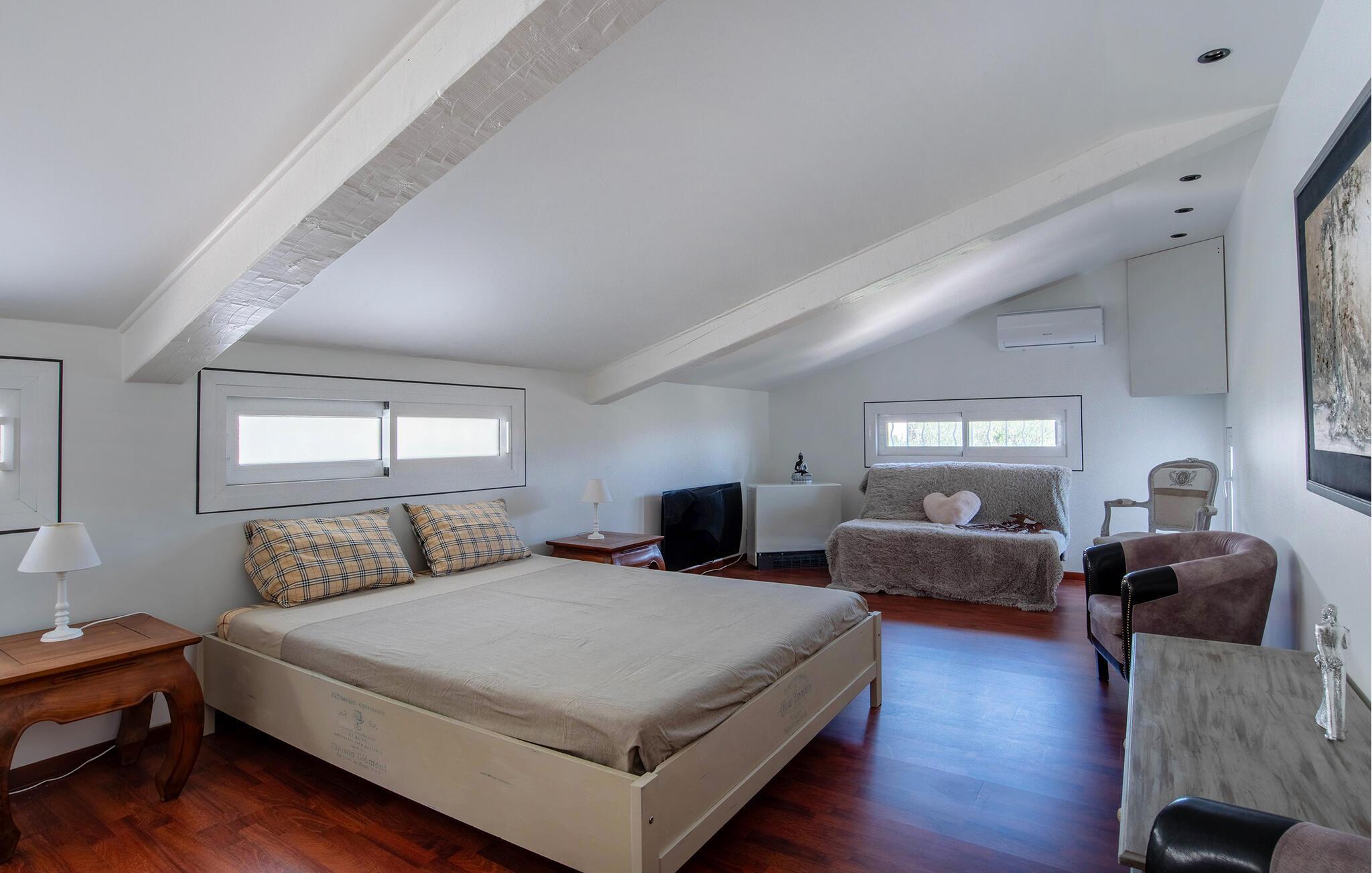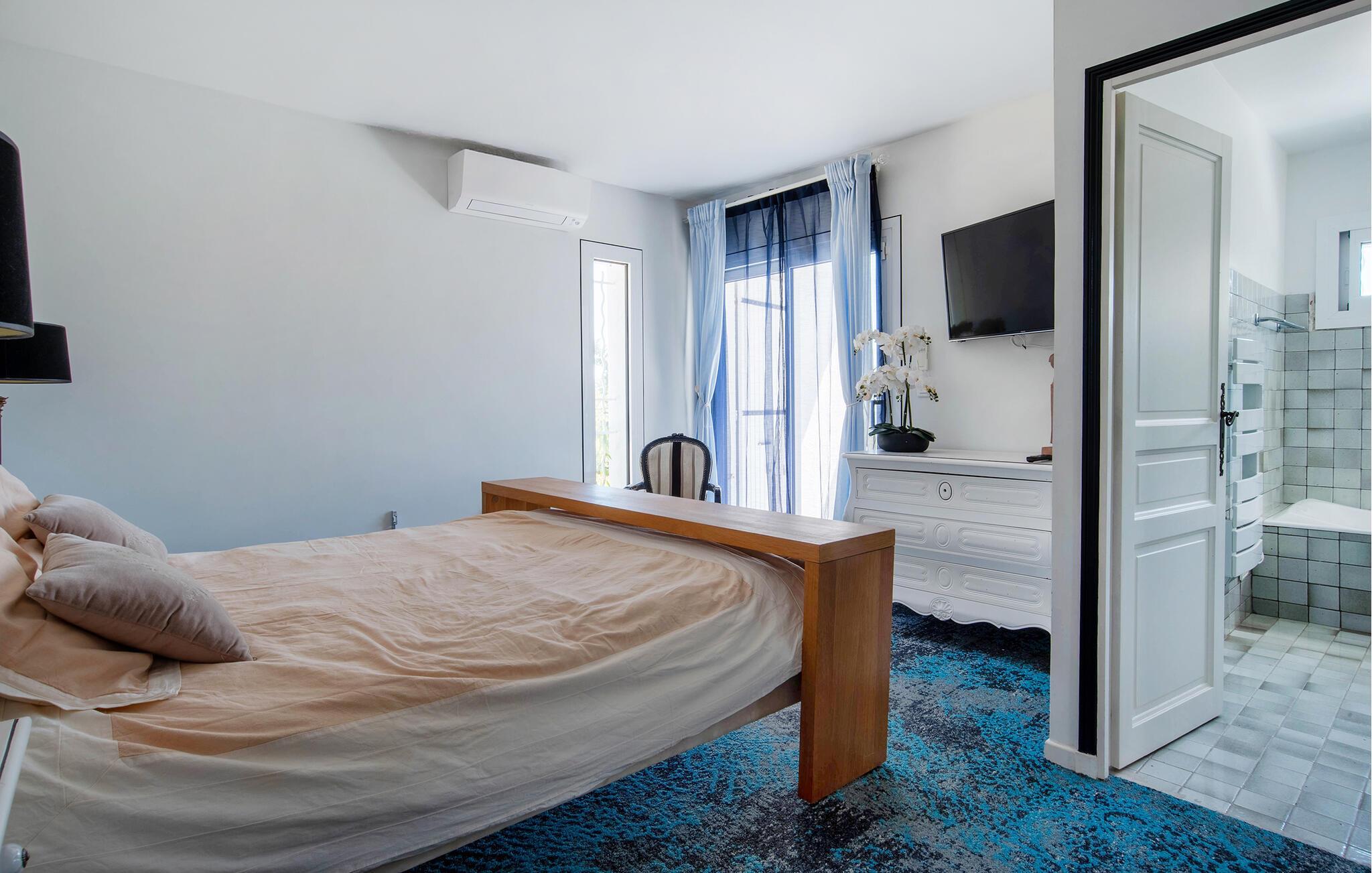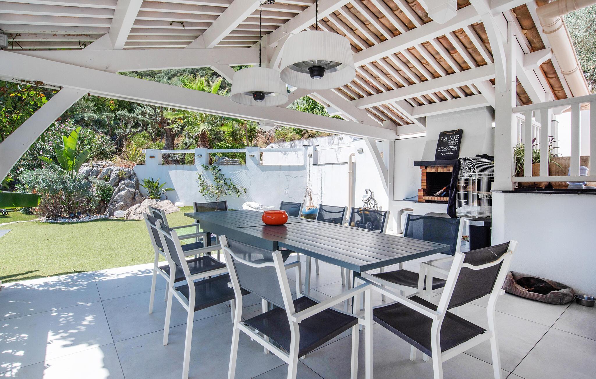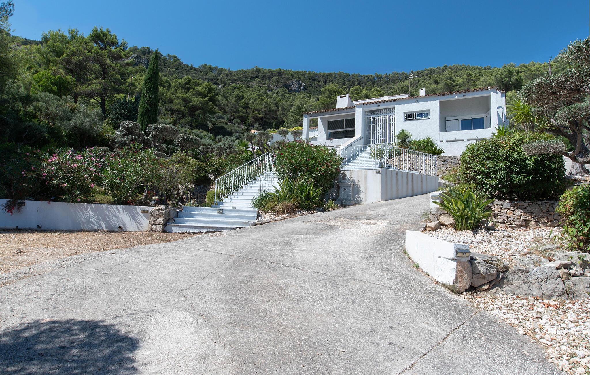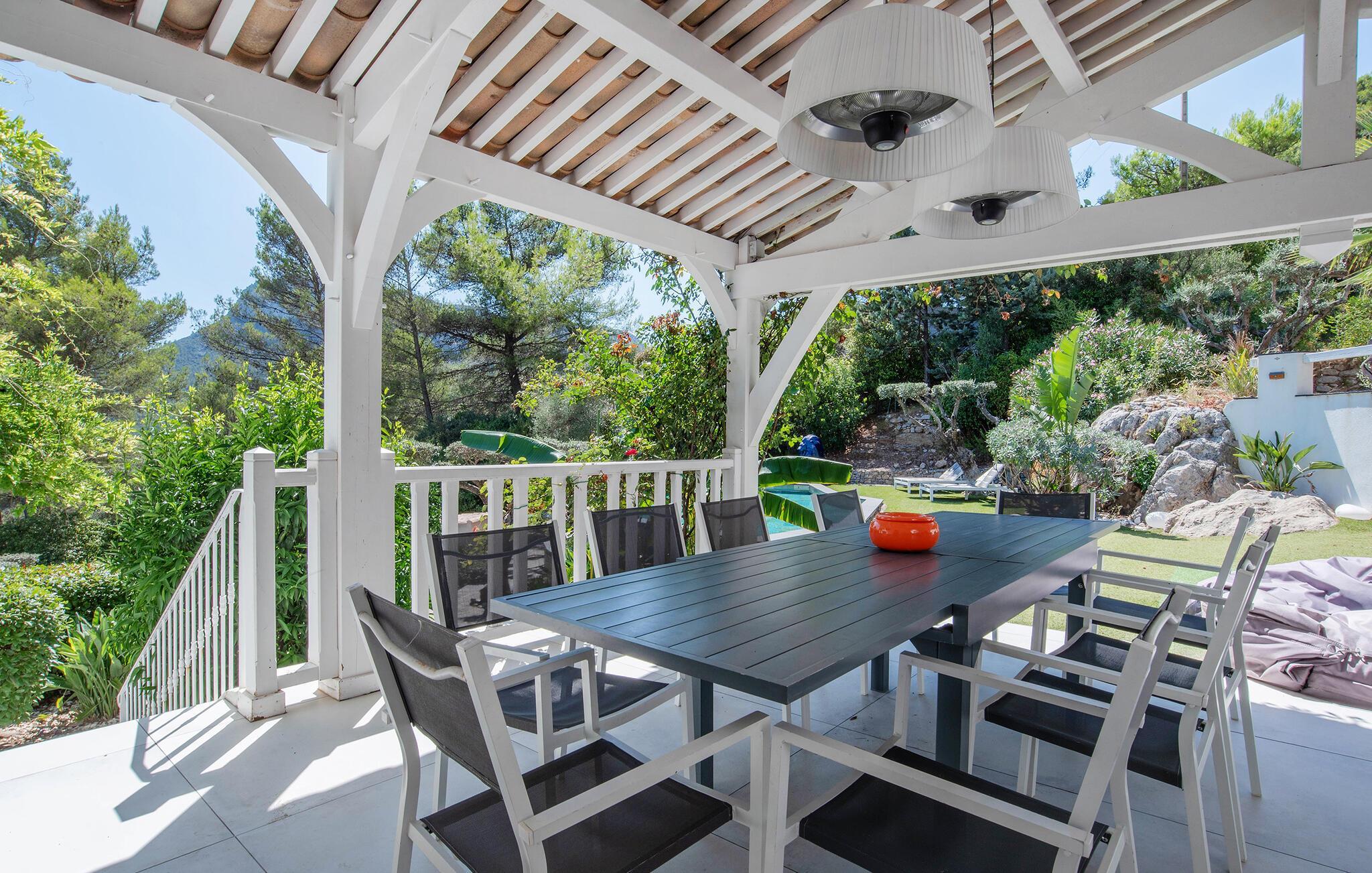 Forkæl jer selv med en afslappende ferie i dette feriehus med infinity-pool, spabad og panoramaudsigt i en idyllisk beliggenhed. Denne pragtfulde villa har en privilegeret beliggenhed på højderne i Solliès-Ville og forkæler jer med elegant og komfortabelt interiør og rigelig plads til familien. Glæd jer til hyggelig madlavning og fælles måltider, og snak om svundne tider i den lyse stue. Det charmerende udendørsområde har en spektakulær infinity-pool med udsigt over bakkerne og et spabad til afslappende øjeblikke under stjernerne. Brug den smukke terrasse til morgenmad om morgenen eller en stemningsfuld middag, og forkæl jer selv med en drink med en betagende udsigt, der strækker sig helt til Giens-halvøen. Solbad på de paradisiske strande på Giens-halvøen og udforsk de gyldne øer Porquerolles, Port-Cros og Le Levant på en bådtur. Gå en tur gennem det provencalske marked i Toulon og nyd havnens middelhavsstemning. Udforsk de maleriske landsbyer Le Lavandou og Bormes-les-Mimosas eller tag en vandretur gennem vinmarkerne. Bemærk venligst: Grillfester og fester er ikke tilladt i denne rolige, skovklædte beliggenhed.