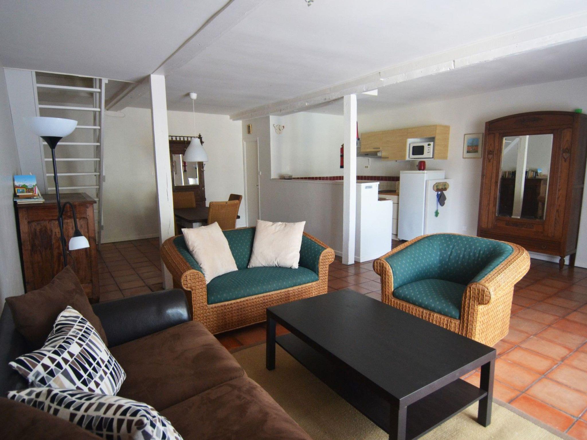 This spacious gite for five people offers 72m² of living space on two floors. The ground floor has a spacious living room, a well-equipped open-plan kitchen with dishwasher, vitroceramic hob, microwave, fridge-freezer, coffee machine, kettle, toaster and plenty of crockery and cutlery, and a separate storage room. The upper floor has a bedroom with a double bed and a bedroom with two single beds, as well as a separate toilet and a bathroom with a shower and a sink.