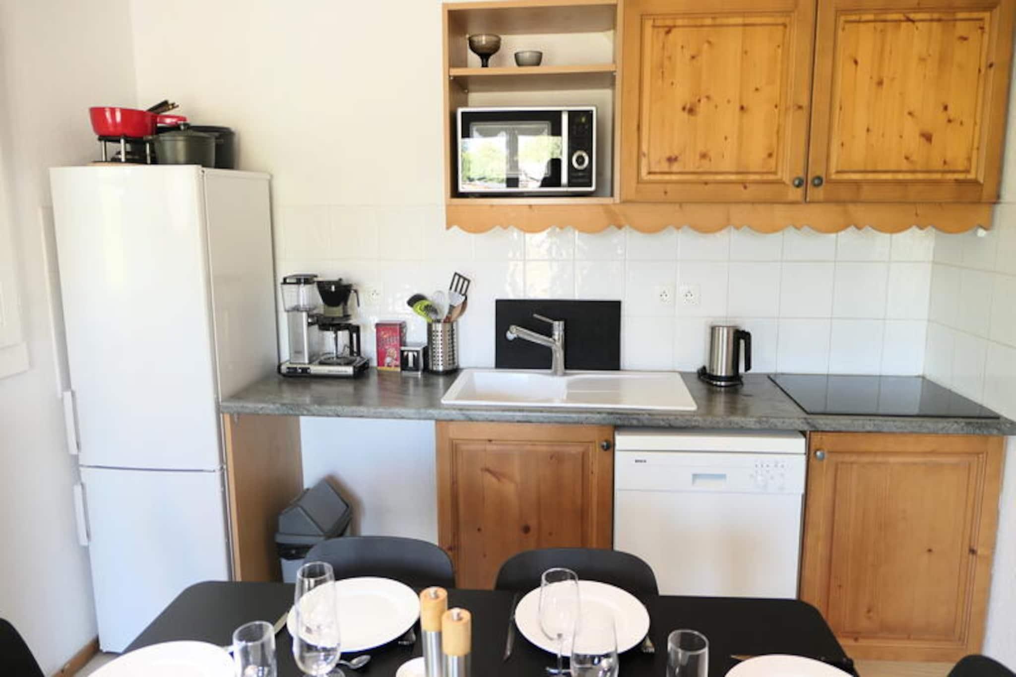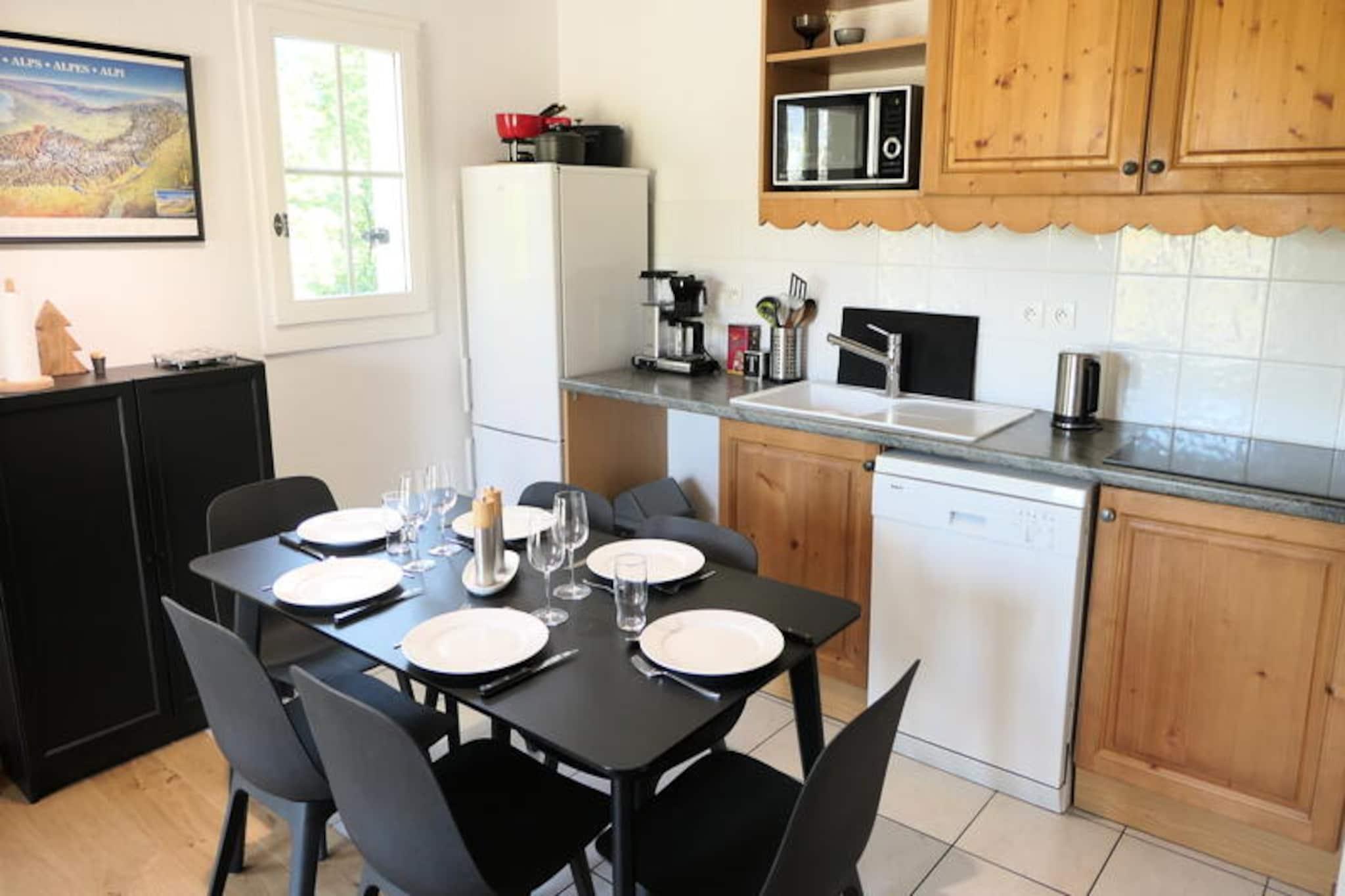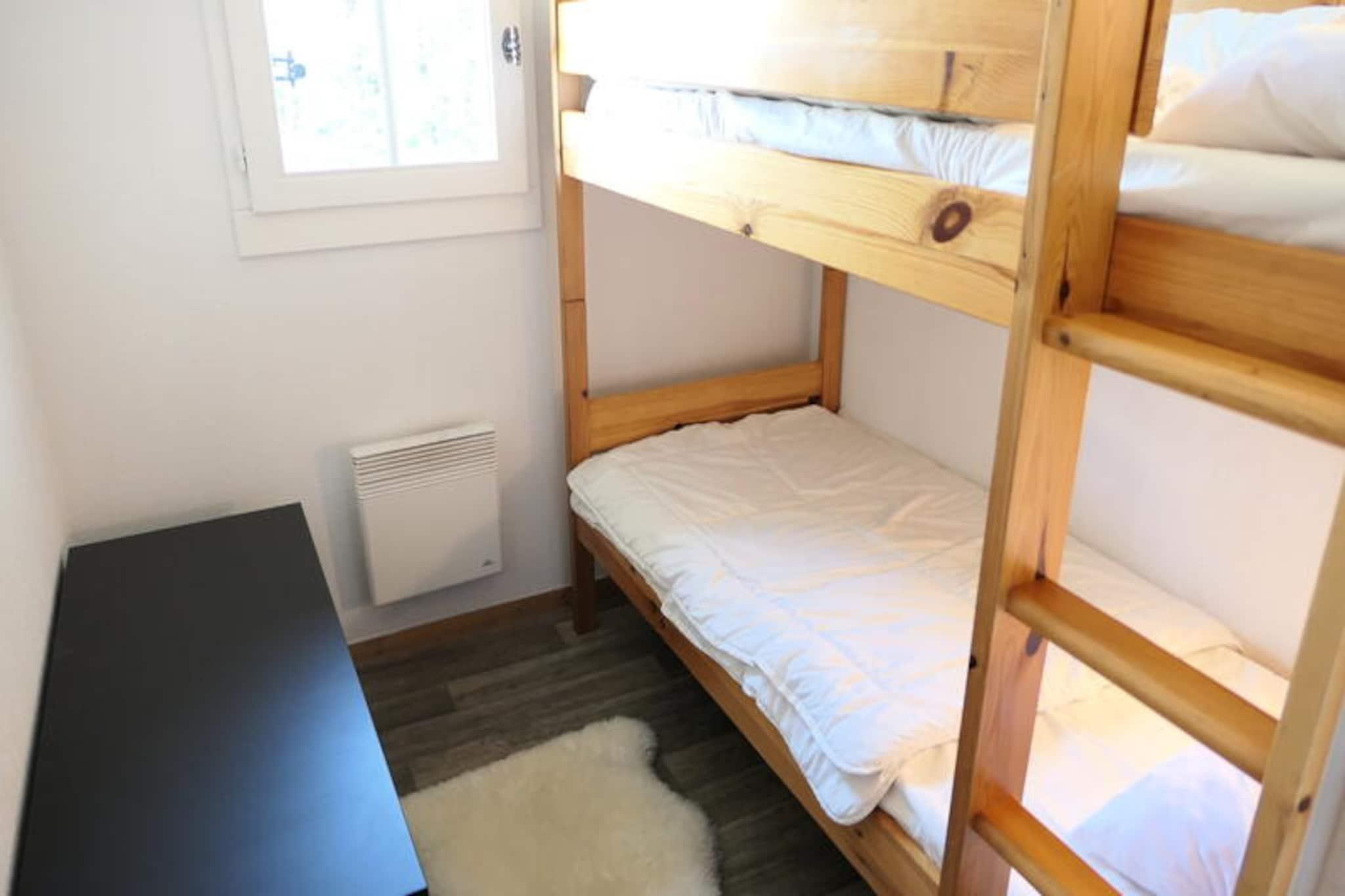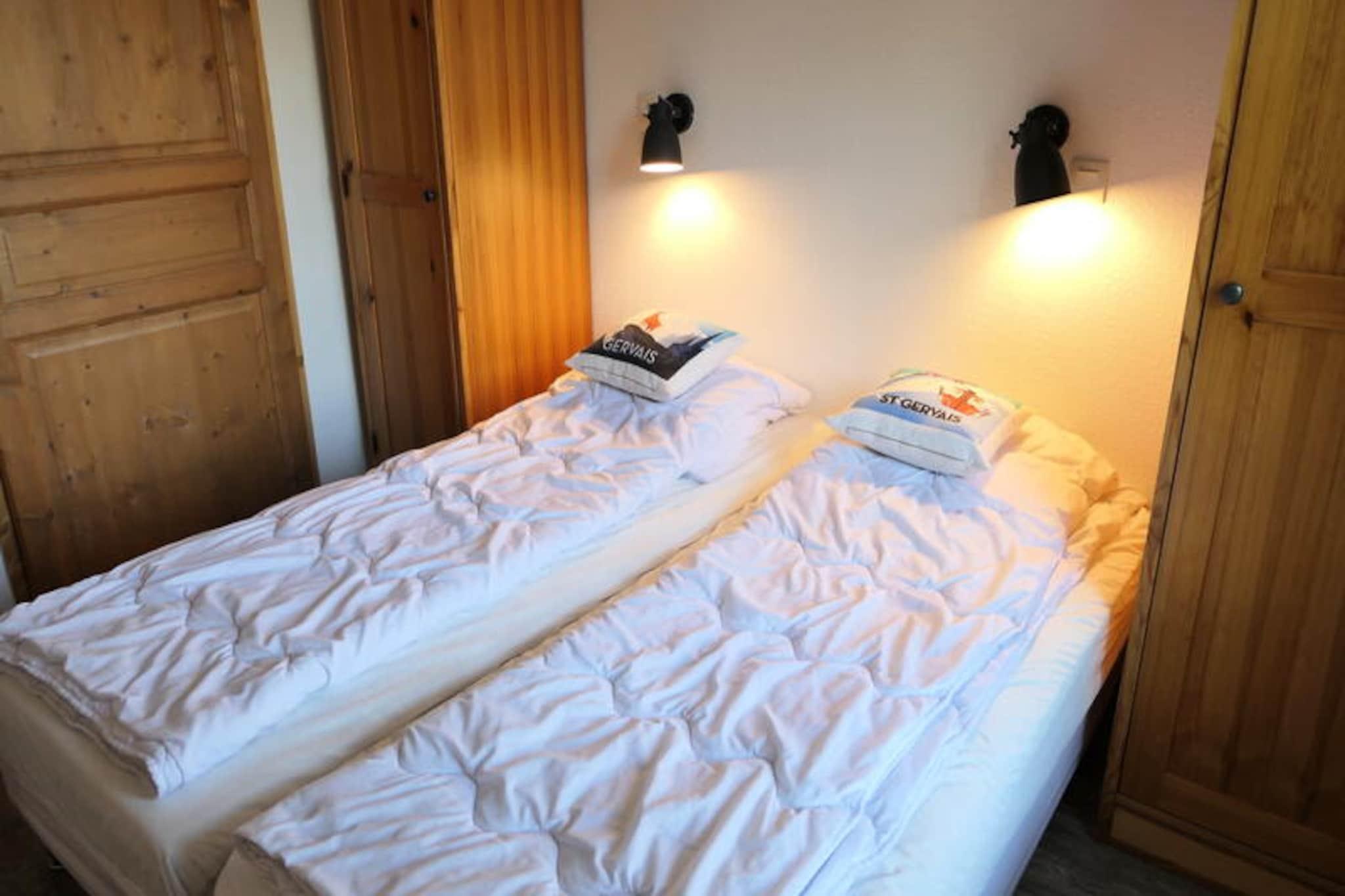 Med den majestætiske Mont Blanc som baggrund tilbyder denne charmerende lejlighed i Grand Panorama-residensen et idyllisk alpint tilflugtssted i Saint-Gervais. Kun 50 meter fra Saint-Gervais-svævebanen har du problemfri adgang til det vidtstrakte skiområde Evasion Mont-Blanc, perfekt til vintersportsentusiaster. Om sommeren inviterer den opvarmede udendørs pool dig til at slappe af under bjergsolen og skabe et paradis for eventyr året rundt. Residensens nærhed til landsbyens centrum, kun 800 meter væk, betyder, at du aldrig er langt fra lokale bagerier, butikker og restauranter, der blander bekvemmelighed med ro. \n\nDenne omhyggeligt designede lejlighed på 44 m² har komfortabel plads til op til seks gæster, hvilket gør den ideel til familier eller vennegrupper. Beliggende på 4. sal har den to nordvendte altaner med en fredfyldt udsigt over de omkringliggende tinder. Indenfor har stuen en hyggelig sovesofa, et tv og en spiseplads, mens det fuldt udstyrede køkken inkluderer moderne apparater såsom keramisk kogeplade, mikrobølgeovn, opvaskemaskine og endda et fonduesæt til autentiske alpine aftener. Sovepladserne inkluderer et soveværelse med to enkeltsenge, en kahyt med køjesenge og ekstra soveplads i stuen. To badeværelser, det ene med badekar og det andet med bruser, sikrer komfort for alle gæster.\n\nEjendommen tilbyder også praktiske faciliteter såsom garage, skiboks og valgfrie tjenester som Wi-Fi og udlejning af sengelinned. Uanset om du står på ski ned ad uberørte pister, vandrer på naturskønne stier eller blot nyder charmen ved Saint-Gervais, er denne lejlighed den perfekte base for uforglemmelige bjergminder. Med sin blanding af komfort, bekvemmelighed og betagende omgivelser er det en destination, der inviterer dig til at opleve det bedste af de franske alper.