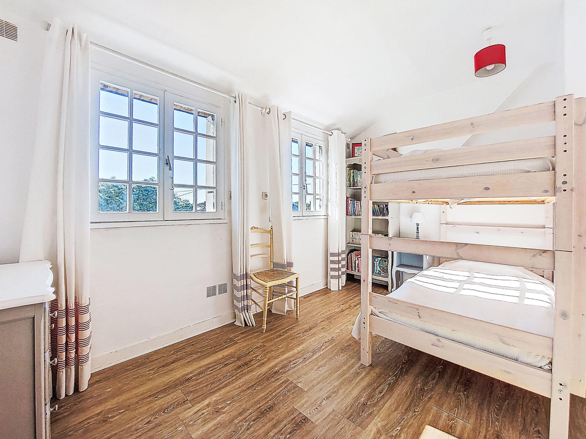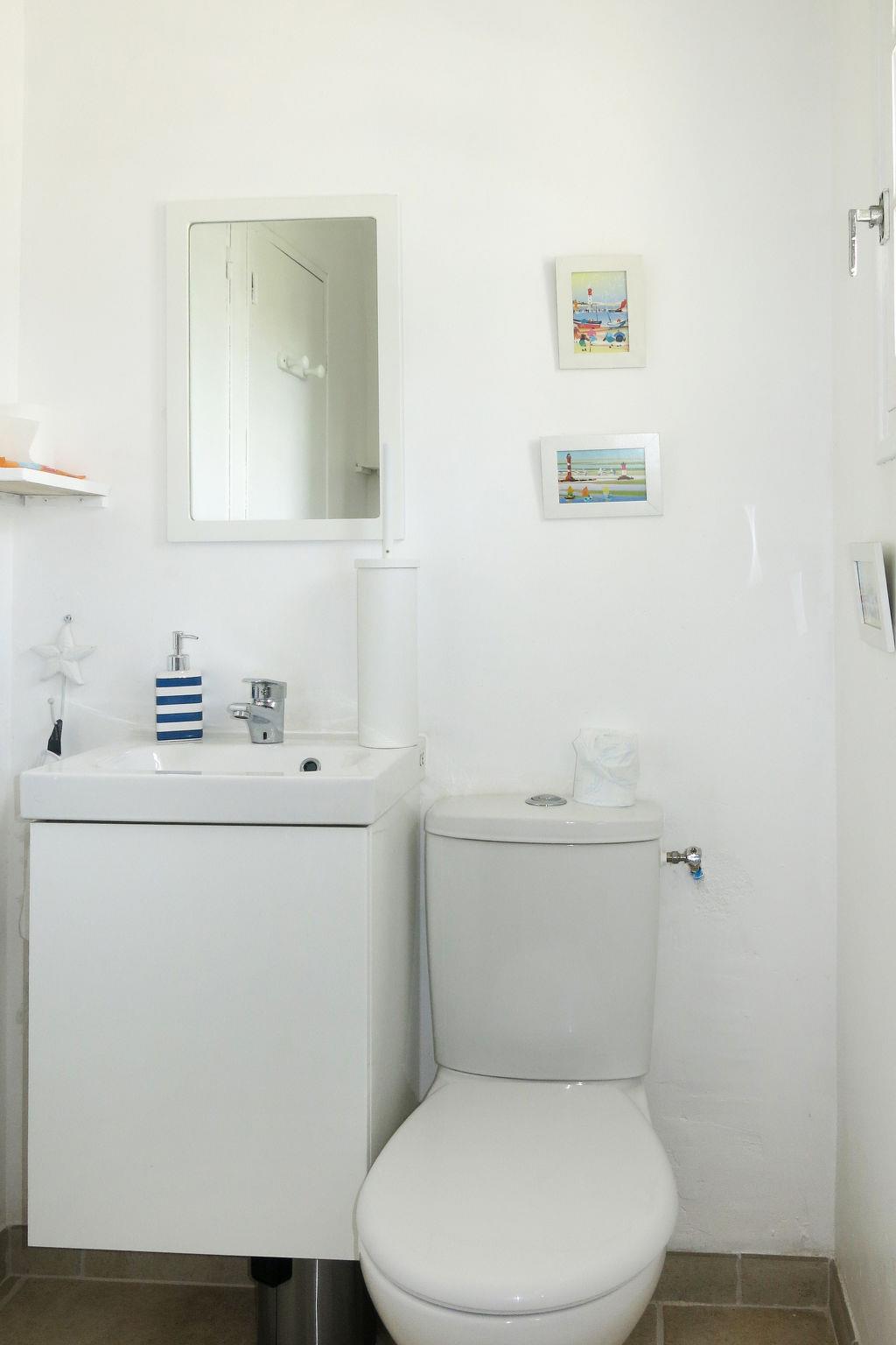 "Pen Er Guer", 7-room house 150 m2 on 2 levels. Object suitable for 8 adults. Bright, renovated in 2017, tasteful furnishings: living/dining room with open-hearth fireplace (only for decoration), dining table, TV and DVD. Exit to the terrace. 1 room with 1 double sofabed (140 cm, length 190 cm). Exit to the terrace. Kitchen (oven, dishwasher, 3 induction hot plates, toaster, kettle, microwave, freezer, electric coffee machine). Exit to the garden. Bathroom, shower/WC, sep. WC. Upper floor: 1 room with sloping ceilings with 1 french bed (140 cm, length 190 cm). 1 room with sloping ceilings with 2 beds (80 cm, length 200 cm). 1 room with sloping ceilings with 2 beds (80 cm, length 200 cm). 1 room with sloping ceilings with 1 pull-out bed (2 x 90 cm, length 190 cm). 1 room with sloping ceilings, 2 bunk beds (90 cm, length 190 cm). Shower, sep. WC. Electric heating, oil heating. Terrace. Terrace furniture, barbecue (portable), deck chairs (4). Facilities: washing machine, dryer, iron, children's high chair, baby cot for up to 2 year olds. Internet (WiFi, free). Please note: non-smoking house. Maximum 1 pet/ dog allowed. Smoke alarm. Bed layout is flexible. There are more sleeping options available than the maximum number of people allowed which may, however, not be exceeded. 56214000250RP