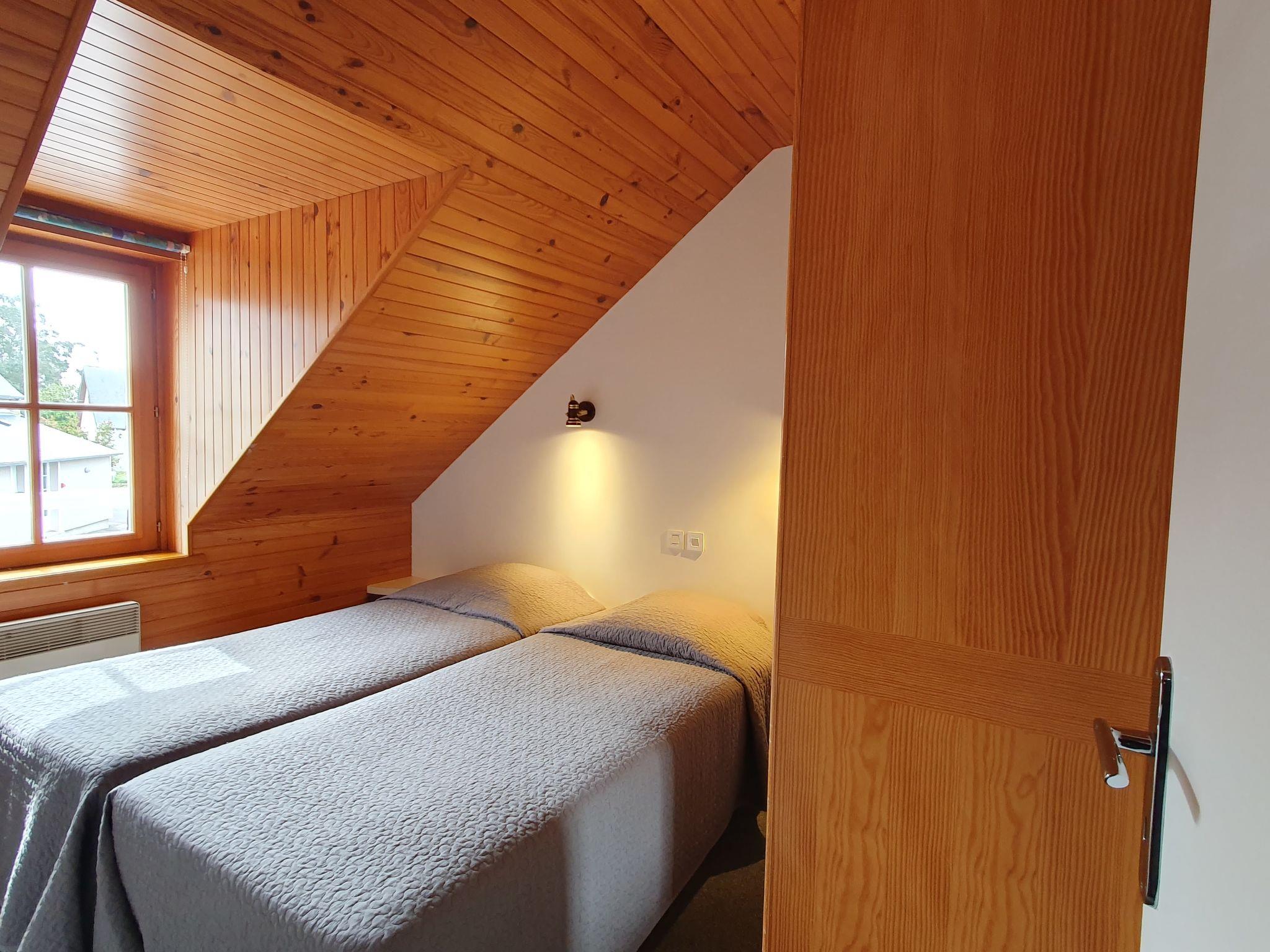 "La Bisquine", 3-room maisonette 32 m2. Comfortable and tasteful furnishings: living/dining room with TV (flat screen). Exit to the terrace. Open kitchen (2 hot plates, mini-oven, dishwasher, toaster, kettle, microwave, electric coffee machine). Exit to the terrace. Shower, sep. WC. Electric heating. Upper floor: 1 room with sloping ceilings with 1 french bed (2 x 90 cm, length 190 cm). 1 room with sloping ceilings with 2 beds (90 cm, length 190 cm). Terrace 10 m2. Terrace furniture, barbecue. Facilities: washing machine, hair dryer. Internet (WiFi, free). Garage on the property. Please note: smoke alarm. Offer by a commercial proprietor according to Art. 155, IV, CGI