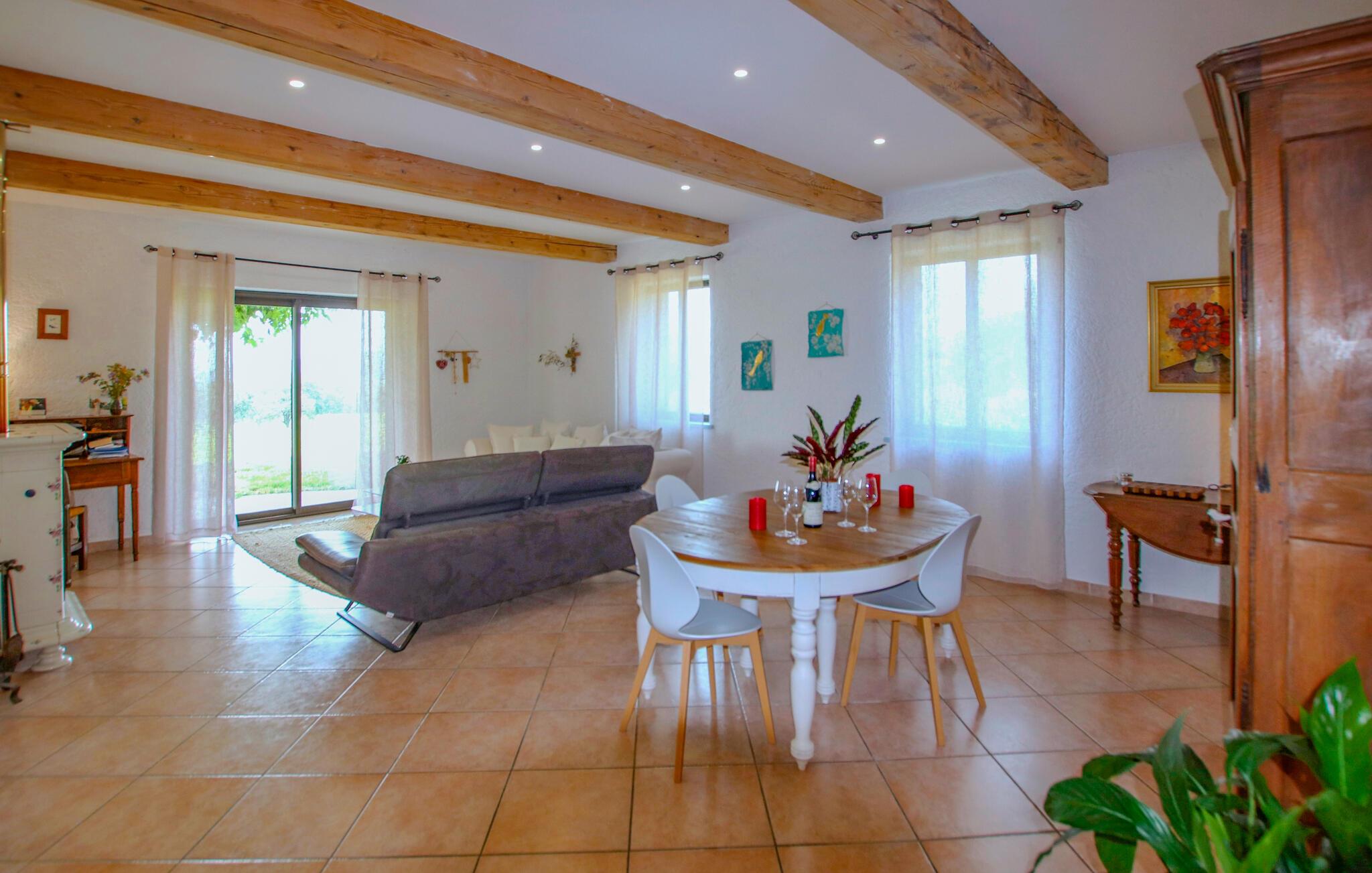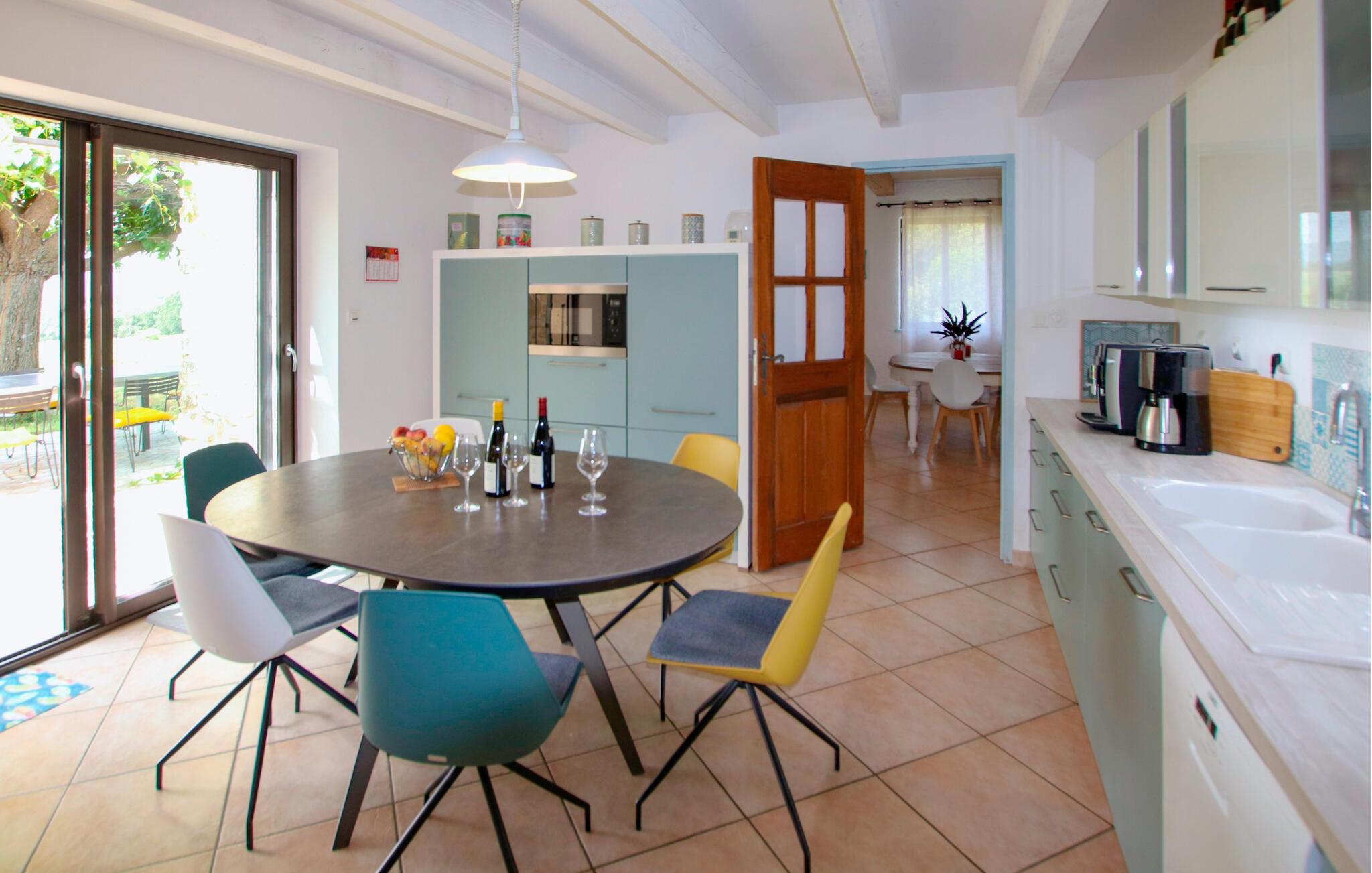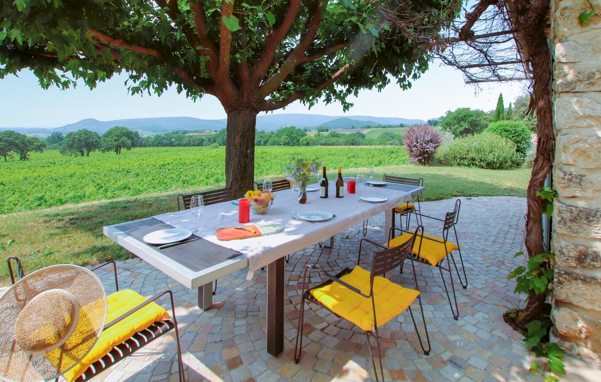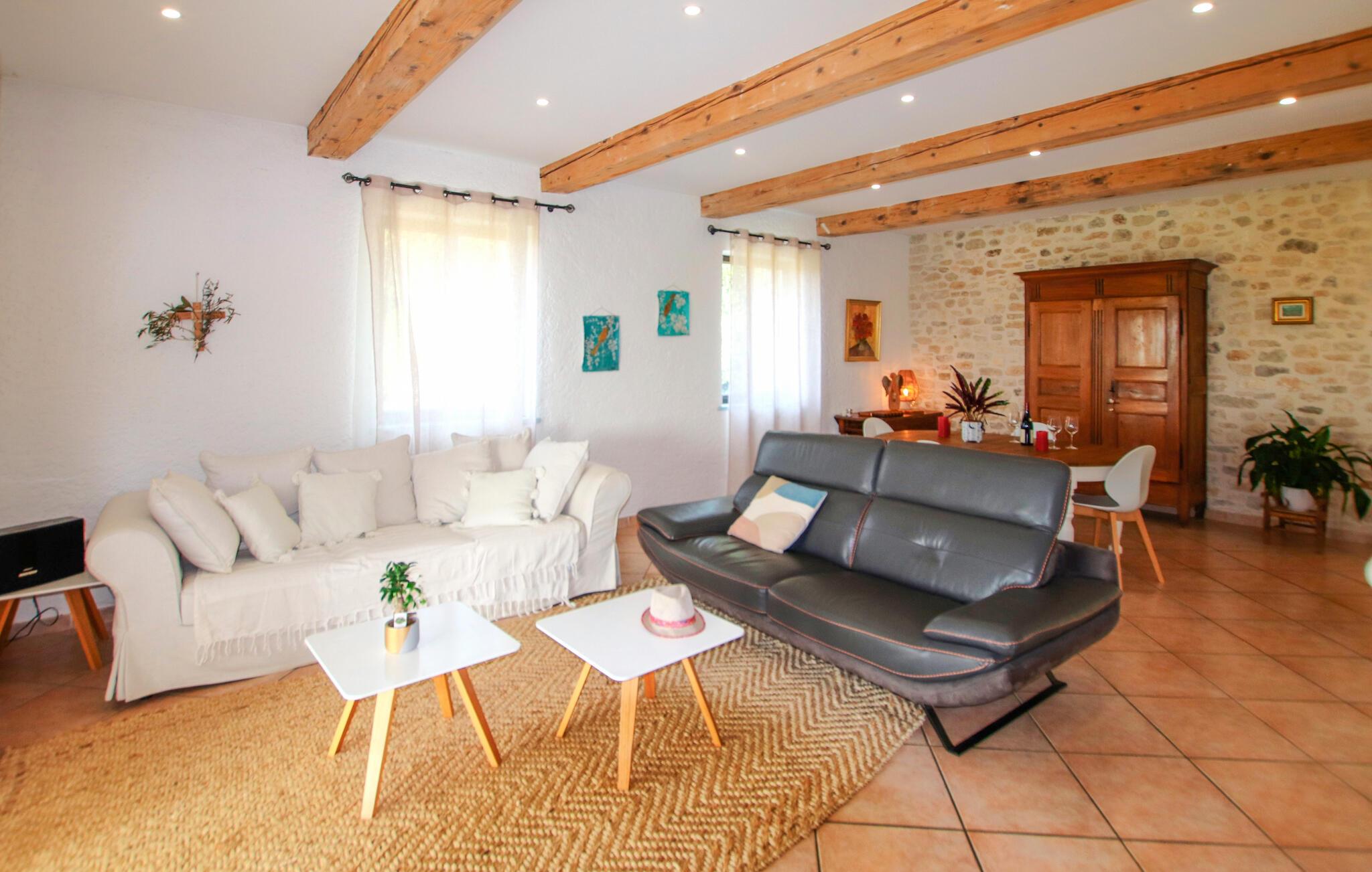 Tilbring uforglemmelige dage i dette provencalske feriehus med pool i en idyllisk beliggenhed. Denne karakterfulde oase af ro byder jer velkommen mellem de imponerende Gorges de l'Ardèche, den vidtstrakte Rhône-dal og den frodige Ibie-dal. Lad jer betage af det rummelige, lyse opholdsområde - ideelt til en stor familie eller en gruppe venner. Glæd jer til masser af komfort med kærligt udvalgte møbler i fint træ og velholdte naturstensvægge. Jeres feriehus ligger på en fortryllende grund med udsigt over en stor vingård. Nyd jeres måltider under skyggefulde vinstokke, slap af i poolen og nyd den fredelige atmosfære, mens I læser eller nipper til et glas regional vin. Besøg middelalderbyen Saint-Montan med dens charmerende klatreruter, vandrestier og autentiske bistroer. Udforsk Grotte de Saint-Marcel, Chauvet-hulen eller den spektakulære Gouffre de l'Aven d'Orgnac. Besøg renæssanceslottet Château de Grignan, fæstningen Suze-la-Rousse eller den gamle by Alba-la-Romaine. Nyd vandsport ved Lac de Pigne Doré, prøv nougat i Montélimar, eller tag en kanotur gennem Ardèche-kløften.
