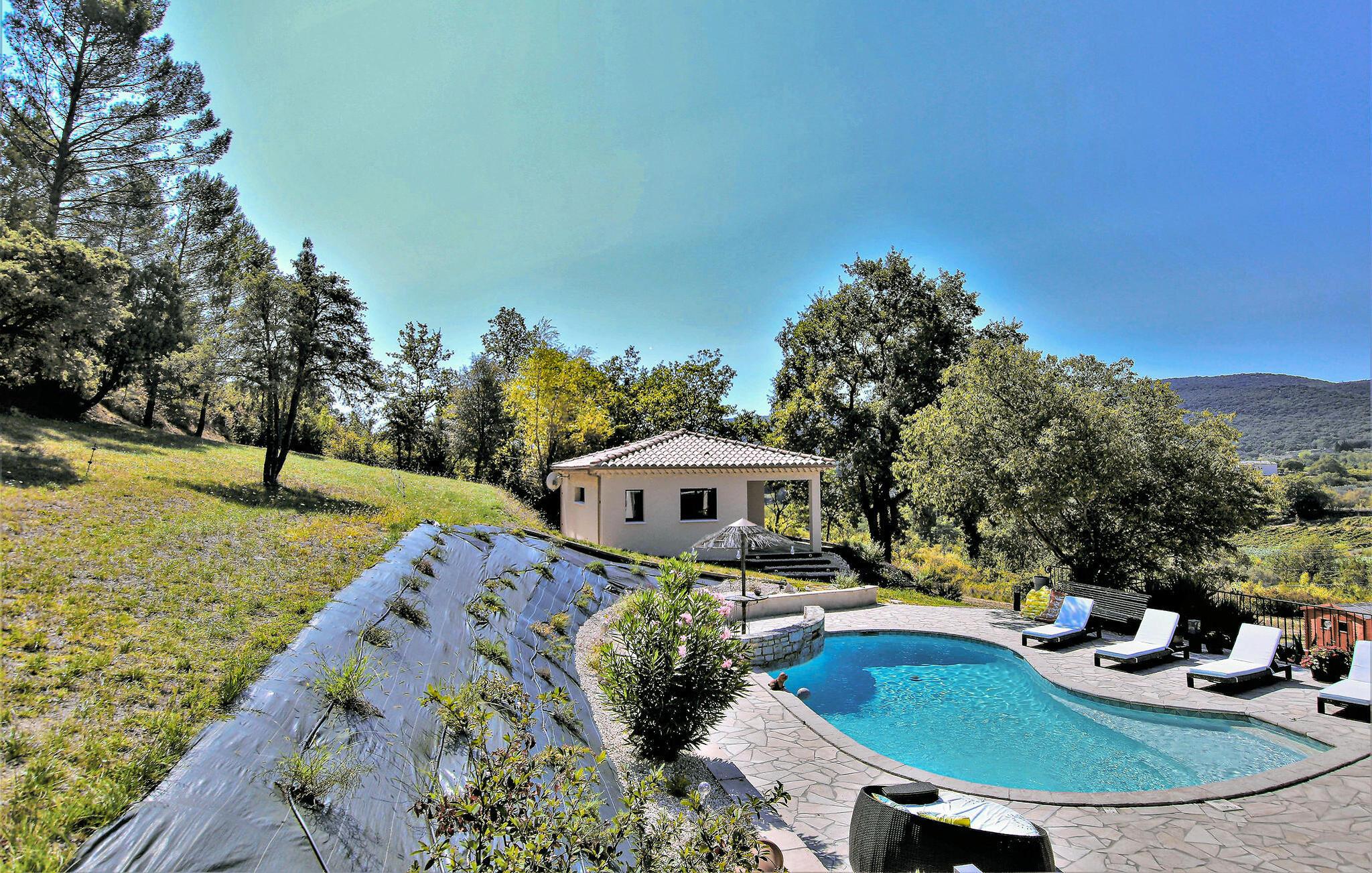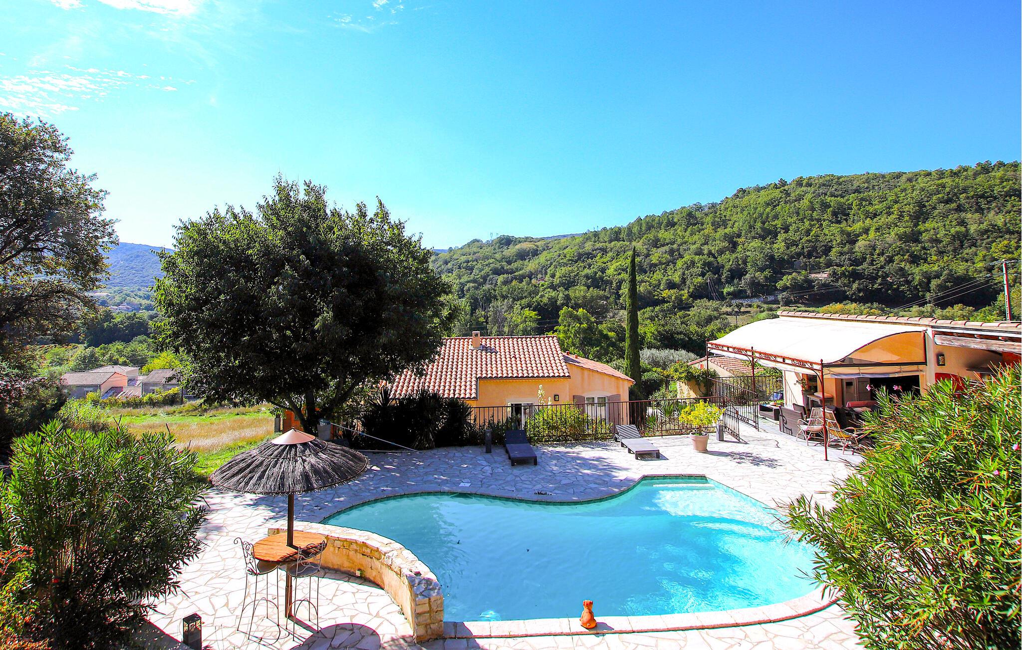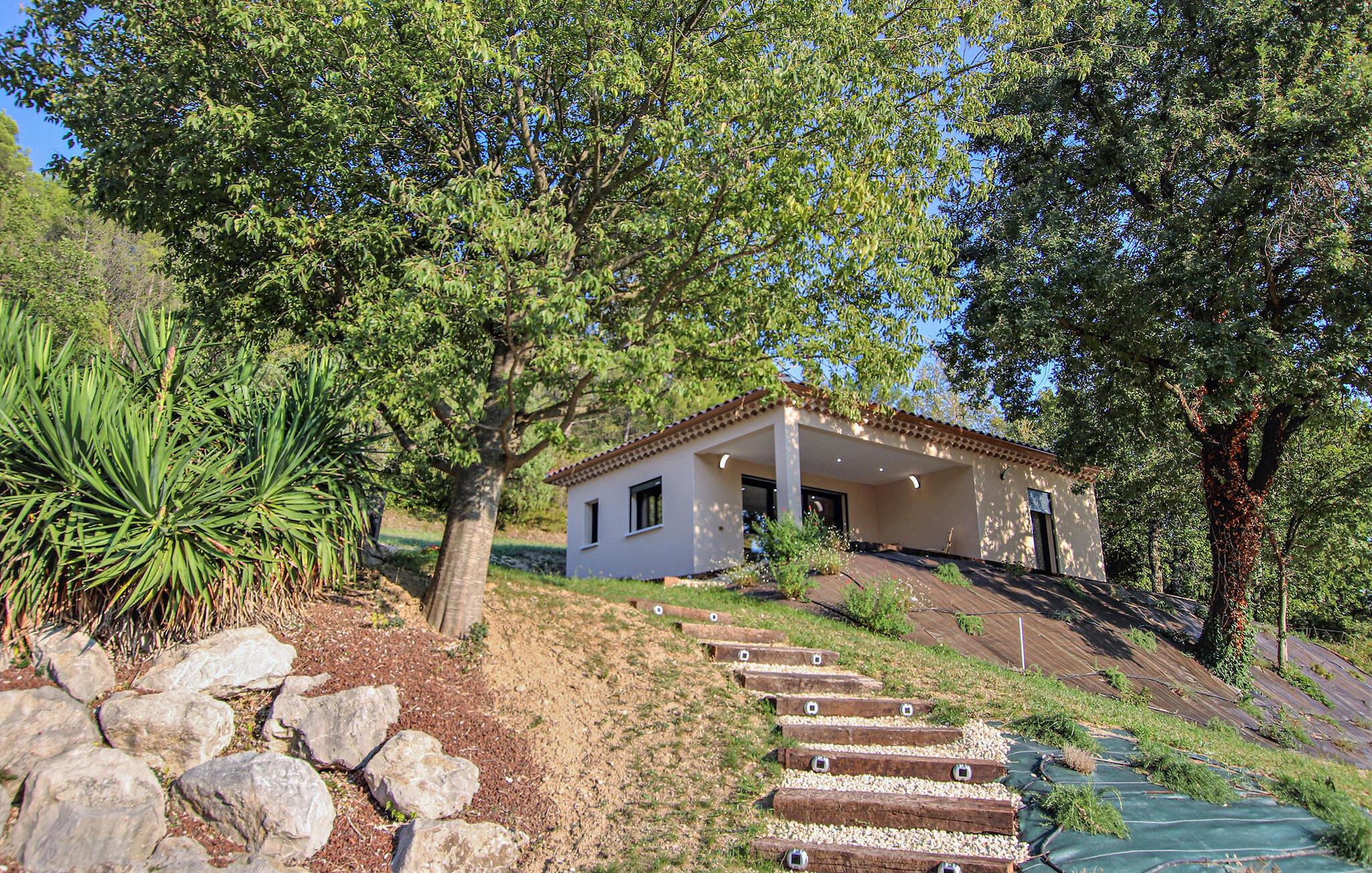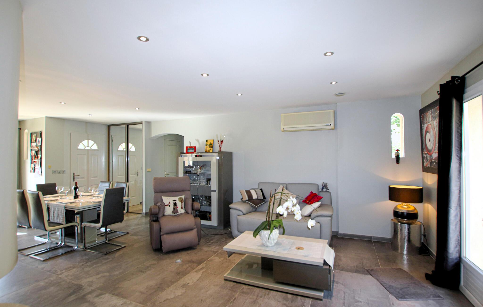Din feriedestination er kendt for sine klatreområder, vandrestier samt sine kroer og gourmetbistroer. Nyd en moderne provencalsk villa beliggende på en stor, idyllisk grund. Husets indretning består af to hyggelige og komfortable områder lavet af materialer af høj kvalitet – ideelt til store familier eller par, der samles. Gør det behageligt i den indbydende stue med pejs. De moderne møbler er stilfulde og omhyggeligt designet.
