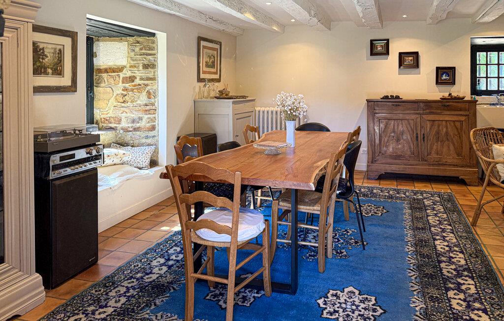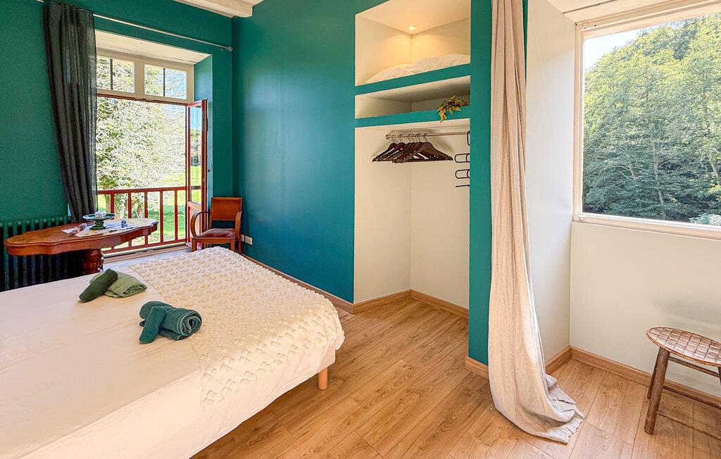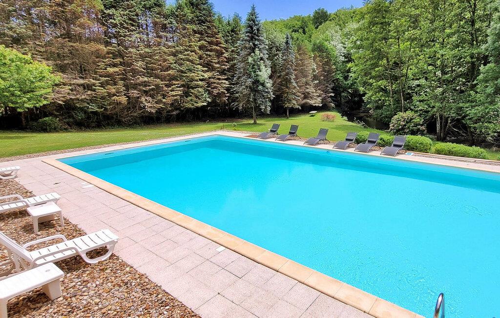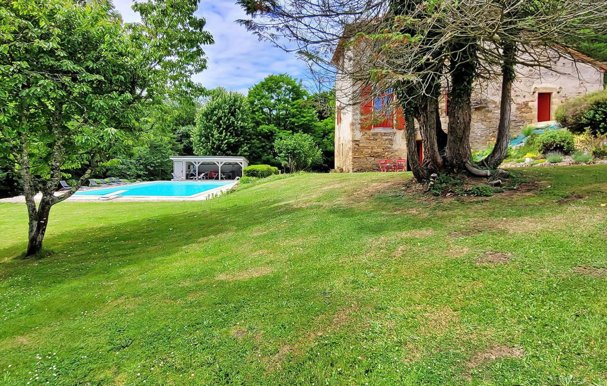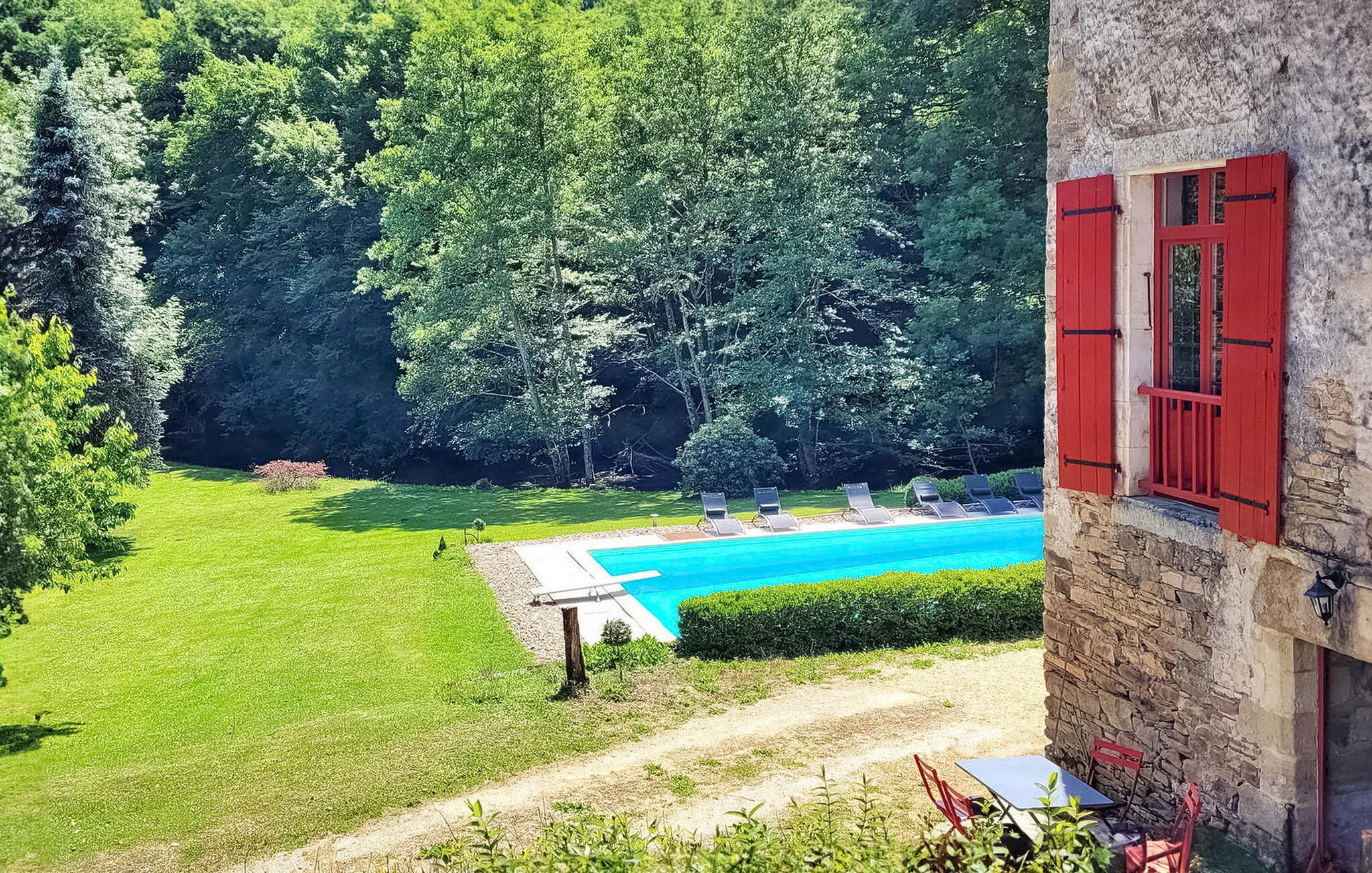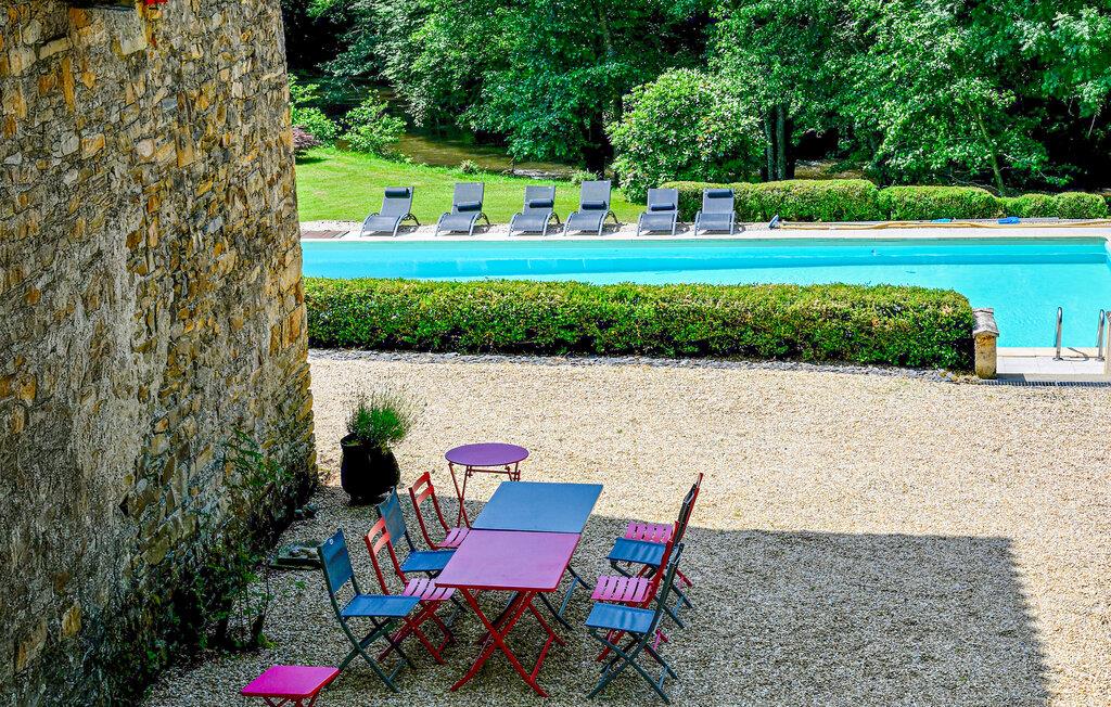 Dette landsted i Saint-Paul-la-Roche, Green Perigord Vert, har en stor privat pool (18m x 8m) beliggende i naturlige omgivelser langs floden L'isle. Ejendommen byder på et veludstyret køkken med direkte udendørs adgang og en rummelig spise-/stue med pejs i stueetagen. De komfortable værelser er placeret på første og anden sal. Udendørs byder ejendommen på en stor have med et skovområde og en ekspansiv pool omkranset af 800 m flodbredde, med vippebræt og natbelysning. Ejendommen omfatter også et overdækket poolhus med spisning og en bar med køleskab samt liggestole og en plancha til udendørs madlavning. Gæsterne kan nyde picnic ved floden ved hjælp af det medfølgende bord og liggestole. Ejendommen har flere terrasser med siddepladser og spisepladser, der tilbyder smuk udsigt og nem adgang til køkken og spiseplads. Steder at besøge under dit ophold: Brantome: Venedig i Périgord. Charmerende by med en idyllisk atmosfære, hvor man kan gå, shoppe og spise, men hvor man også kan tage på en hyggelig kanotur. Broerne, der spænder over kanalerne, fører dig til de mange terrasser, hvor du kan smage det lokale køkken. Hver fredag morgen er der et hyggeligt marked. Jumilhac-le-Grand: Denne middelalderby har et smukt slot og et stort centralt torv med terrasser. Guldmuseet arrangerer Indledning til guldvaskning i floden. Bestil til tiden. Thiviers er foie grass hovedstad. Hver lørdag er der et traditionelt bondemarked med masser af regionale produkter.
