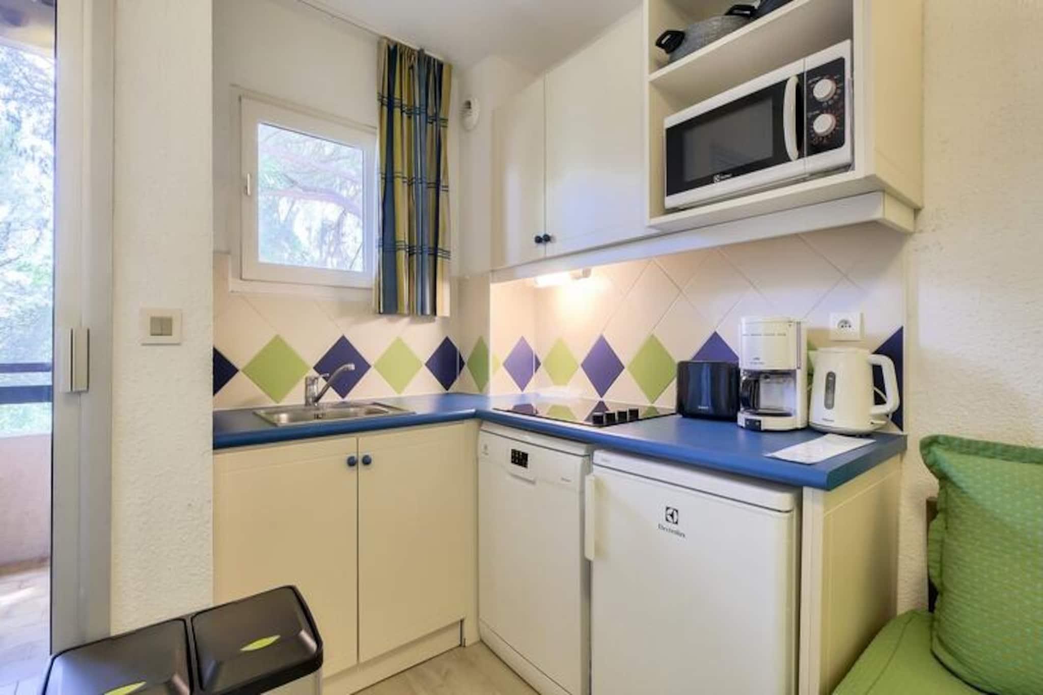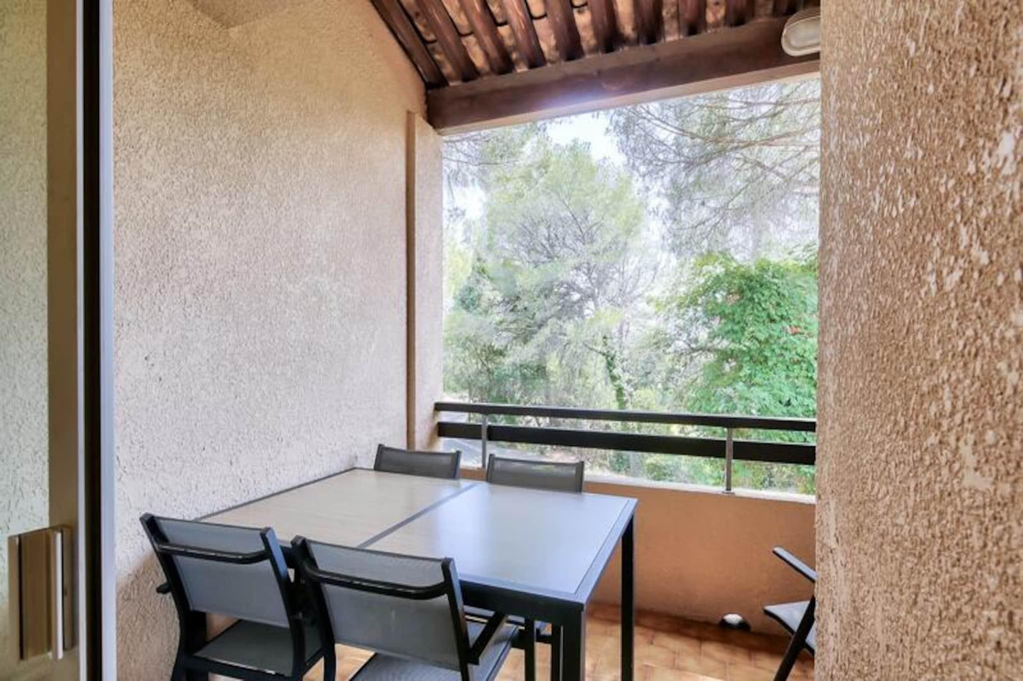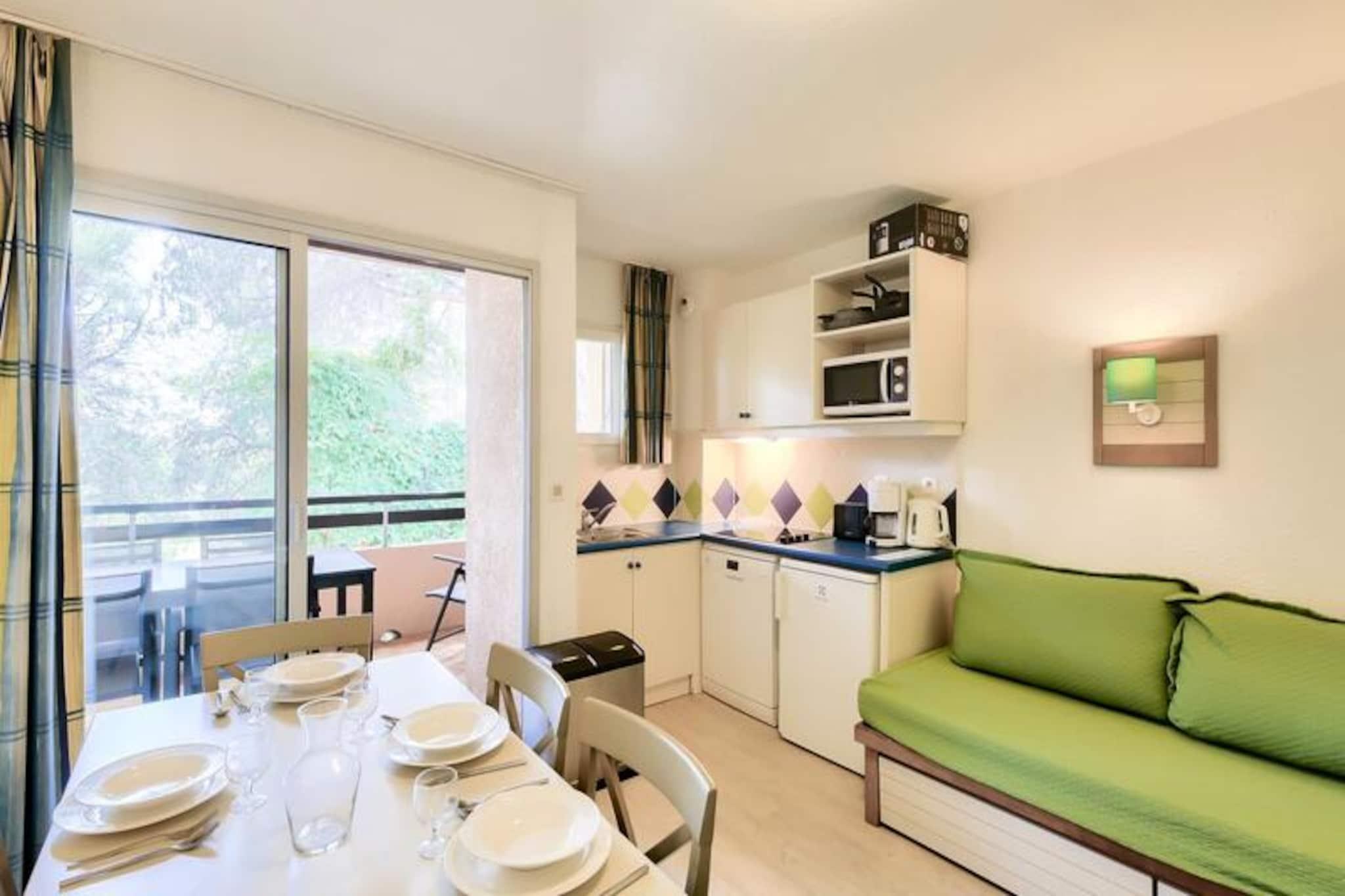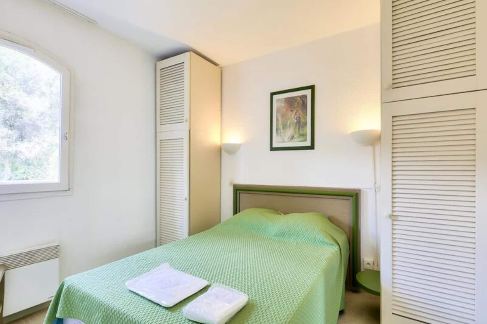 This cozy apartment in the heart of a charming village offers a relaxing stay with a double bed in the bedroom and additional single beds in the living room, accommodating up to 3 guests. The property is pet-friendly (additional fees may apply) and features a covered balcony with views of the forest. A mandatory cleaning fee applies at the end of the stay, and bed linens and towels are available at an extra charge. Free parking is provided for one vehicle, subject to availability. Located just 6 km from the historic village of Saint-Raphaël, this rental offers easy access to a variety of activities. The 18-hole Estérel golf course is just 400 meters away, and guests can enjoy six tennis courts or arcade games within the residence. The Mediterranean coastline is a short drive away, and guests can explore local spas, markets, and the scenic beauty of the area. During the summer months, a snack bar is available within the property, and a wellness area can be reserved for relaxation. The apartment includes an American-style kitchen, a bathroom with a bathtub, and a separate toilet. It is well-equipped for a comfortable stay with storage space, a hairdryer, and necessary amenities. The property features a large outdoor swimming pool, open from April to October, and additional services such as Wifi (for an extra charge) and a television. The apartment’s peaceful setting and convenient location make it ideal for a relaxing getaway.
