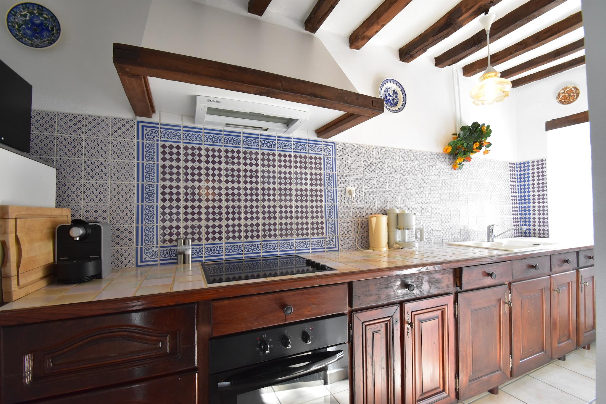 Stueetage: (entre, åbent køkken(elkedel, komfur(glaskeramisk), kaffemaskine, ovn, mikrobølgeovn, køle-fryseskab), stue / spisestue(spisebord, pejs, sofahjørne, stereoanlæg), toilet) På 1. etage: (soveværelse(dobbeltseng(140 x 190 cm), Fjernsyn(parabol, digital)), Soveværelse med badeværelse(dobbeltseng(160 x 200 cm), bruser, håndvask, toilet)) vaskemaskine, varme(elektrisk), have(deles med ejer, indhegnet), havemøbler, grill(elektrisk), parkering, cykler til rådighed, baby crib(free)
