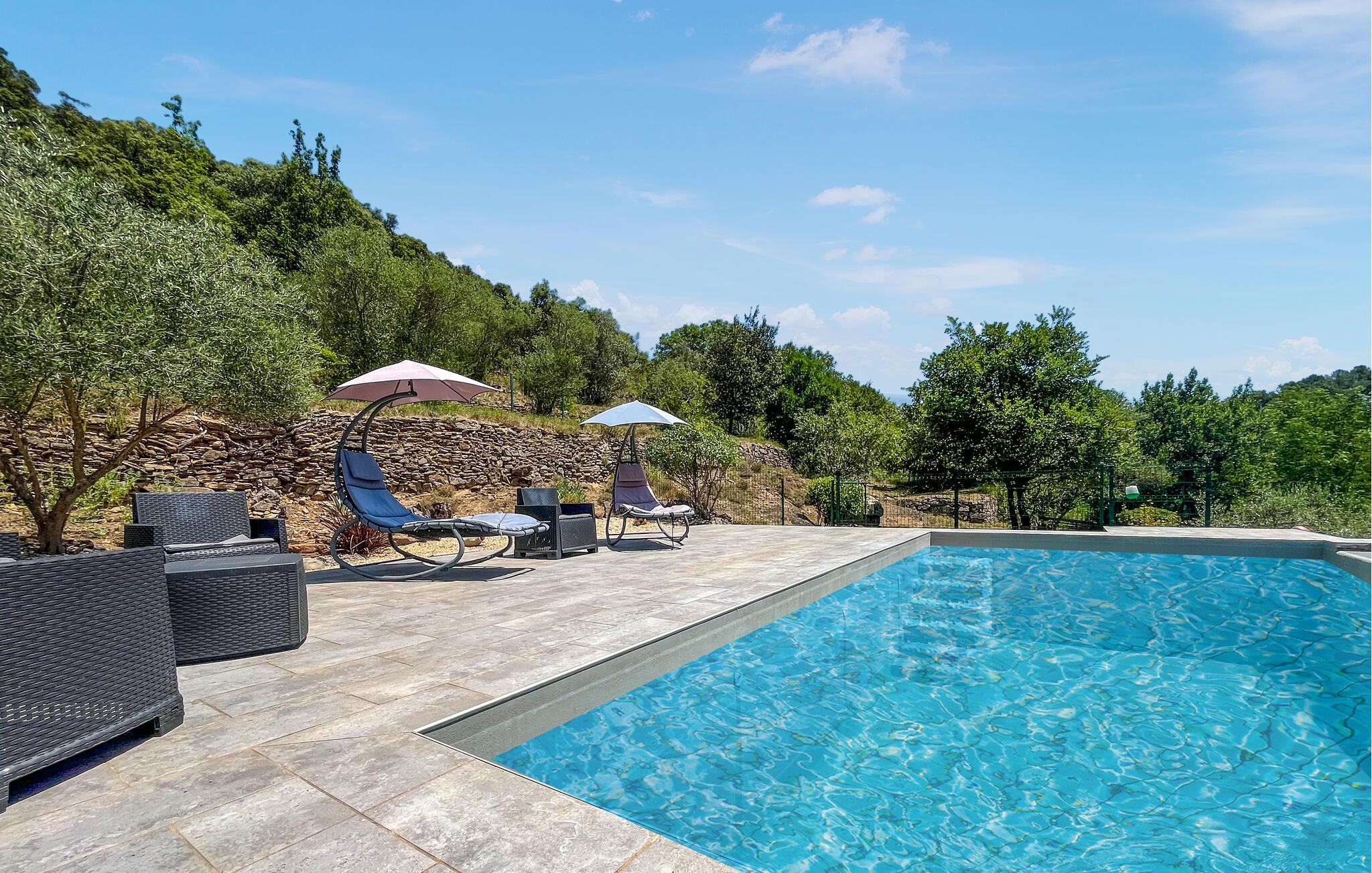 I den afsidesliggende pool kan I svømme baner og lade blikket vandre over de grønne bakker. Slap af på behagelige liggestole og nyd jeres tid sammen med stemningsfulde grillmiddage under stjernerne.