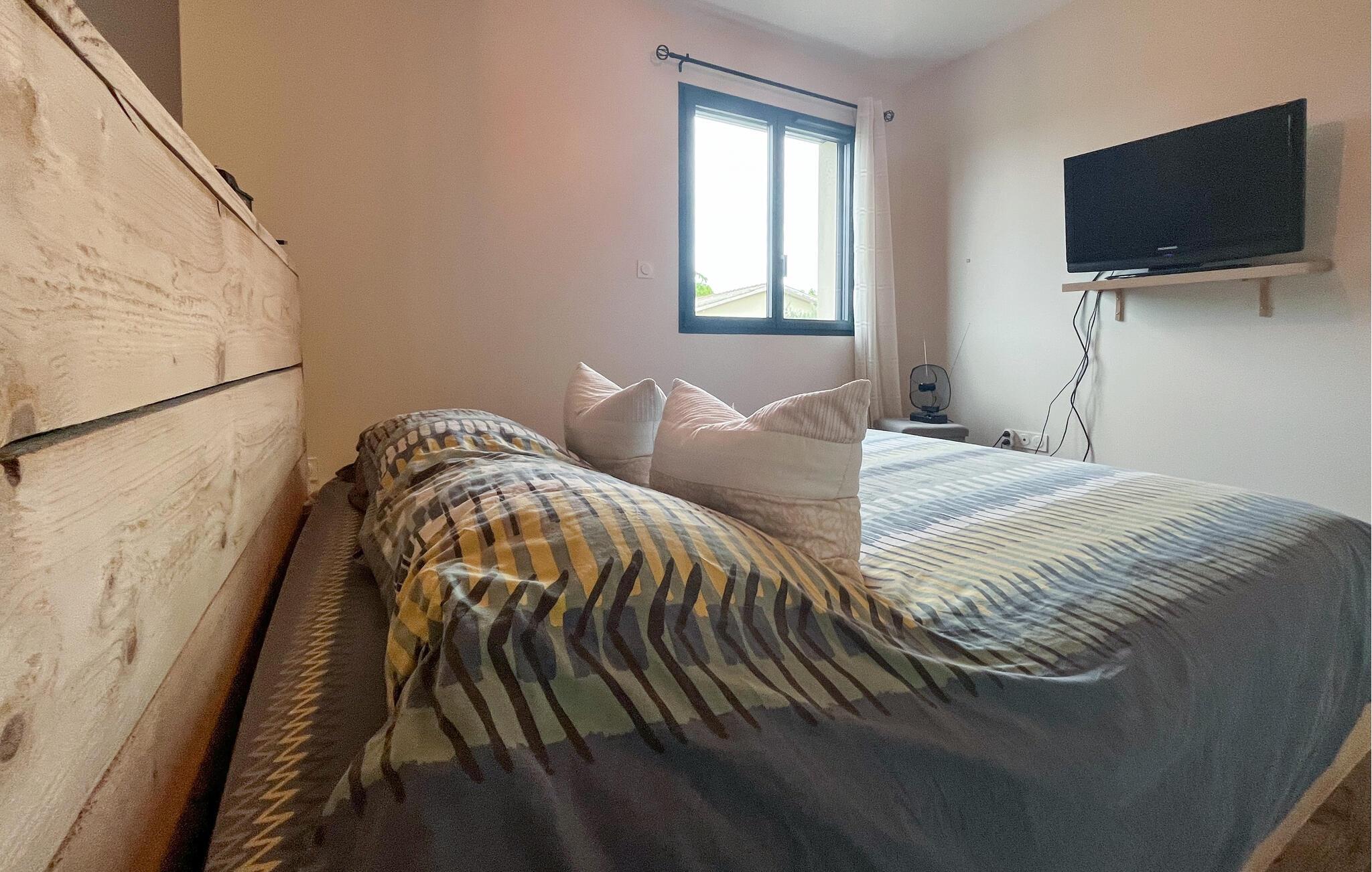 Tilbring en afslappende ferie i dette komfortable hjem, der tilbyder masser af plads til fælles tid og afslappende øjeblikke. Gør det behageligt i de komfortable sofaer i det åbne opholdsområde, hvor de store vinduer tilbyder udsigt over poolen. Tilbered jeres måltider i det moderne køkken med en køkkenø og nyd dem ved det stilfulde spisebord.