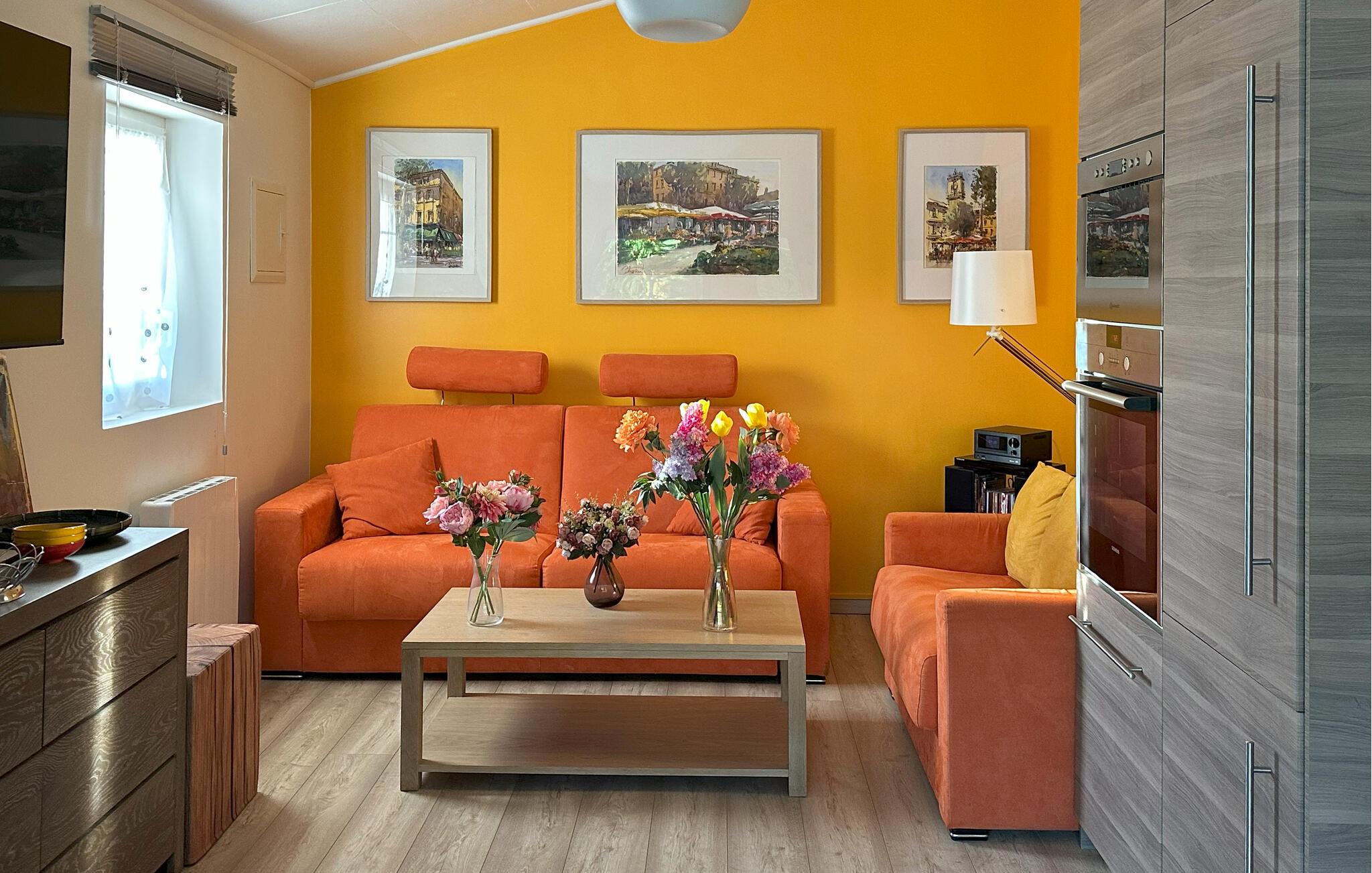 Soveværelse 4 med sovesofa har ingen dør og er adskilt af et forhæng.