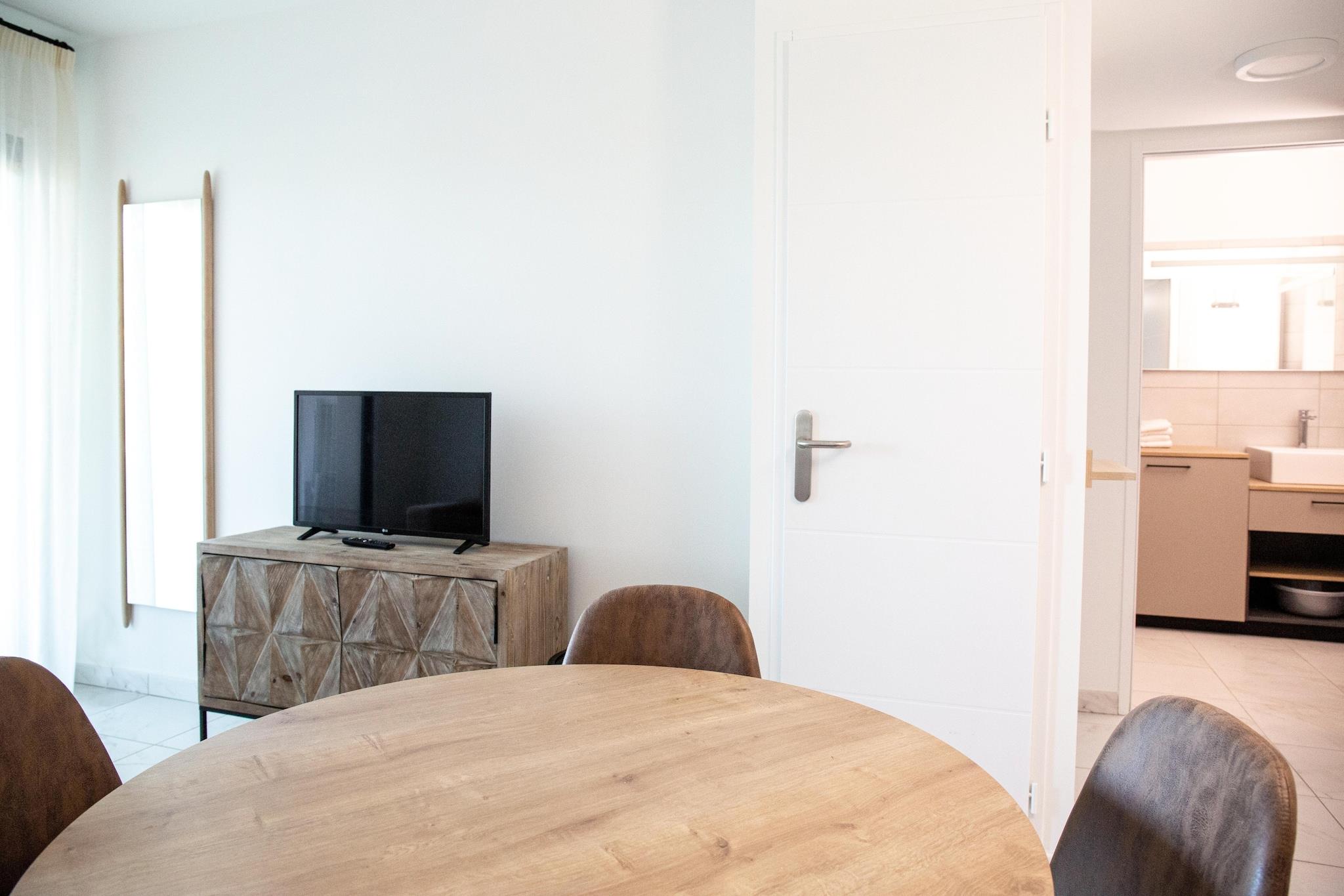 Tekøkken(elkedel, brødrister, kaffemaskine, espressomaskine, opvaskemaskine ), stue / spisestue(dobbeltsovesofa, Fjernsyn(Internationale TV-kanaler)), soveværelse(dobbeltseng eller 2 enkeltsenge Senge), badeværelse(bruser, føntørrer), toilet, sauna(deles med andre gæster), vaskemaskine, balkon, klimaanlæg, swimmingpool(deles med andre gæster, opened from 1/2 Apr upto and including Sep), petanquebane(deles med andre gæster), bordtennisbord(deles med andre gæster)