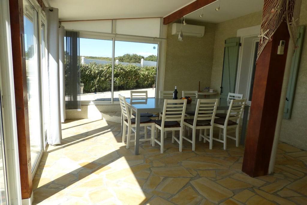 Sie wohnen auf 132 qm mit 4 Schlafzimmern,einem großen Wohn-/ Esszimmer und ca. 30qm ganzjährig bewohnbarem Wintergarten. Vom Wohnzimmer und Wintergarten im Erdgeschoss aus hat man einen fantastischen Blick auf das Meer, den See, das Clape-Gebirge bis hin zu den Pyrenäen. Drei Terrassen mit Gartenmöbeln, eine davon mit Pool, lassen jederzeit zwischen Sonne und Schatten wählen. Die beiden Südterrassen bieten einen herrlichen Panoramablick über See, Meer, Garrigue des Clape-Gebirges und Pyrenäen. Im Erdgeschoss befinden sich das Wohnzimmer mit 2 Klappsofas, Couchtisch und Fernseher, W-Lan sowie das Esszimmer mit Esstisch für ca. 8 Personen, der Wintergarten mit Klappsofa u. großem Esstisch für 8 bis 14 Personen, eine Einbauküche (Mikrowelle, Ceran-Kochfeld, Backofen, Kühl- und Gefrierkombination, Geschirrspüler), ein Bad mit Dusche, ein WC, 1 kleines Schlafzimmer mit Doppelbett (1,40m x 1,90m) und eine als Abstellraum dienende Garage, wo auch die Waschmaschine steht. Im Obergeschoss befinden sich drei Schlafzimmer (2 davon mit Balkon u. Meer- und Seeblick, eines mit Meerblick); zwei Zimmer beherbergen je ein Doppelbett (1,60 x 1,90; 1,60 x 2m), im dritten Schlafzimmer steht ein Etagenbett (unten Doppelbett mit 1,40m x 2m, oben Einzelbett mit 90cm x 2m). In zwei Schlafzimmern befindet sich außerdem noch je ein Sekretär. Ebenfalls im Obergeschoss liegt noch ein weiteres Badezimmer mit Badewanne und Duschtrennwand sowie Doppelwaschbecken und ein separates WC.