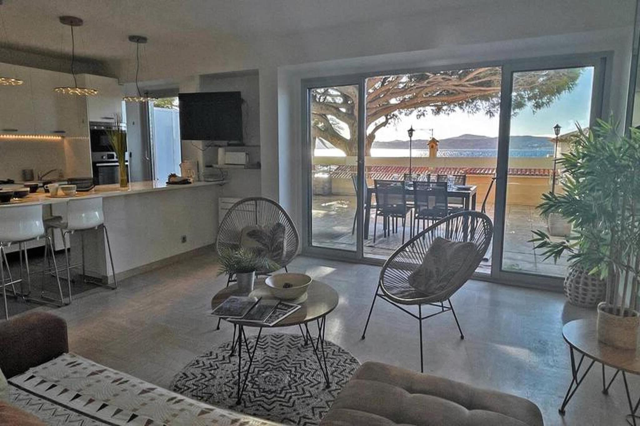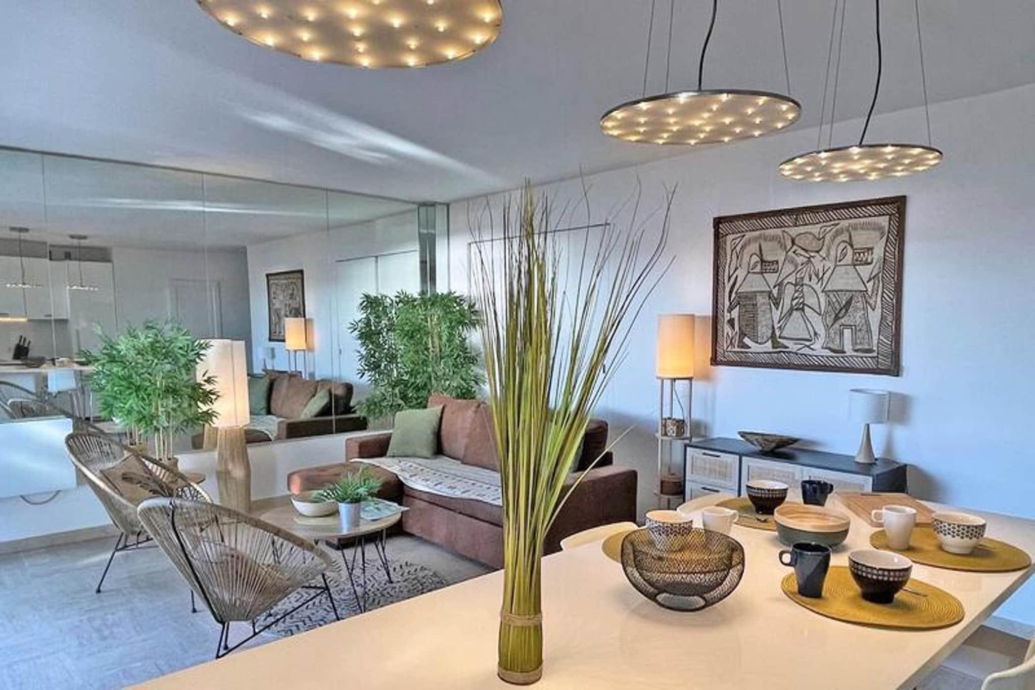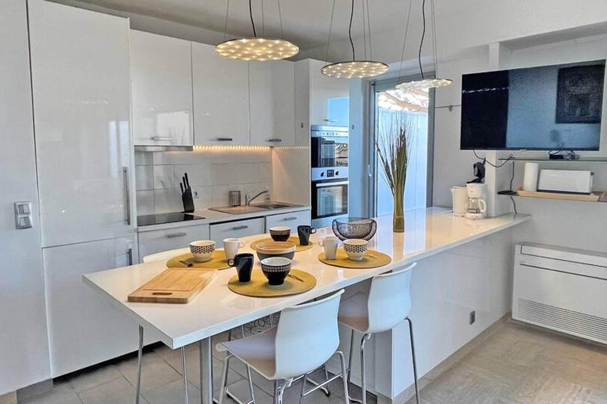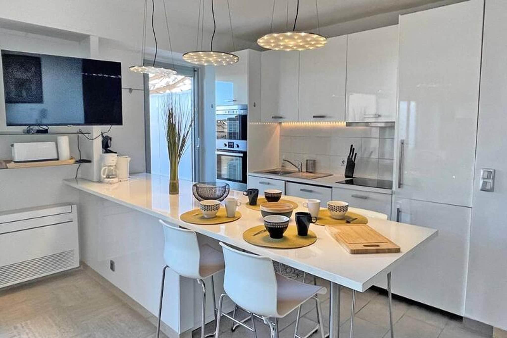 Denne elegante 3-værelses duplex lejlighed tilbyder et komfortabelt og moderne ophold for op til fem gæster. Den airconditionerede stue er udstyret med en hjørnesofa (som fungerer som en seng til en person), et fladskærms-tv og adgang til en rummelig terrasse med en fantastisk havudsigt. Det åbne køkken, komplet med spiseplads, har avancerede apparater såsom køleskab, fryser, ovn, mikroovn, 4-brænder kogeplader, opvaskemaskine, vaskemaskine og både en almindelig og Senseo kaffemaskine. Lejligheden indeholder også et separat toilet med en vaskemaskine for ekstra bekvemmelighed. Lejligheden er ideelt beliggende i hjertet af byen, kun 30 meter fra stranden og en kort gåtur fra byens centrum og nærliggende butikker. Gæsterne kan nemt få adgang til lokale attraktioner, caféer og markeder, hvilket gør det til en ideel base for dem, der ønsker at udforske området. Uanset om du slapper af ved havet eller nyder det pulserende byliv, er alt inden for rækkevidde. Lejligheden har to komfortable soveværelser på øverste etage, begge med aircondition og designet til afslapning. Det store soveværelse har en 160 cm dobbeltseng, mens det andet soveværelse byder på to enkeltsenge (som kan kombineres til en dobbeltseng). Den store private terrasse (45m²) er perfekt til udendørs spisning og afslapning. Andre faciliteter inkluderer en privat garage i det sikre underjordiske parkeringsområde, Wi-Fi til fjernarbejde og aircondition overalt. Kæledyr er velkomne efter anmodning mod et mindre tillægsgebyr.