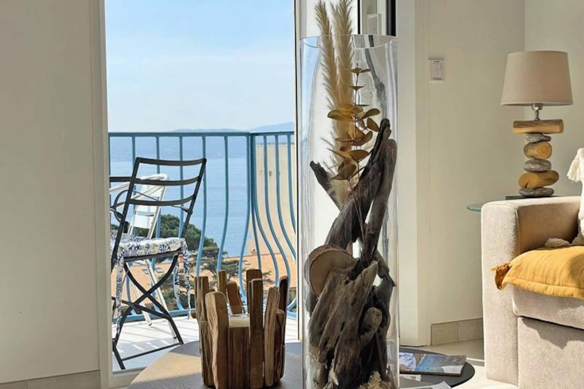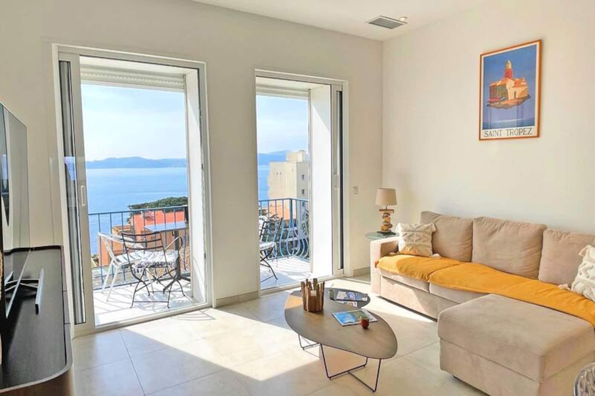 Denne smukt renoverede 3-værelses lejlighed er et ideelt tilflugtssted for op til fem gæster, der tilbyder moderne bekvemmeligheder og en fantastisk udsigt over Saint Tropez-bugten. Beliggende på 4. etage med elevator adgang, det har værelser med aircondition med 160 cm dobbeltsenge, indbyggede skabe, tv'er og en-suite badeværelser med bruser og håndklædetørrer. Opholdsstuen omfatter en sovesofa, tv og en 6 m² stor balkon, perfekt til at nyde al fresco-måltider eller det naturskønne panorama. Med privat sikret parkering og en politik uden kæledyr sikrer ejendommen et fredeligt og bekvemt ophold. Ideelt beliggende i hjertet af Sainte-Maxime, er lejligheden kun 125 meter fra stranden og 200 meter fra den travle bymidte. Gæsterne kan nemt udforske charmerende caféer, lokale butikker og pulserende markeder. Nyd naturskønne gåture ved vandet eller nyd lokale retter på nærliggende restauranter, alle inden for gåafstand fra ejendommen. Denne centrale beliggenhed gør det til et fremragende valg for dem, der ønsker at opleve det bedste fra byen. Lejligheden er designet til komfort og praktisk og har et fuldt udstyret køkken med hvidevarer såsom køleskab, ovn, mikroovn, opvaskemaskine og kaffemaskine. Yderligere faciliteter inkluderer et separat toilet, vaskerum med vaskemaskine og tørretumbler, WiFi og elektriske rulleskodder. Uanset om du slapper af indendørs eller nyder udsigten fra balkonen, tilbyder denne lejlighed alt hvad du behøver for et mindeværdigt ophold.